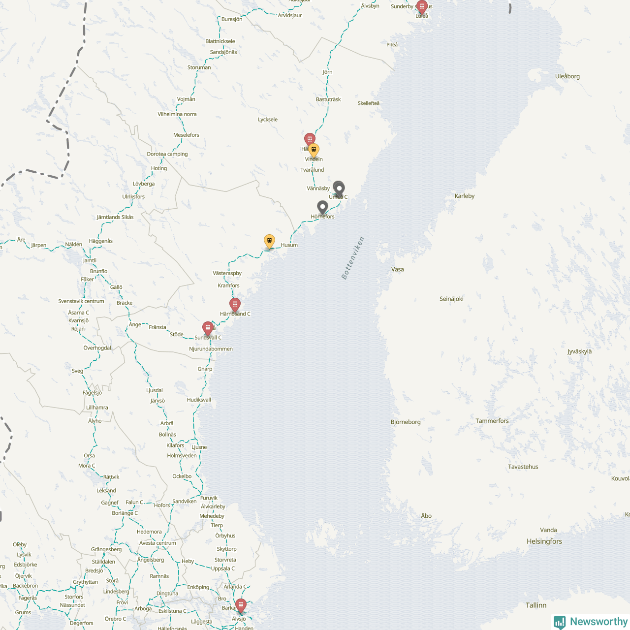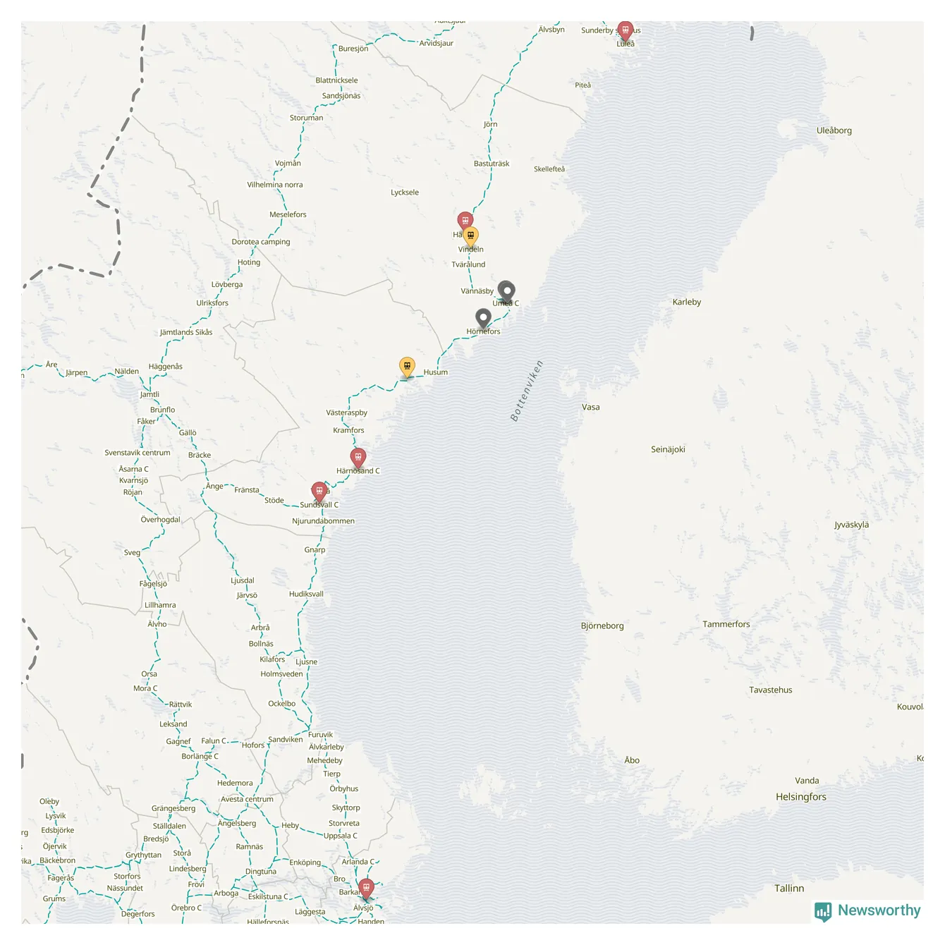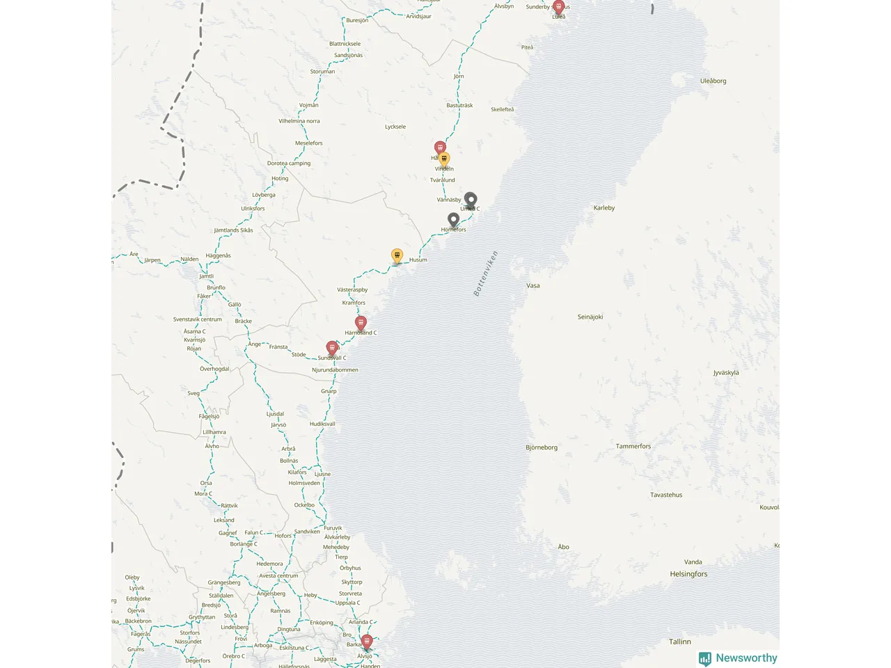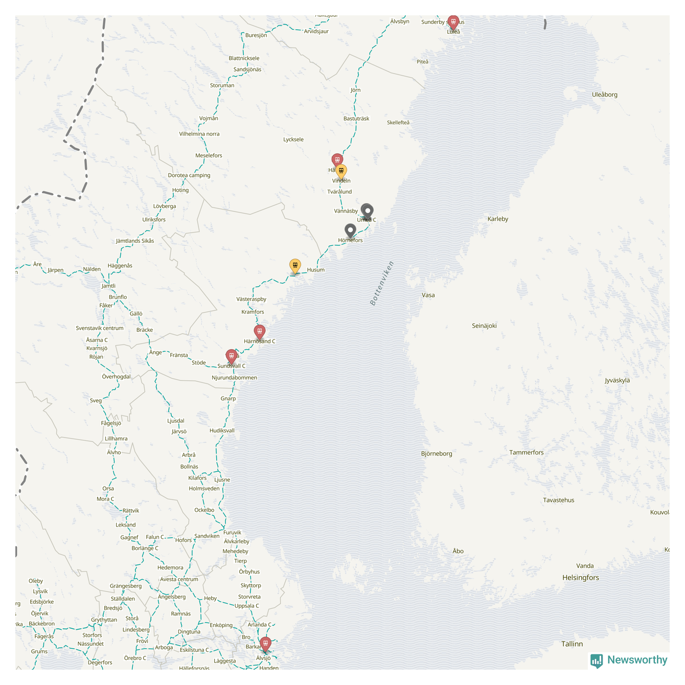 Kartdata från Mapbox, Newsworthy, OpenStreetMap och Trafikverket. Uppgifter om sträckor med passagerartrafik från jarnvag.net.