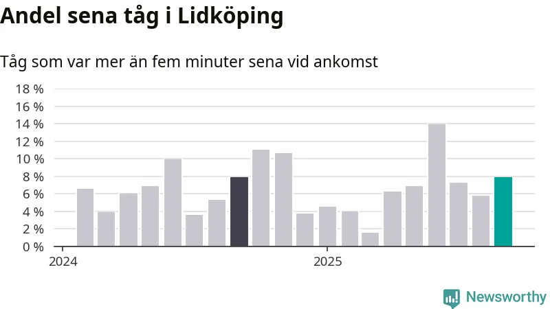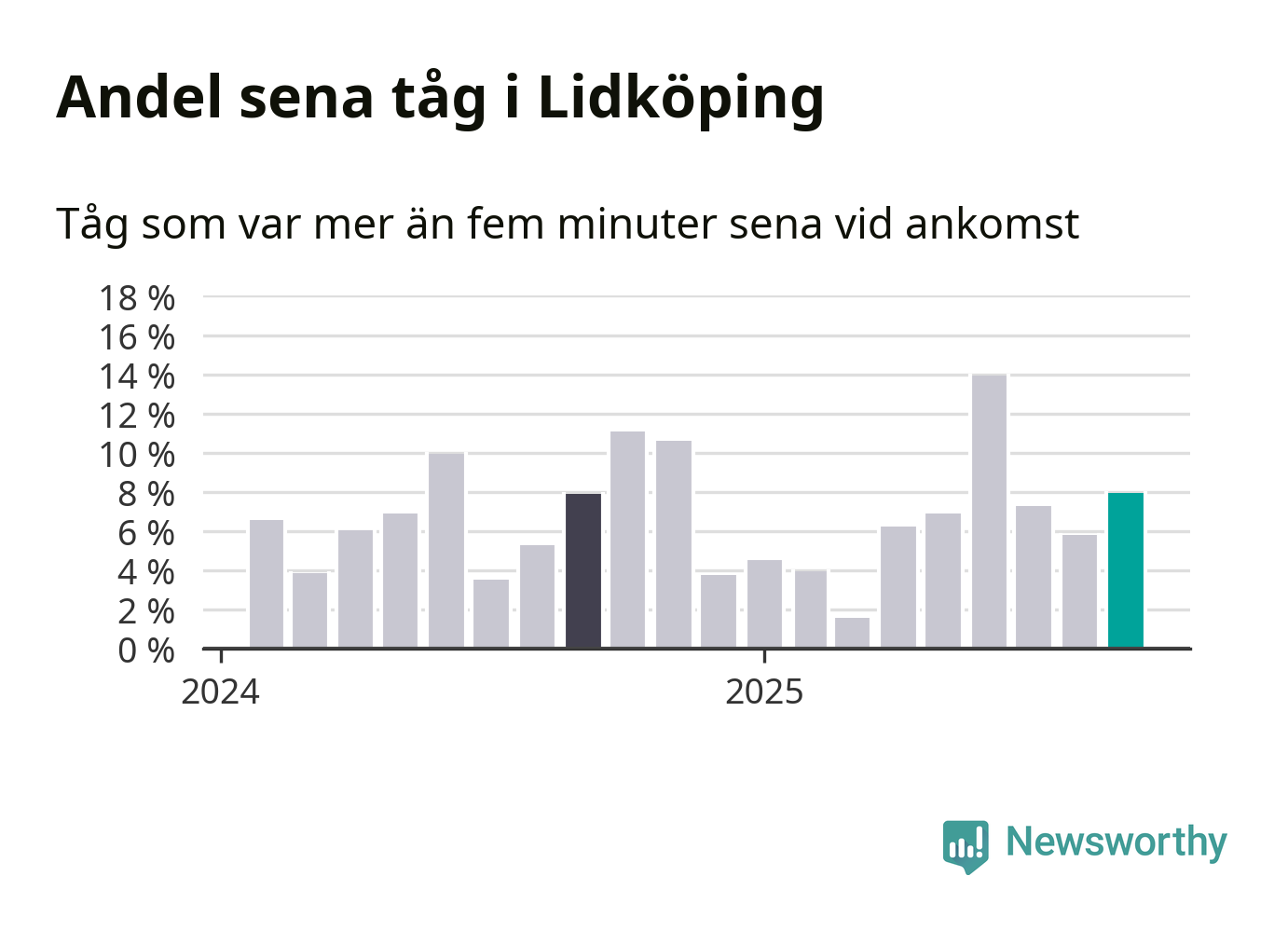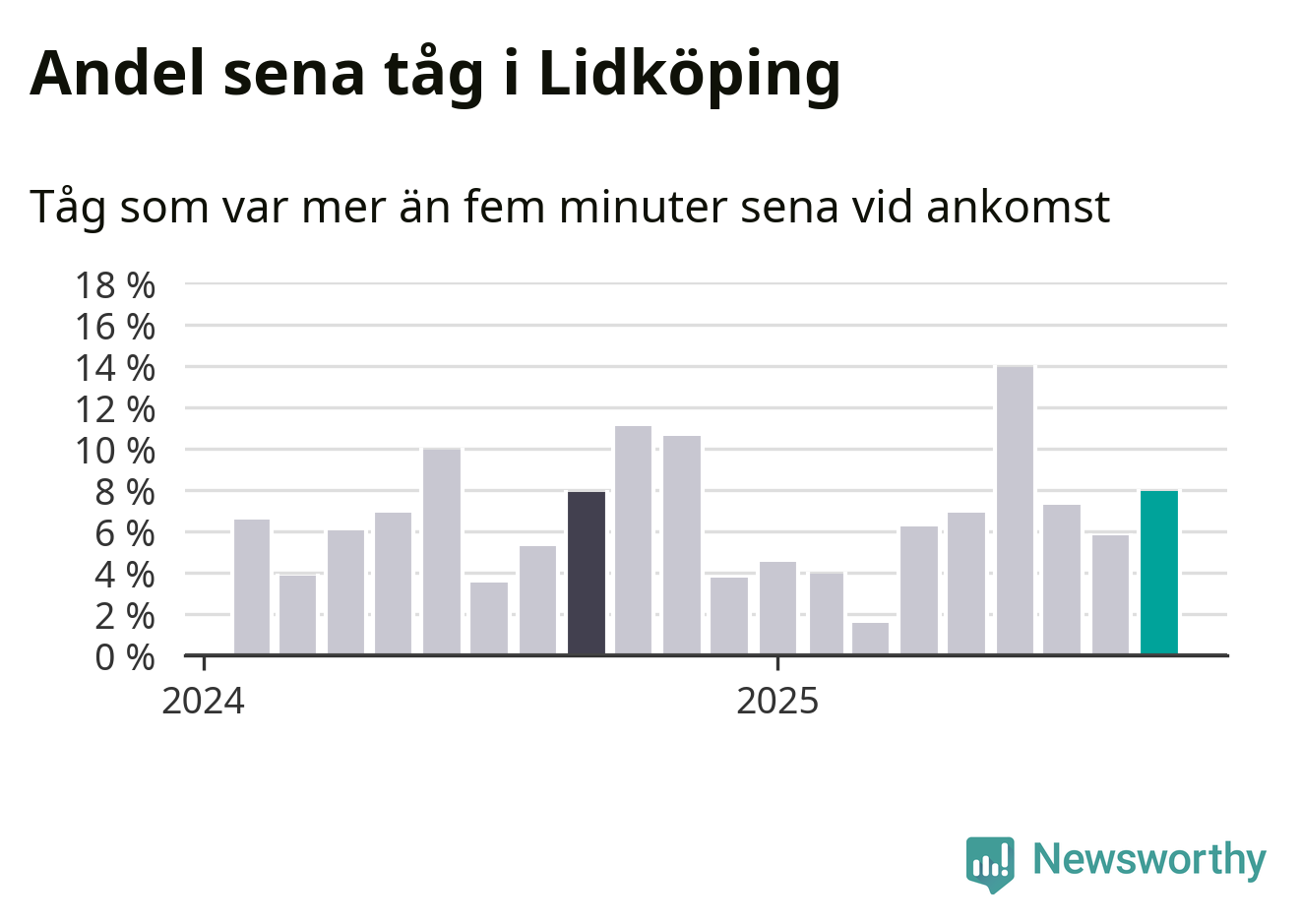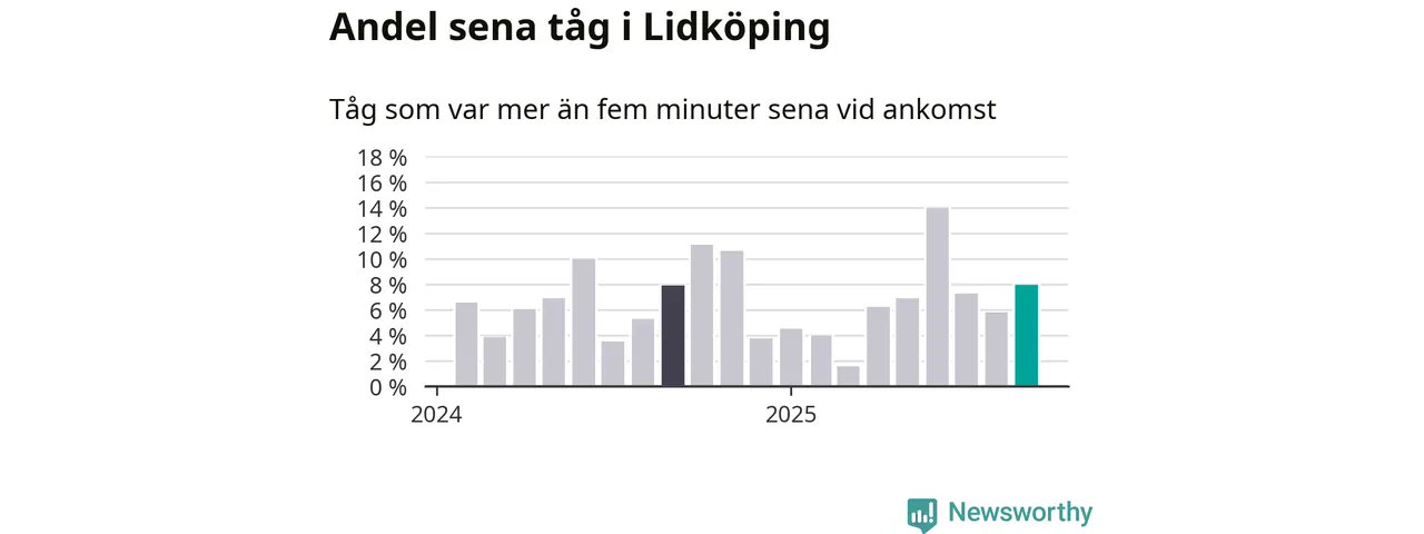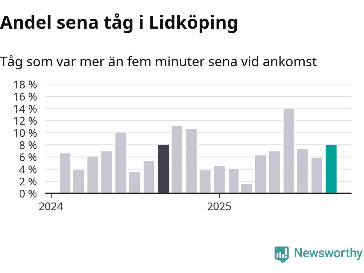 Åtta procent kan jämföras med sex procent månaden innan, och åtta procent i september 2024. Siffrorna bygger på realtidsinformation om tågavgångar och ankomster från Trafikverket, som Newsworthy löpande samlar in.