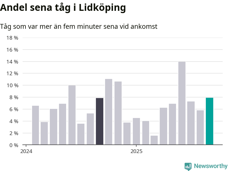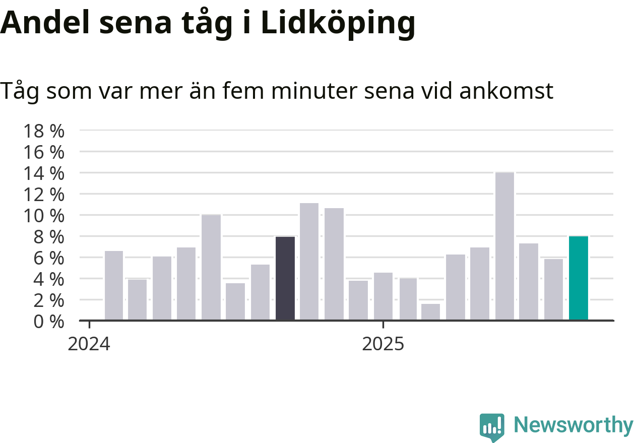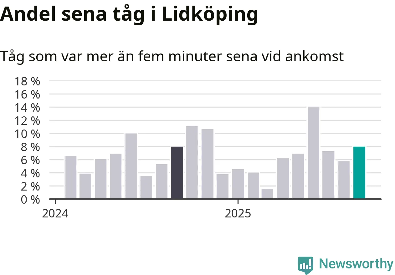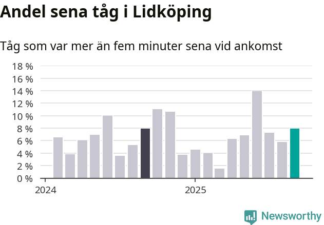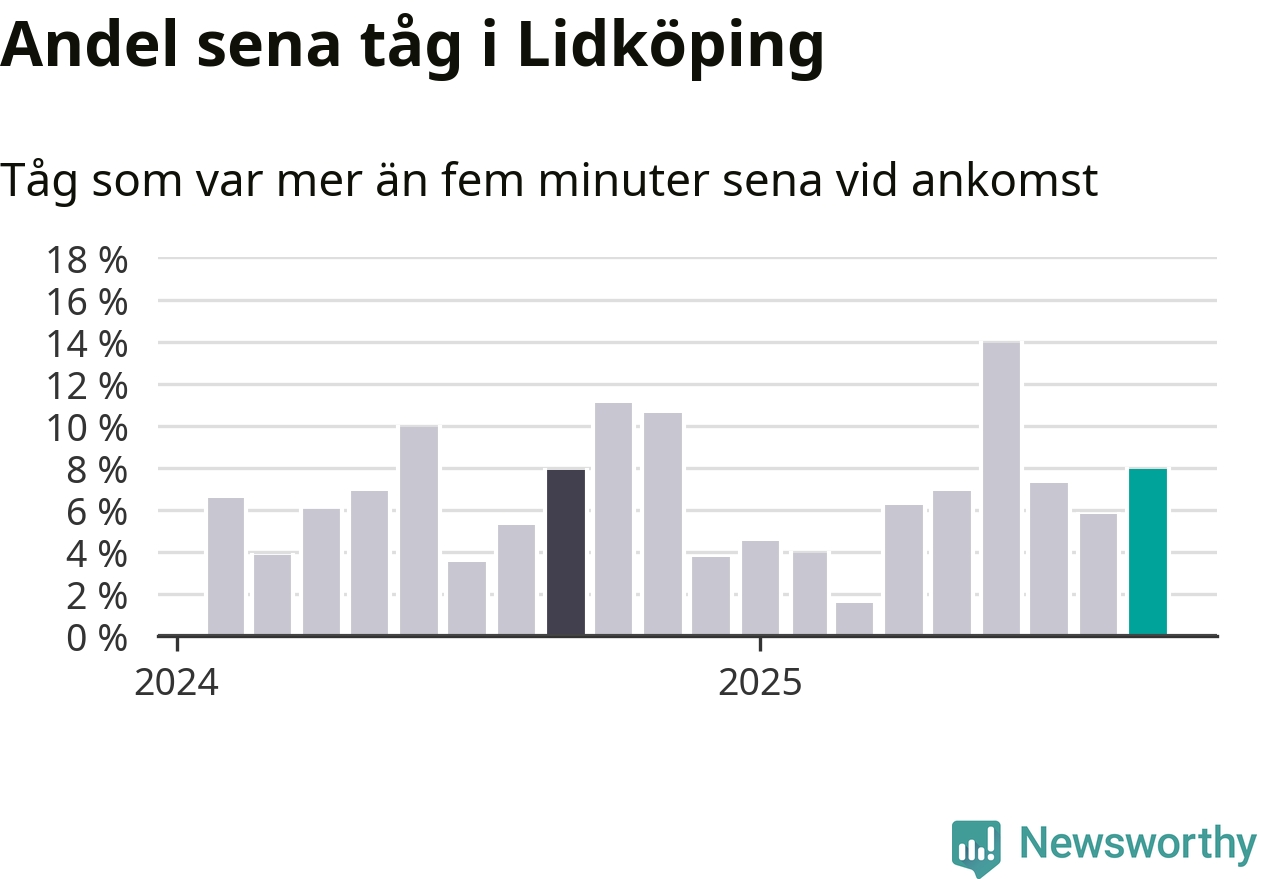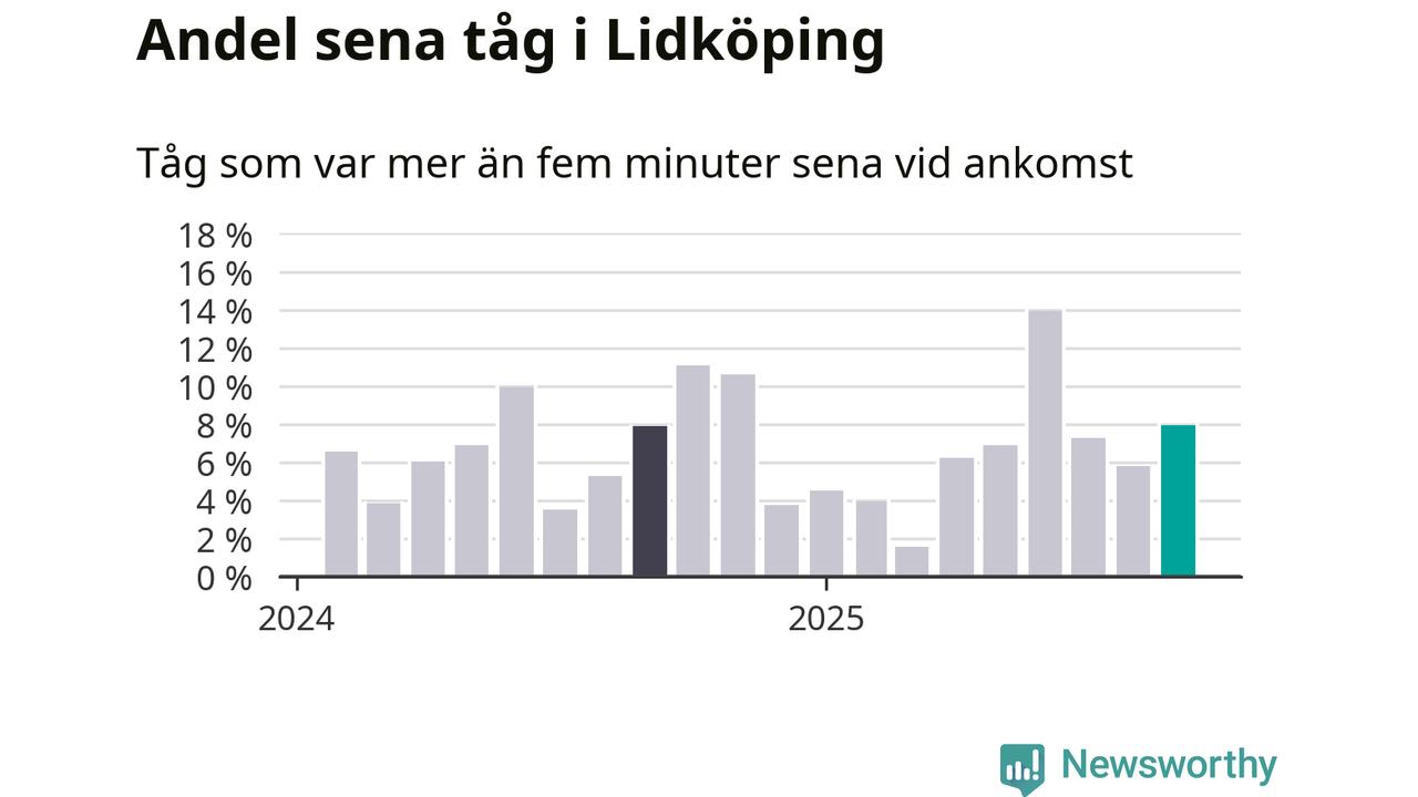 Åtta procent kan jämföras med sex procent månaden innan, och åtta procent i september 2024. Siffrorna bygger på realtidsinformation om tågavgångar och ankomster från Trafikverket, som Newsworthy löpande samlar in.