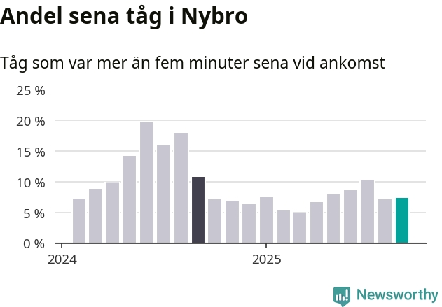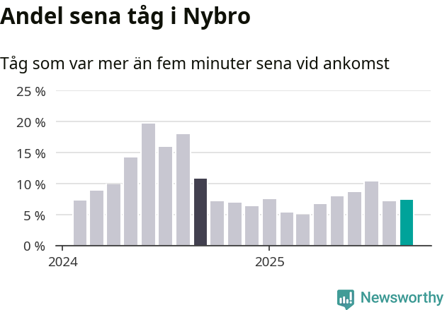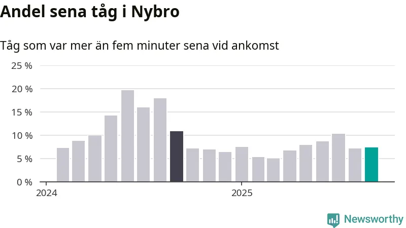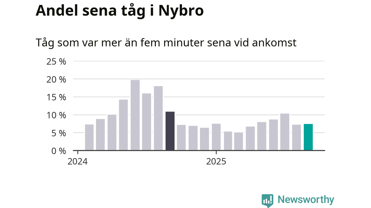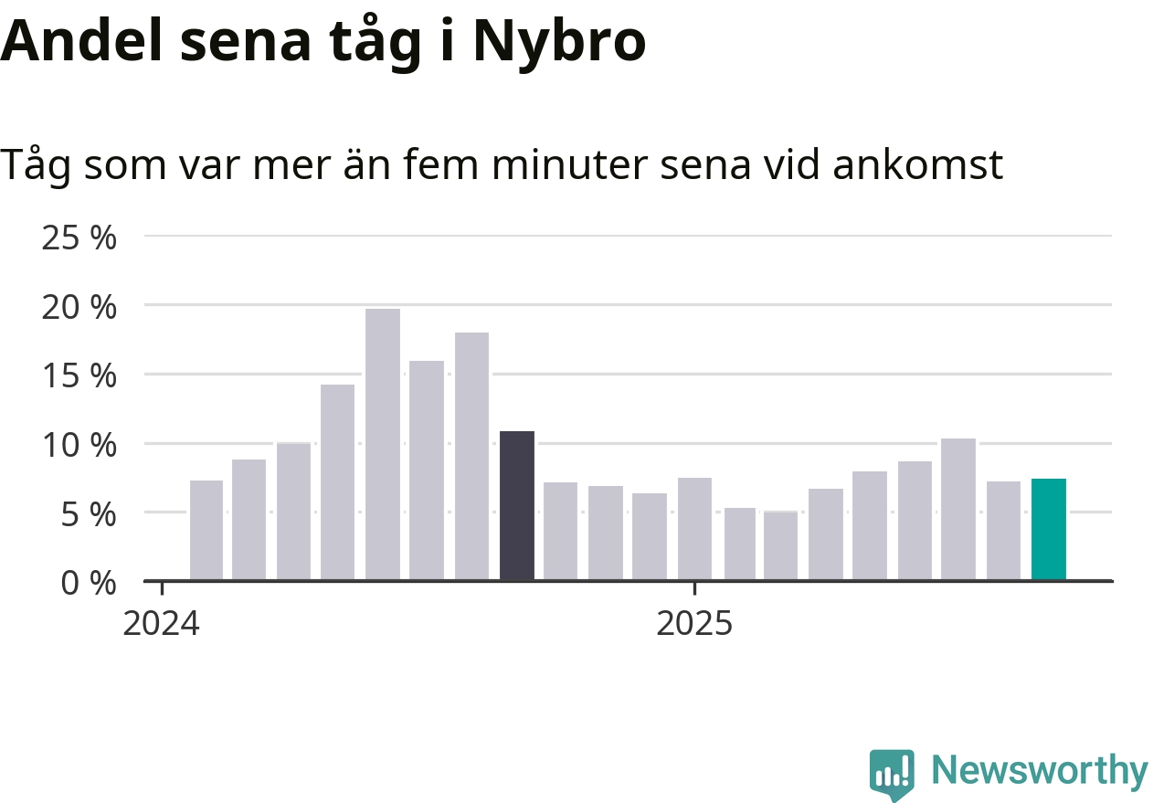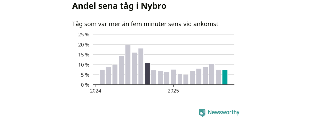 Sju procent är marginellt mer än månaden innan, och kan jämföras med elva procent i september 2024. Siffrorna bygger på realtidsinformation om tågavgångar och ankomster från Trafikverket, som Newsworthy löpande samlar in.