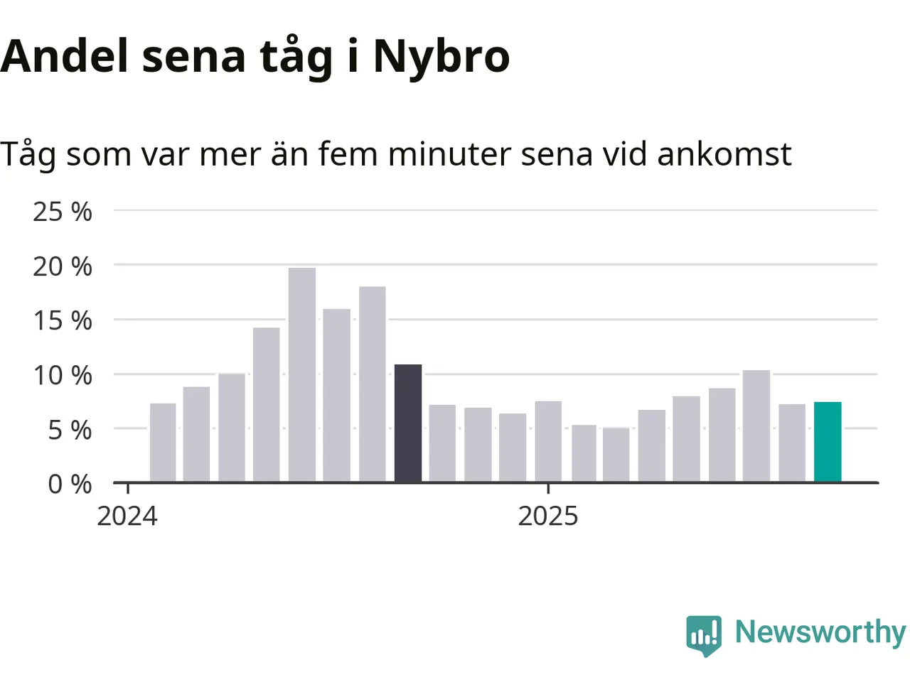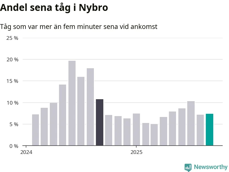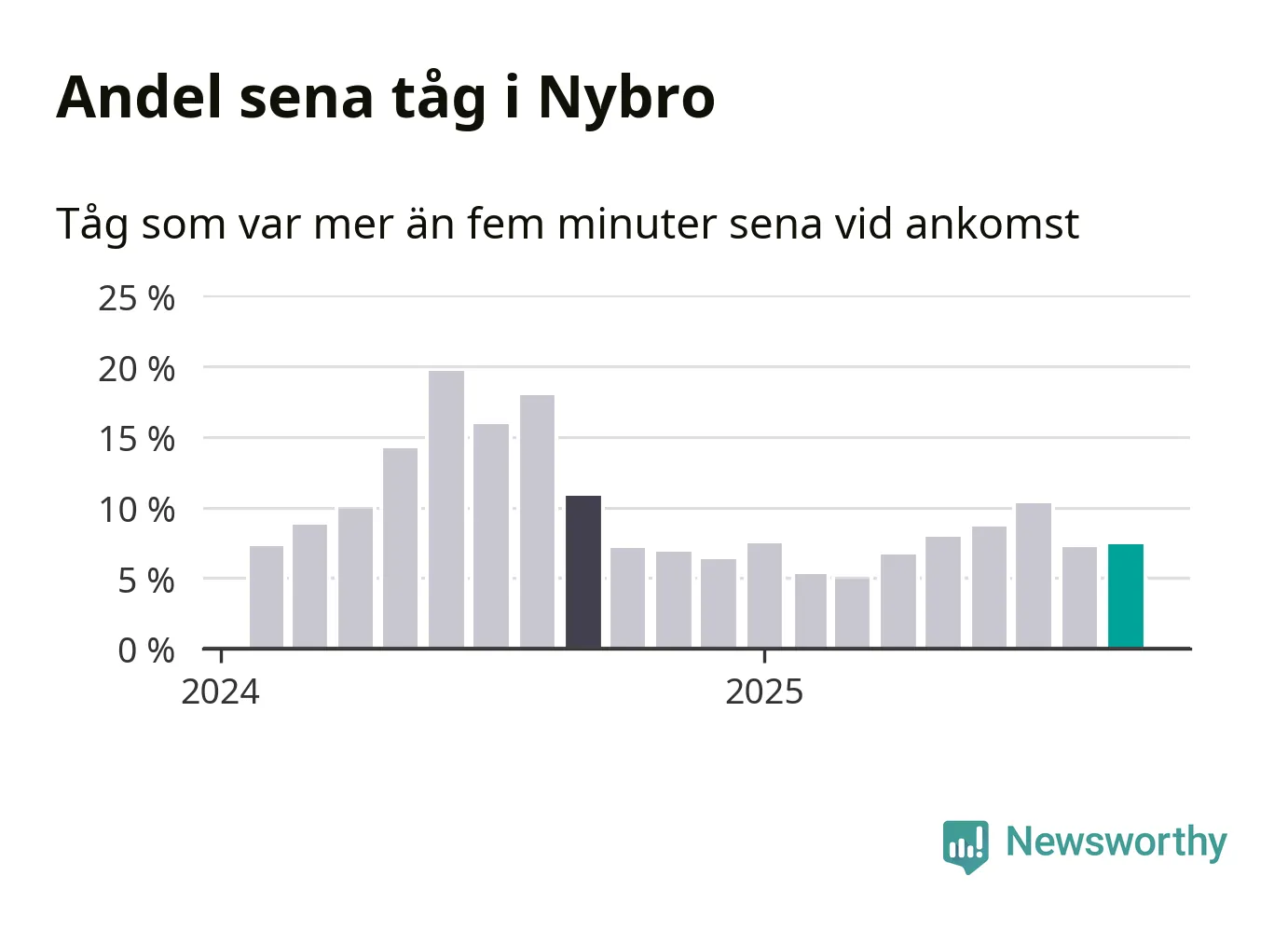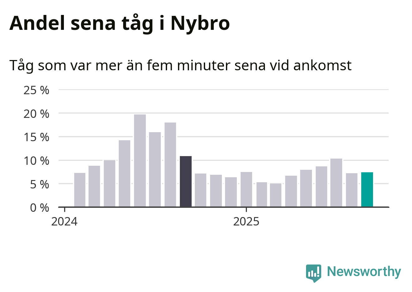 Sju procent är marginellt mer än månaden innan, och kan jämföras med elva procent i september 2024. Siffrorna bygger på realtidsinformation om tågavgångar och ankomster från Trafikverket, som Newsworthy löpande samlar in.