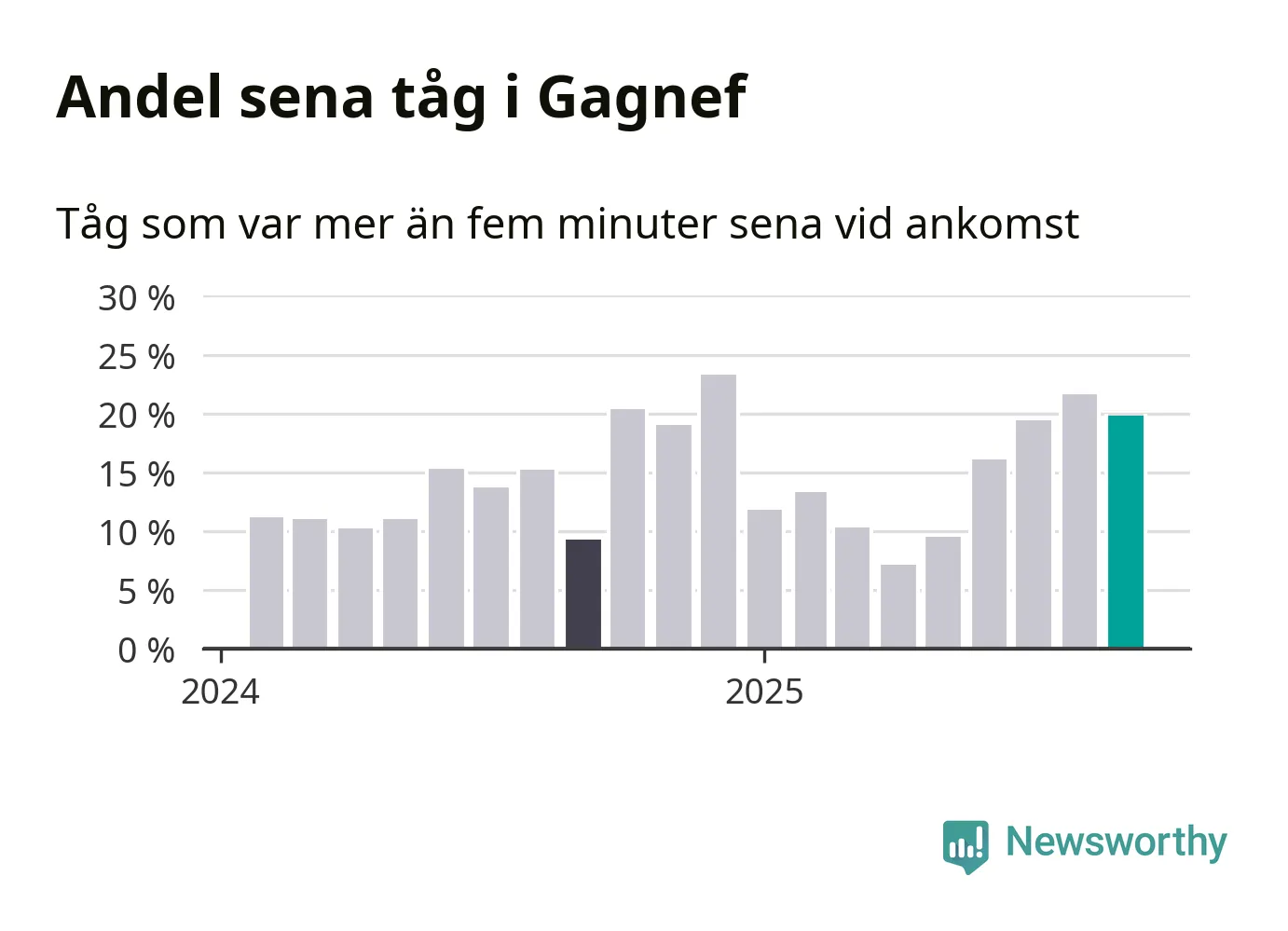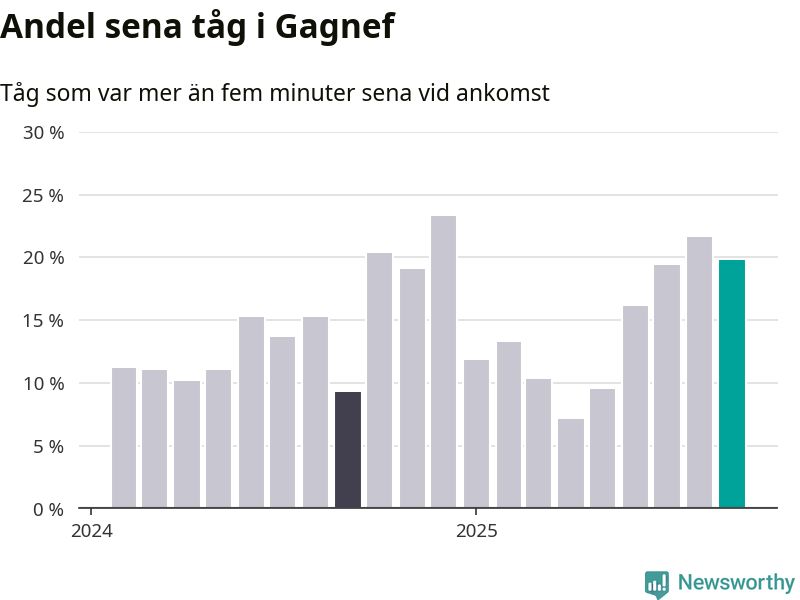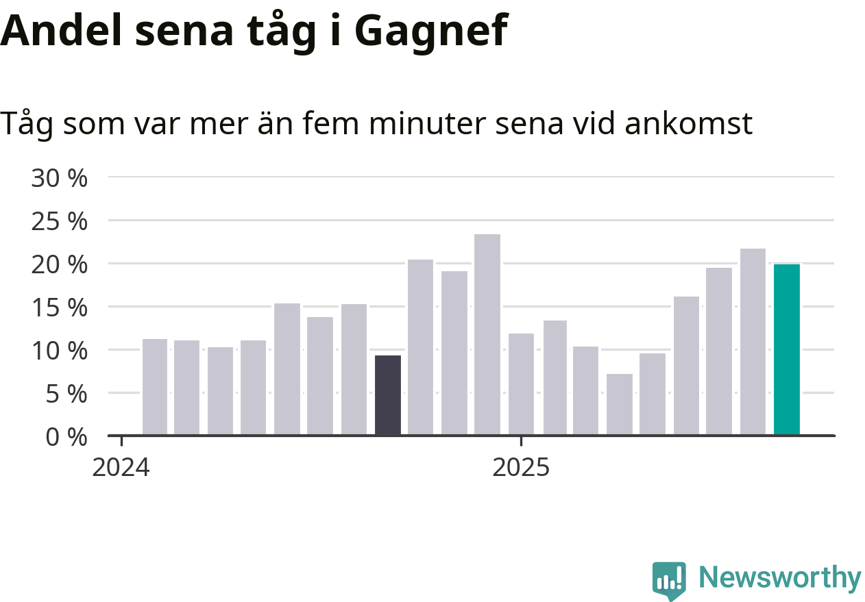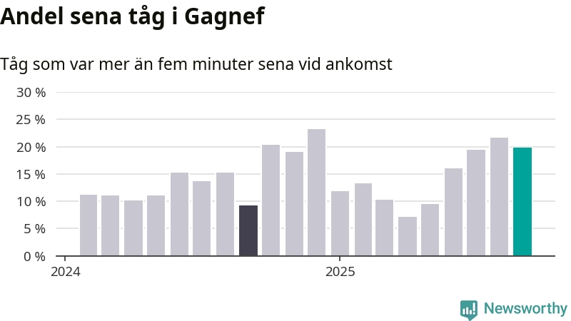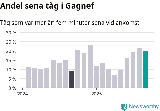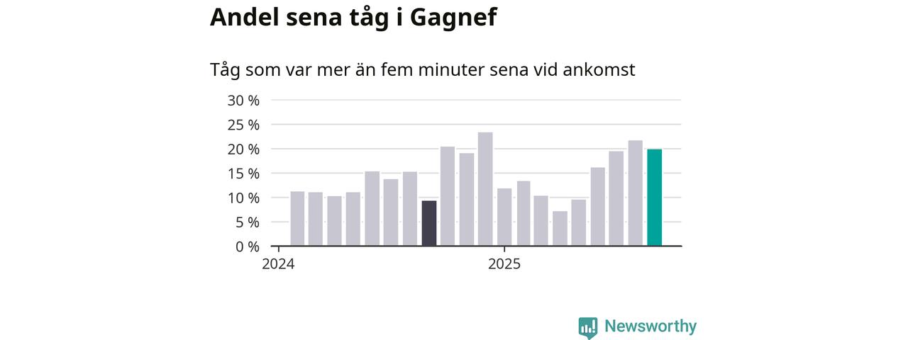 20 procent kan jämföras med 22 procent månaden innan, och nio procent i september 2024. Siffrorna bygger på realtidsinformation om tågavgångar och ankomster från Trafikverket, som Newsworthy löpande samlar in.