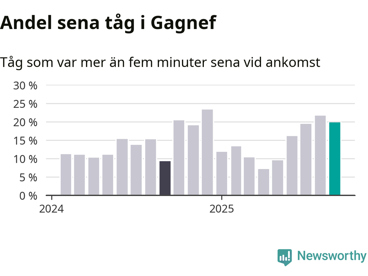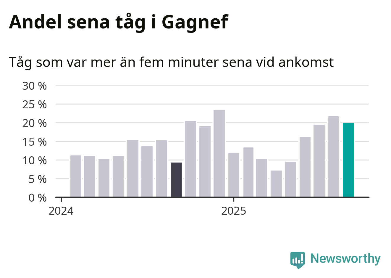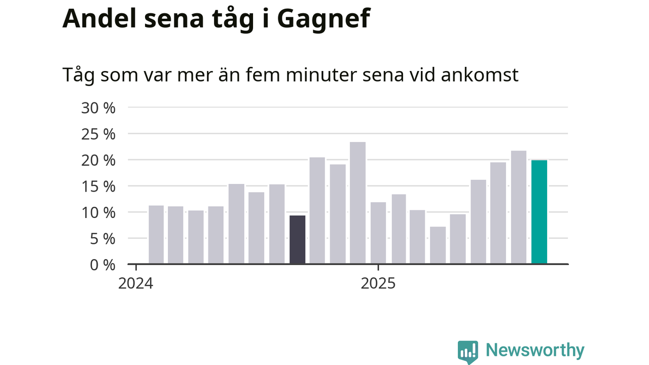 20 procent kan jämföras med 22 procent månaden innan, och nio procent i september 2024. Siffrorna bygger på realtidsinformation om tågavgångar och ankomster från Trafikverket, som Newsworthy löpande samlar in.