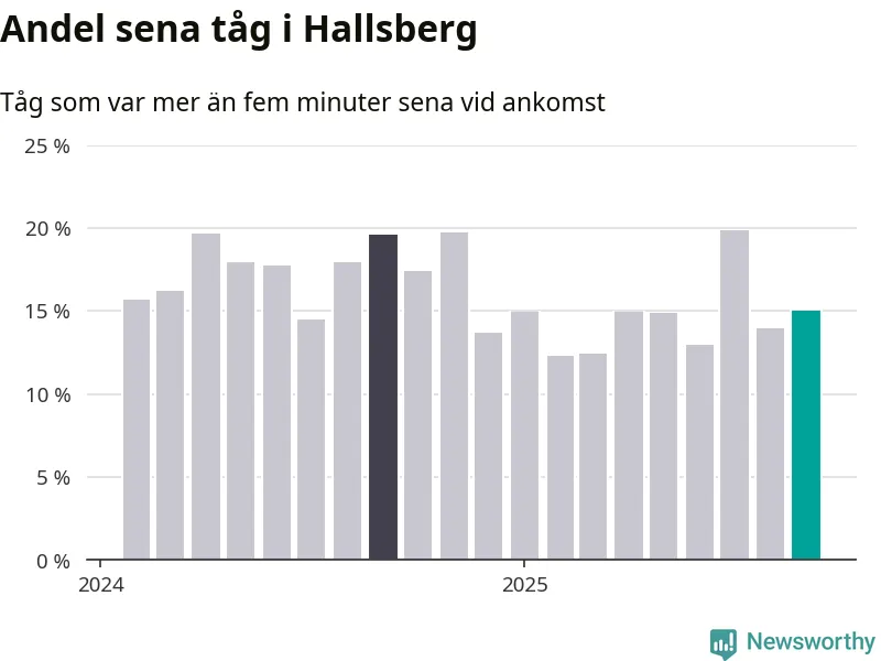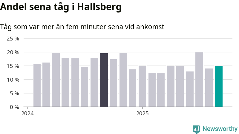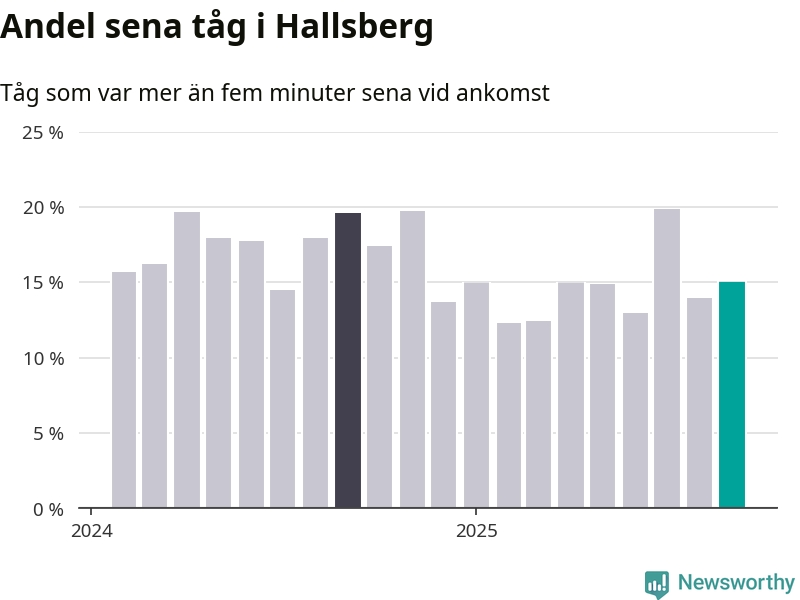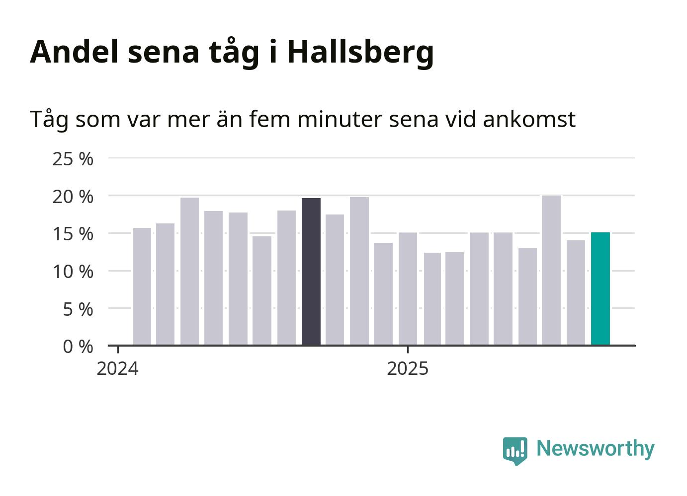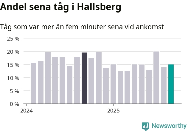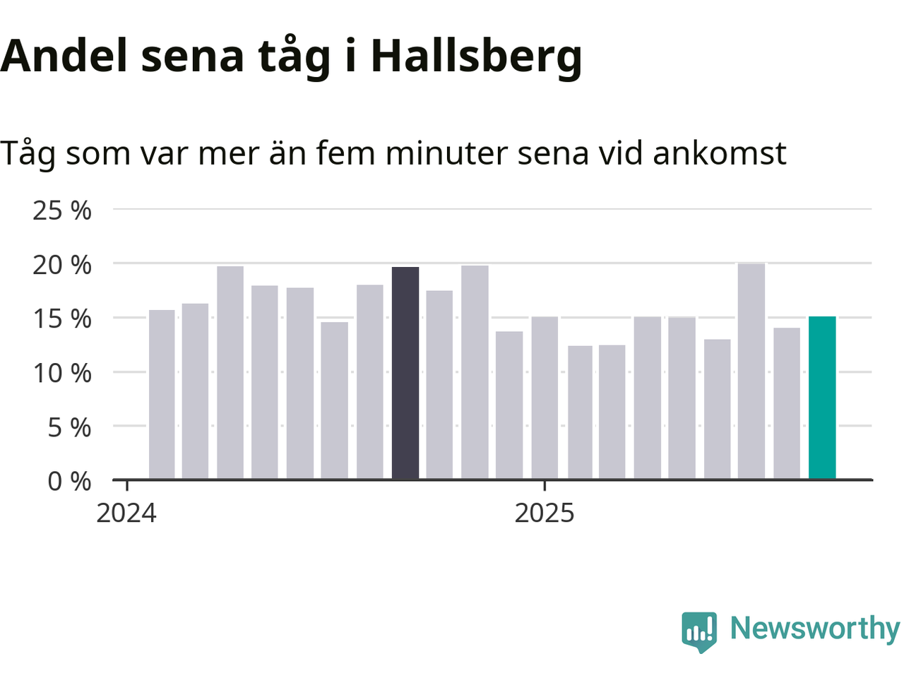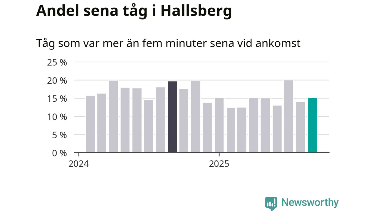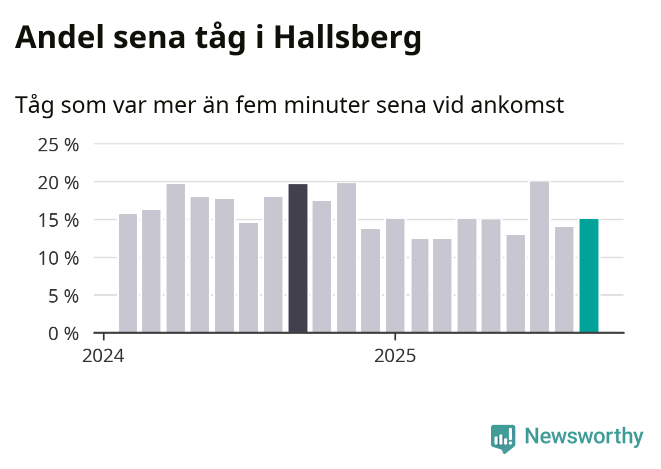 15 procent kan jämföras med 14 procent månaden innan, och 20 procent i september 2024. Siffrorna bygger på realtidsinformation om tågavgångar och ankomster från Trafikverket, som Newsworthy löpande samlar in.