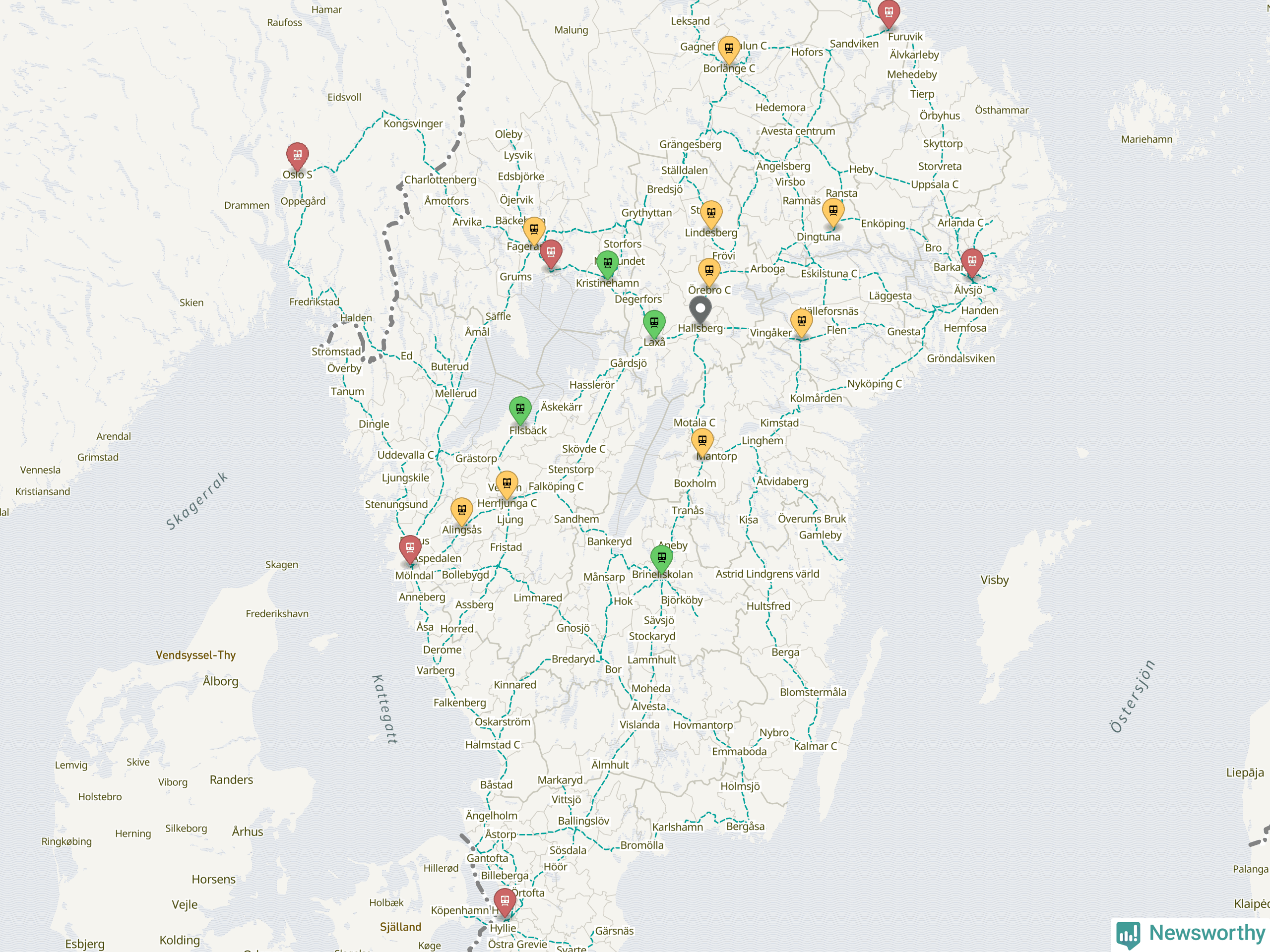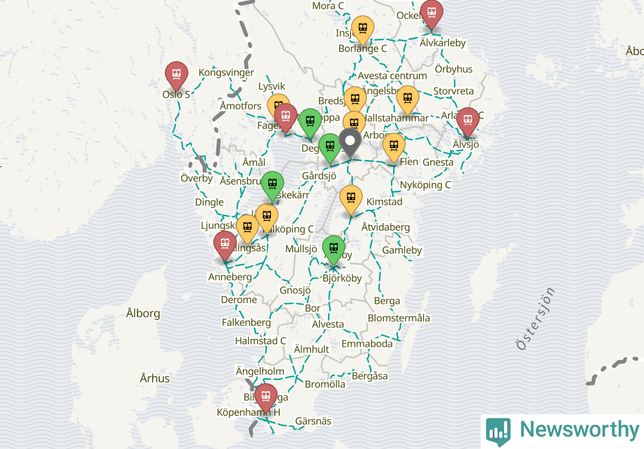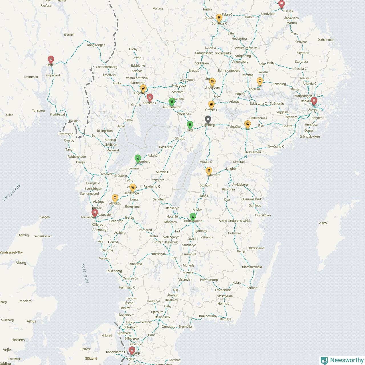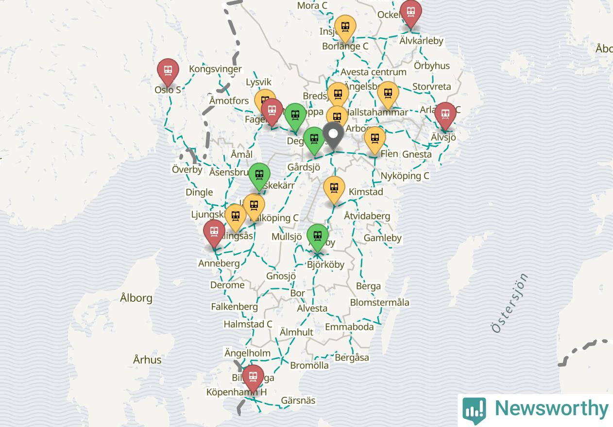 Kartdata från Mapbox, Newsworthy, OpenStreetMap och Trafikverket. Uppgifter om sträckor med passagerartrafik från jarnvag.net.