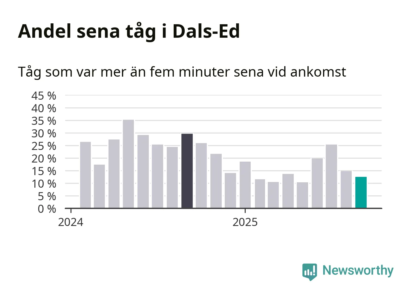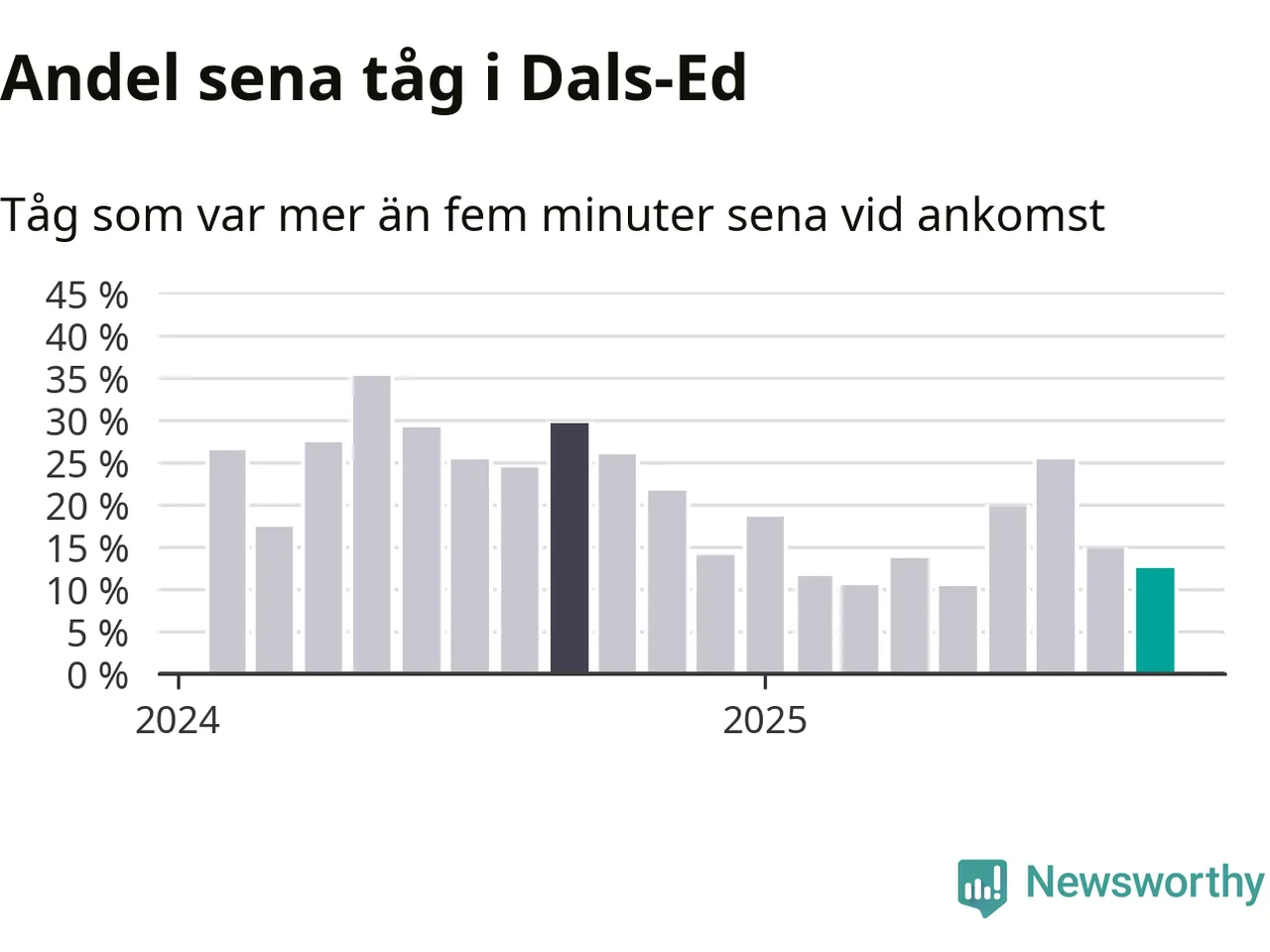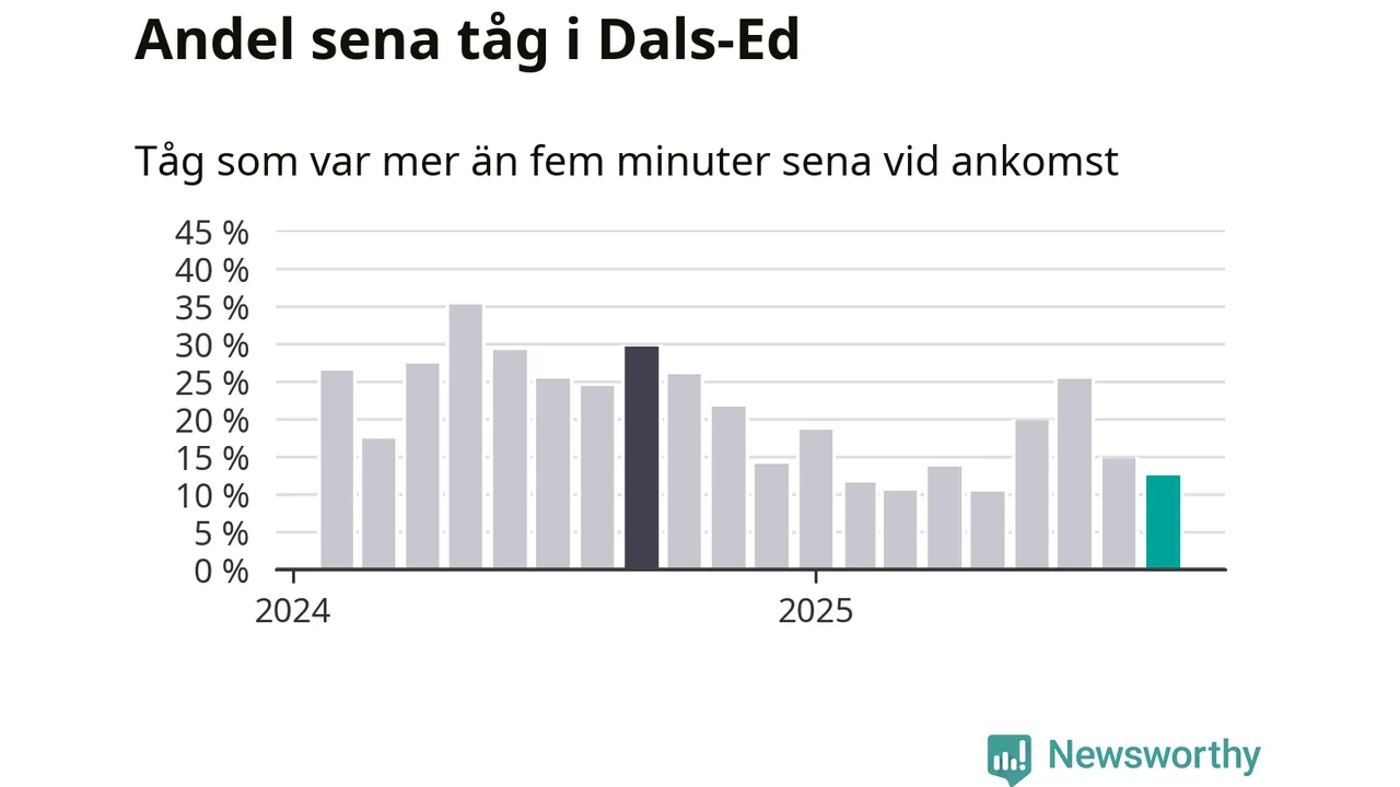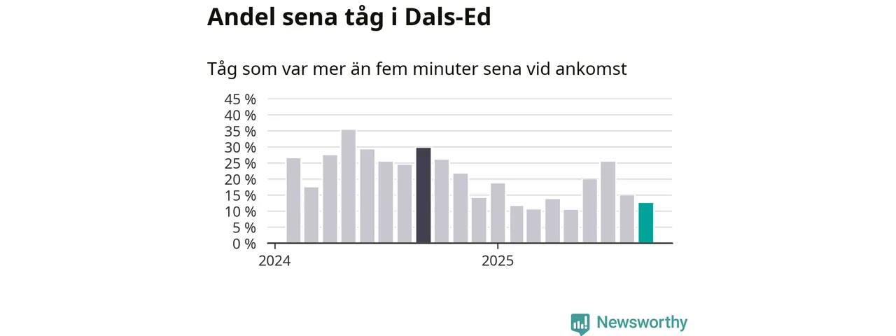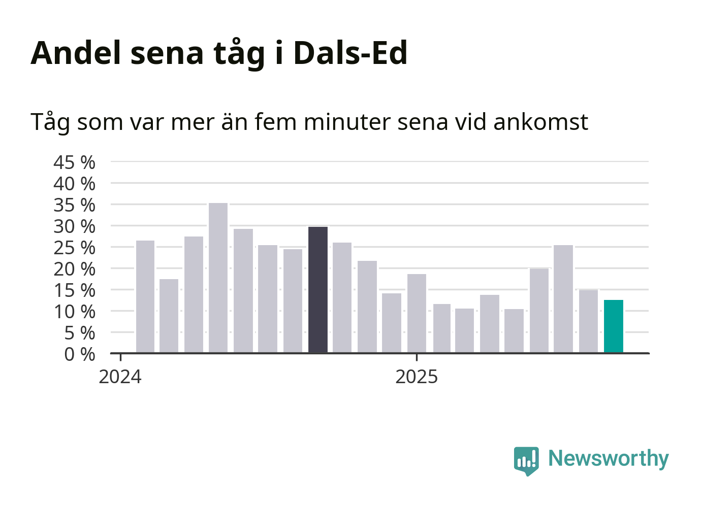Tolv procent kan jämföras med 15 procent månaden innan, och 30 procent i september 2024. Siffrorna bygger på realtidsinformation om tågavgångar och ankomster från Trafikverket, som Newsworthy löpande samlar in.