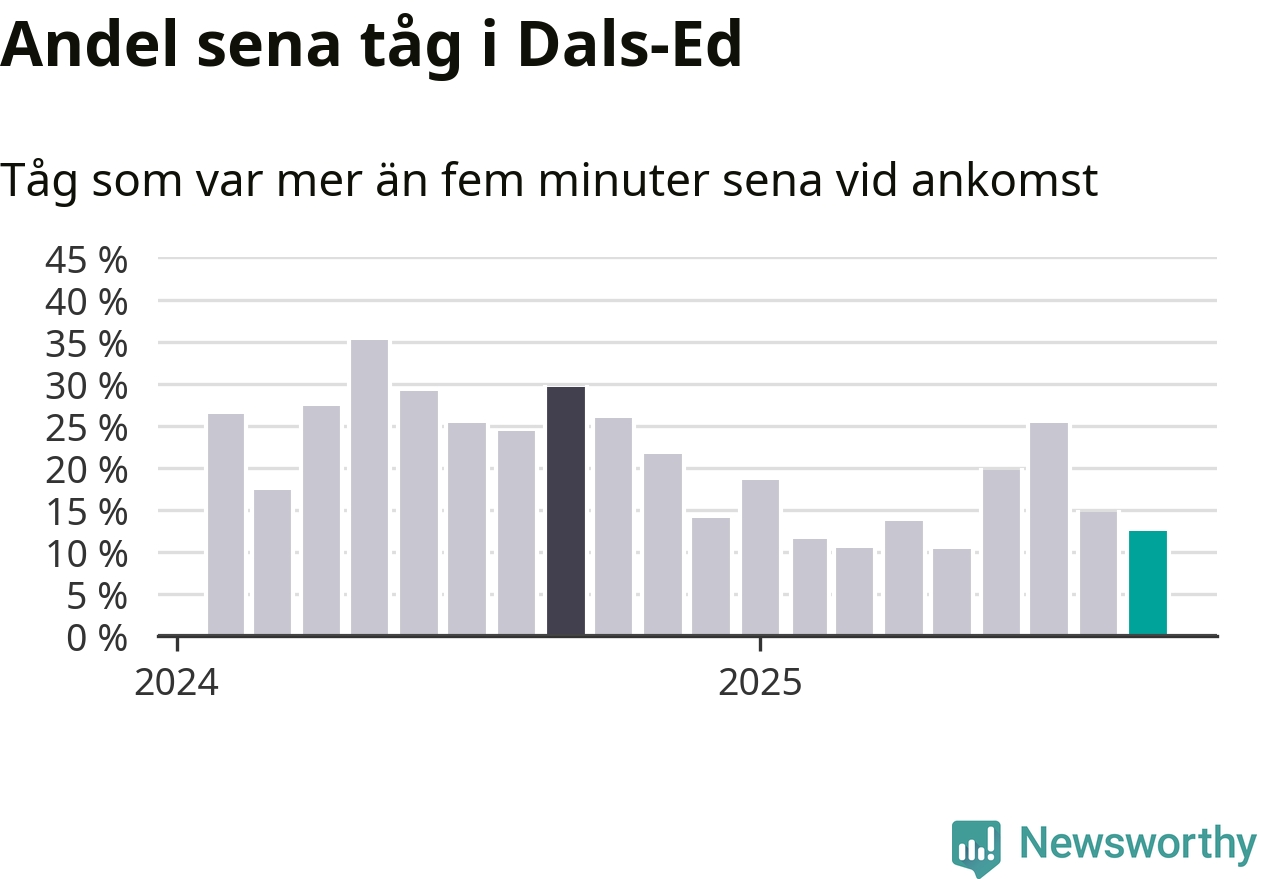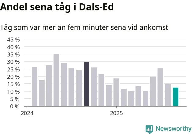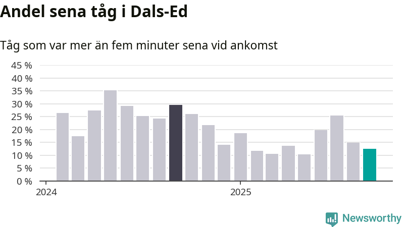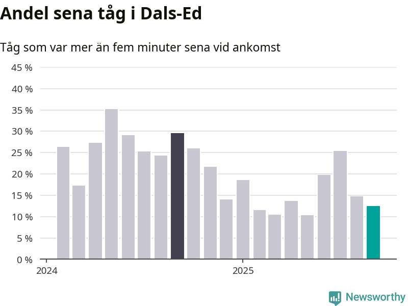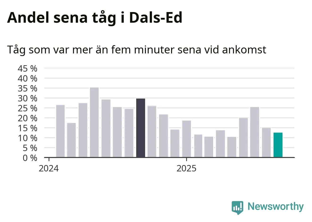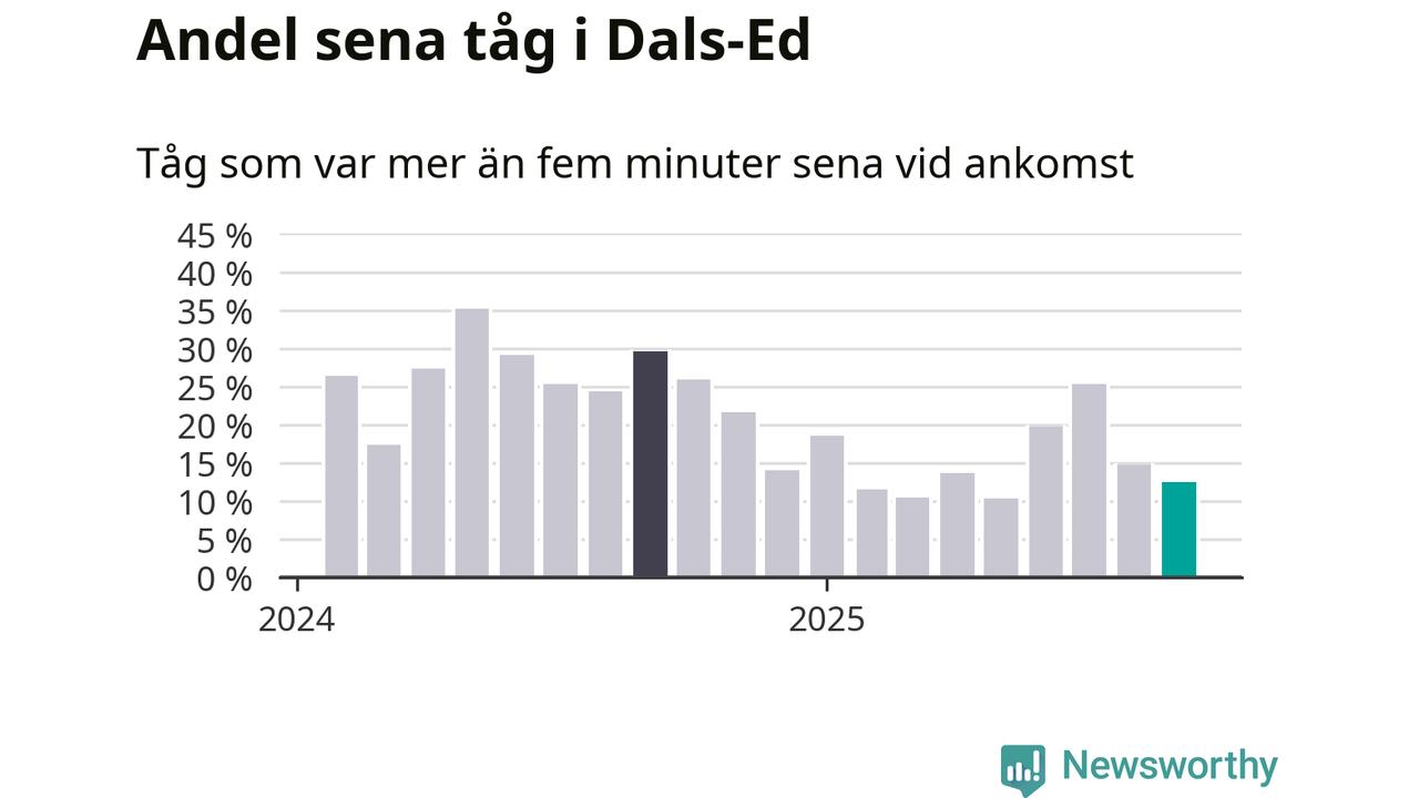 Tolv procent kan jämföras med 15 procent månaden innan, och 30 procent i september 2024. Siffrorna bygger på realtidsinformation om tågavgångar och ankomster från Trafikverket, som Newsworthy löpande samlar in.