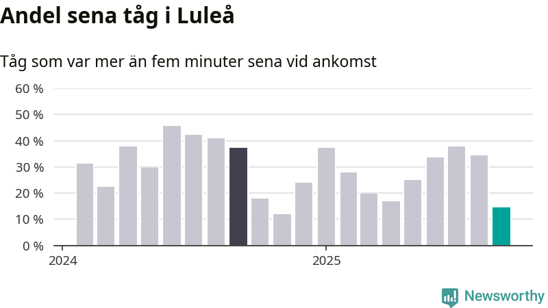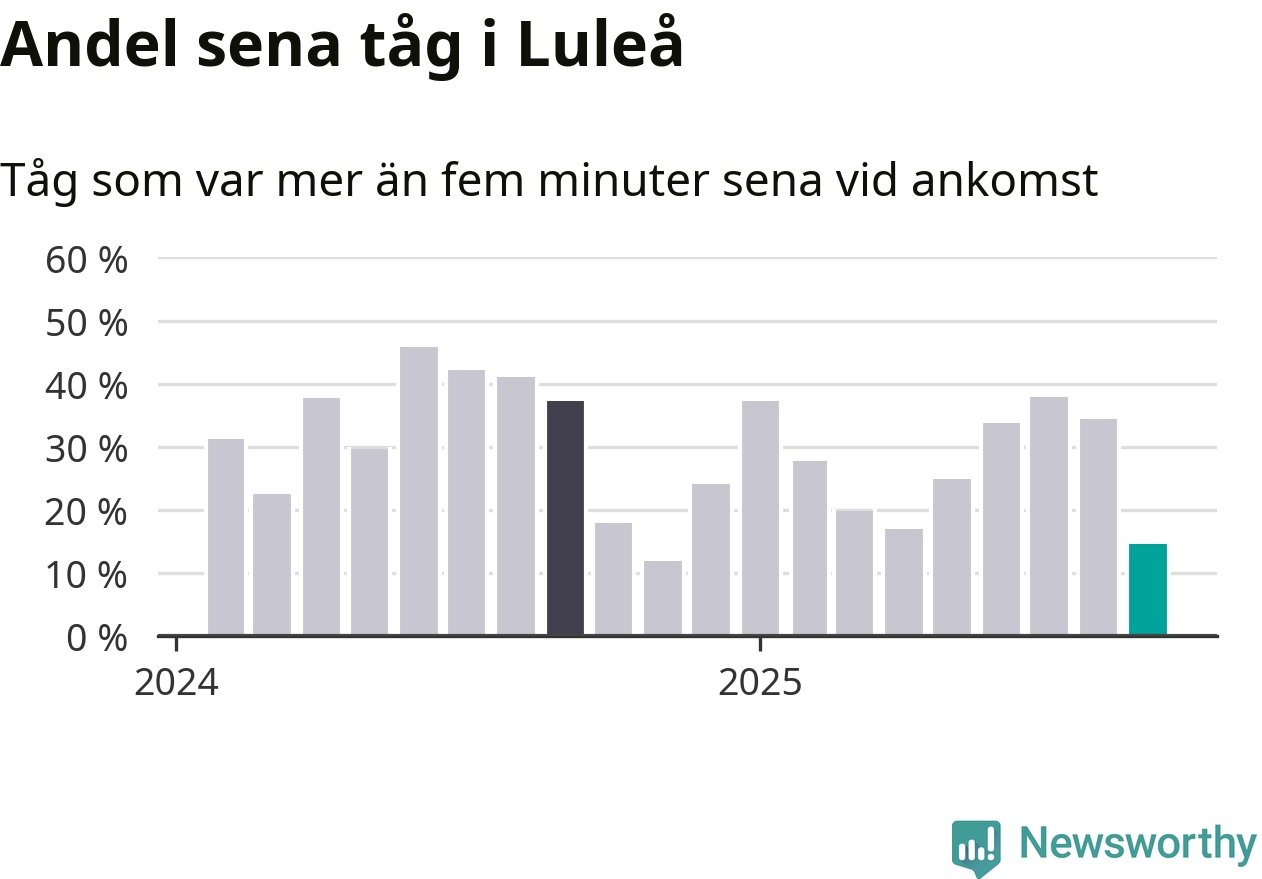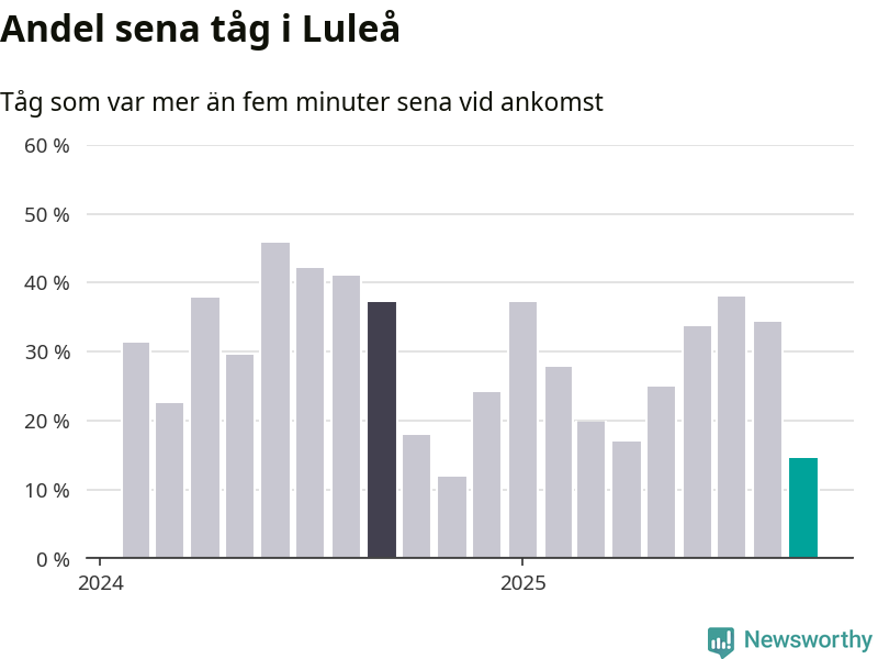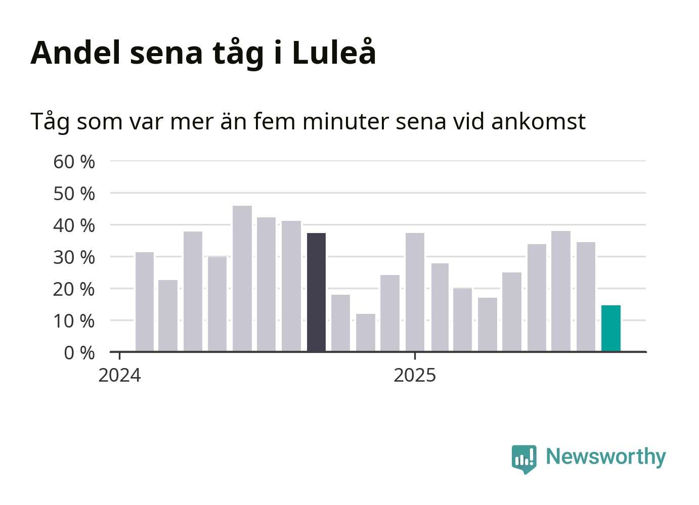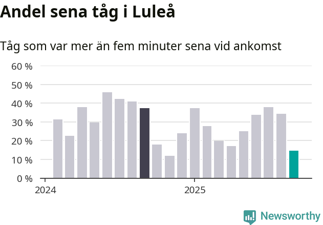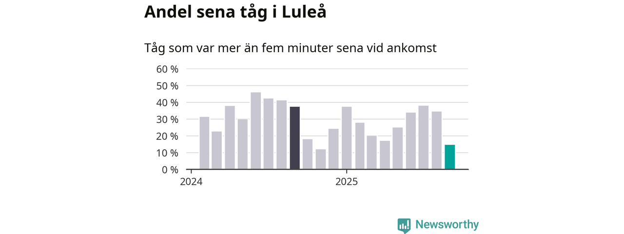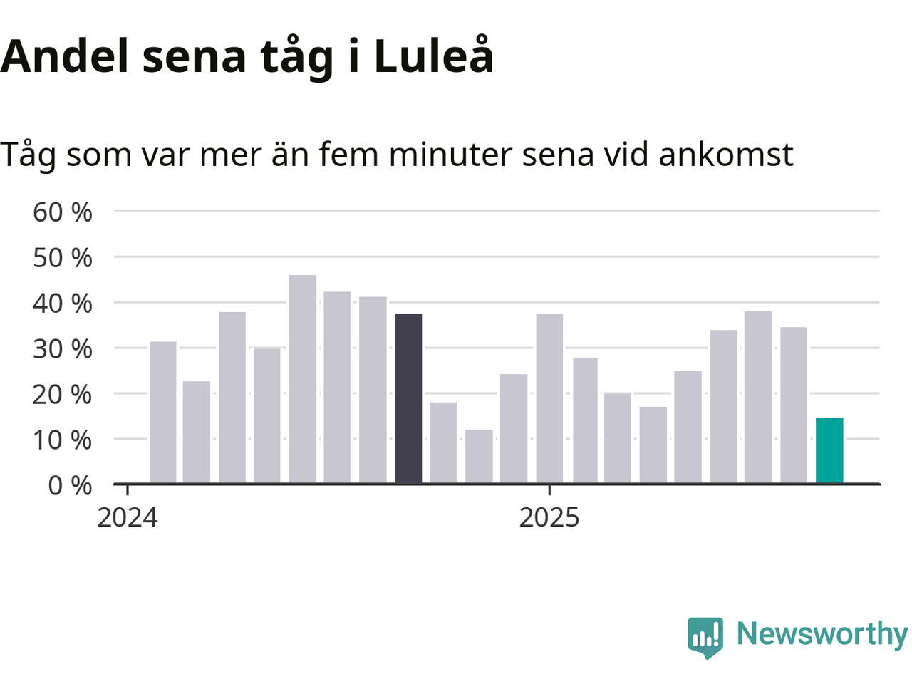 15 procent kan jämföras med 34 procent månaden innan, och 37 procent i september 2024. Siffrorna bygger på realtidsinformation om tågavgångar och ankomster från Trafikverket, som Newsworthy löpande samlar in.