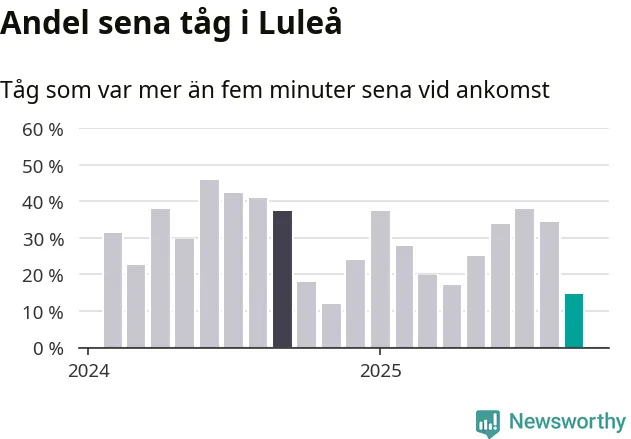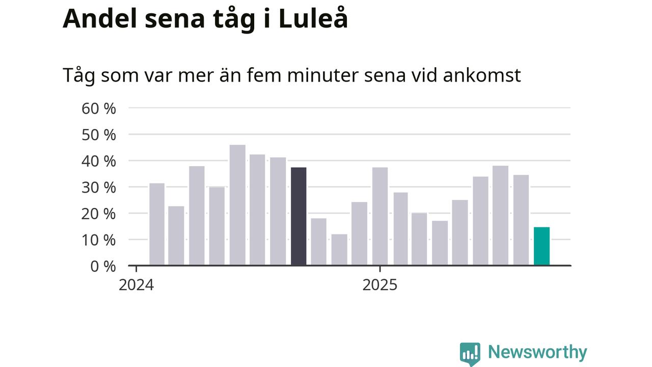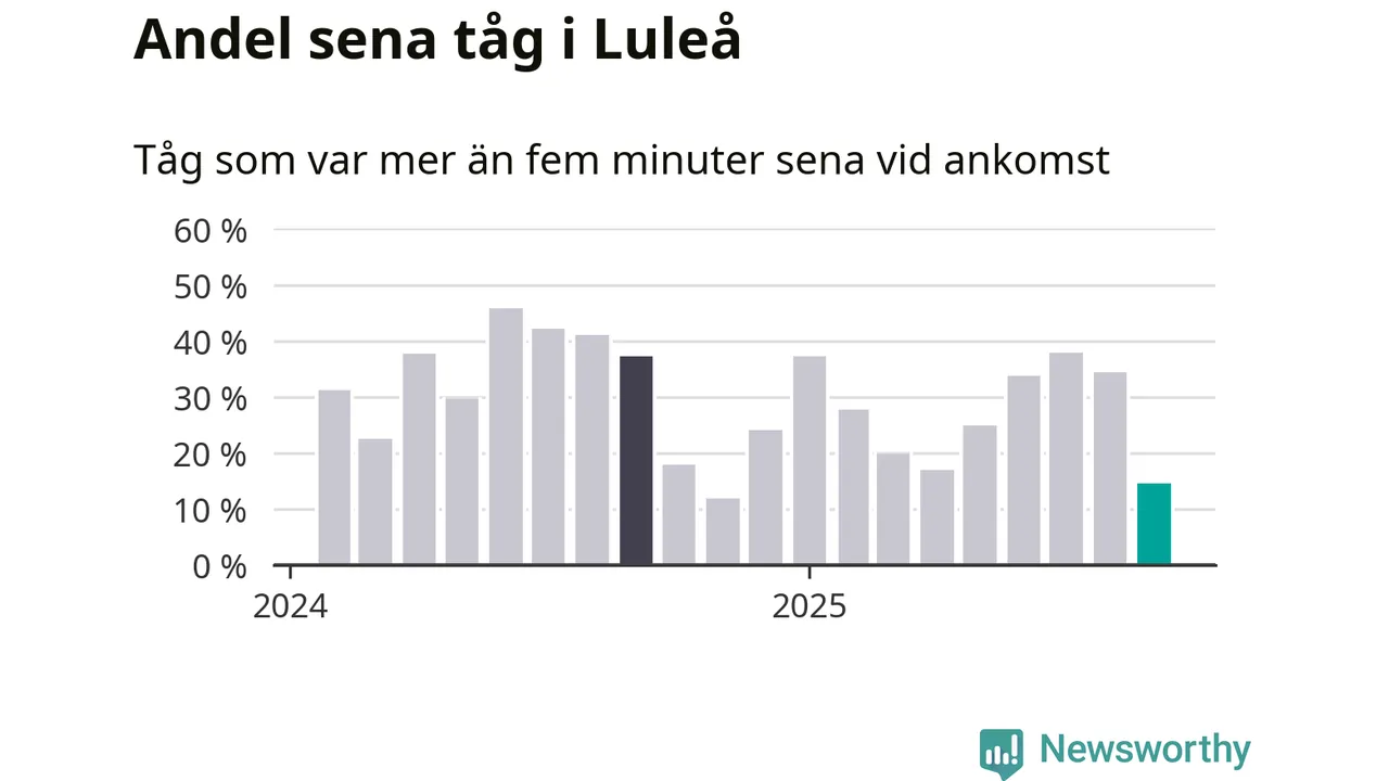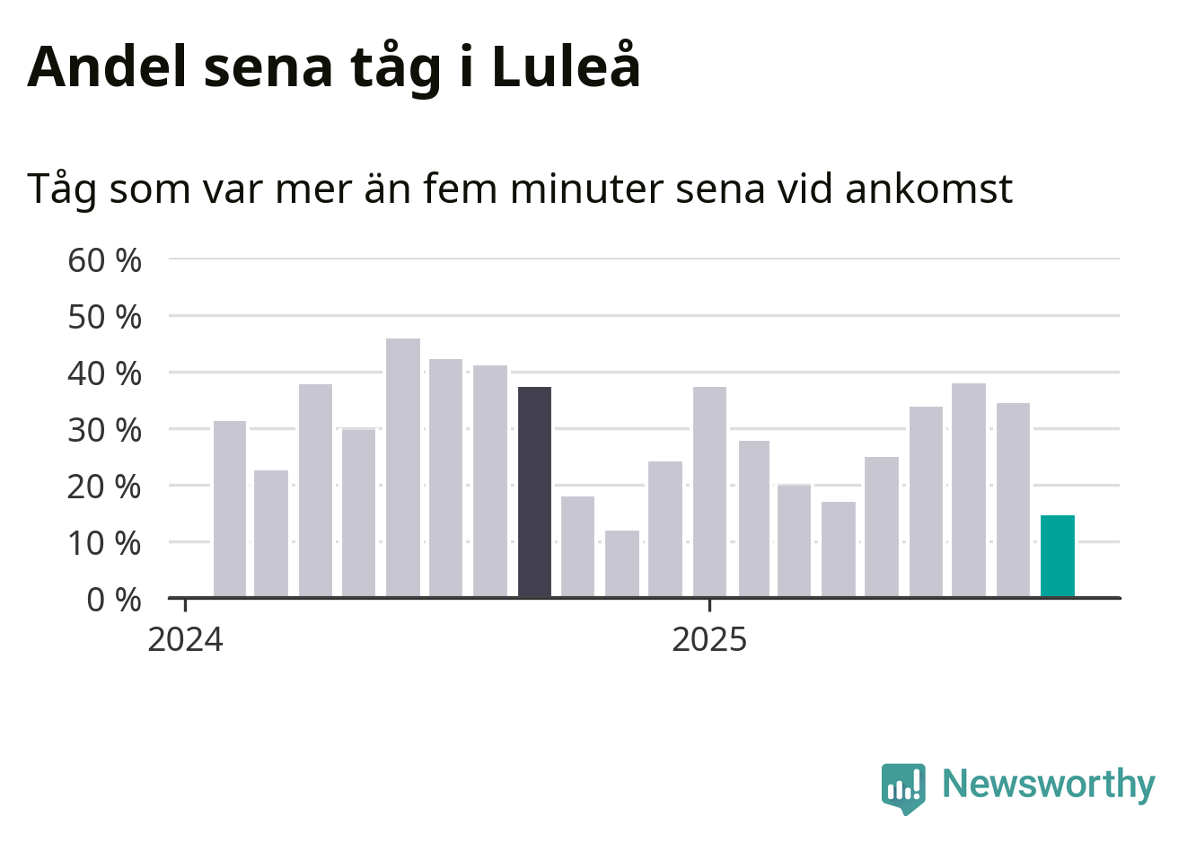Av 500 tåg som passerade någon av stationerna i Luleå kommun i september var 73 mer än fem minuter sena. Det motsvarar 15 procent, en bit över den nationella målsättningen som säger att inte mer än fem procent av tågen ska vara sena.