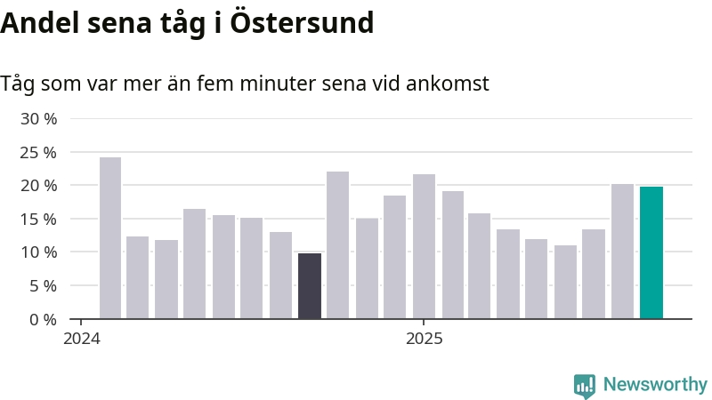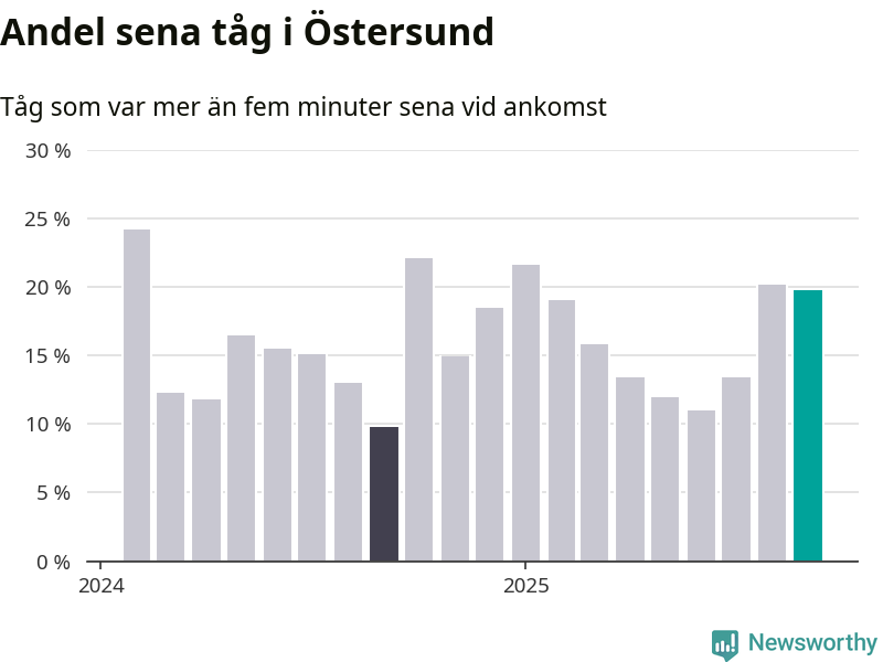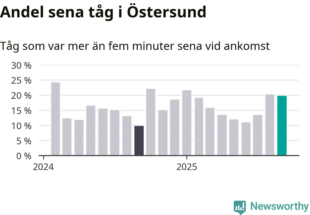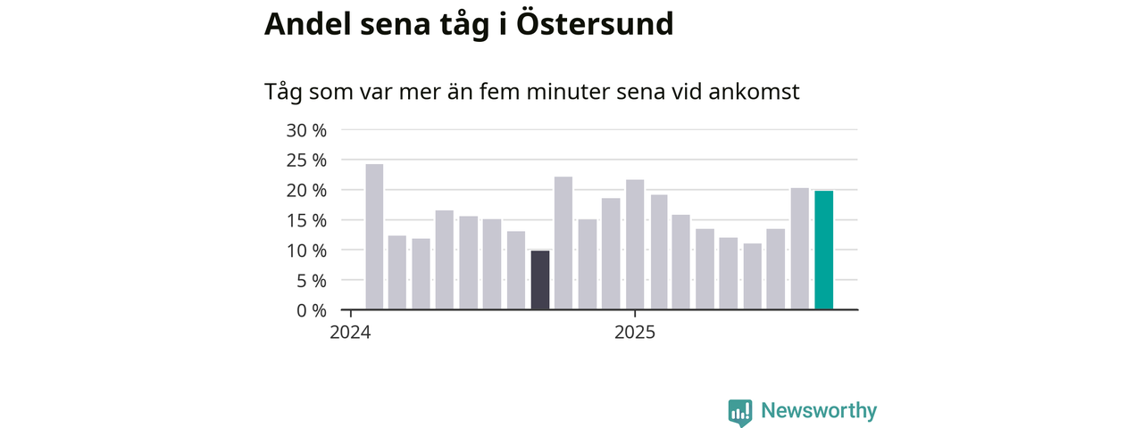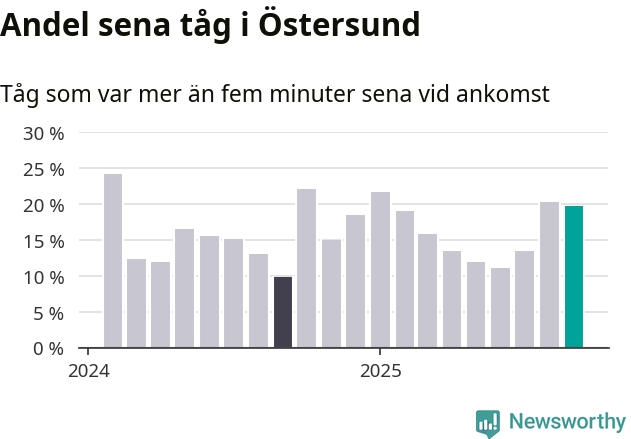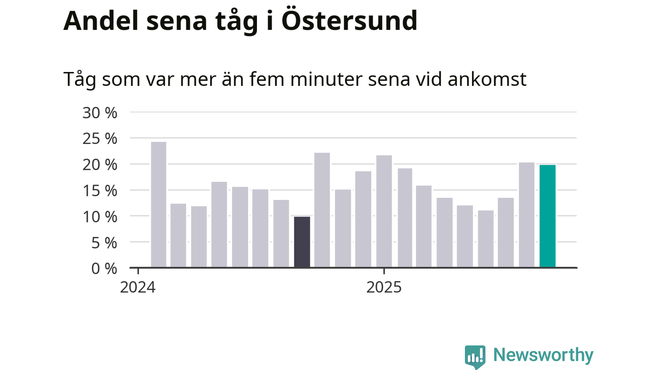 20 procent är marginellt mindre än månaden innan, och kan jämföras med tio procent i september 2024. Siffrorna bygger på realtidsinformation om tågavgångar och ankomster från Trafikverket, som Newsworthy löpande samlar in.