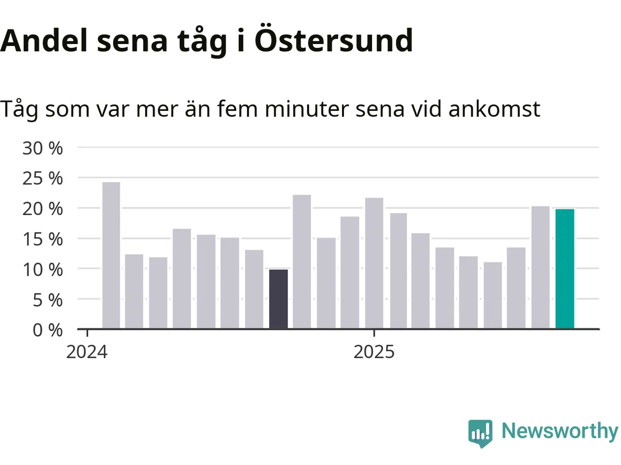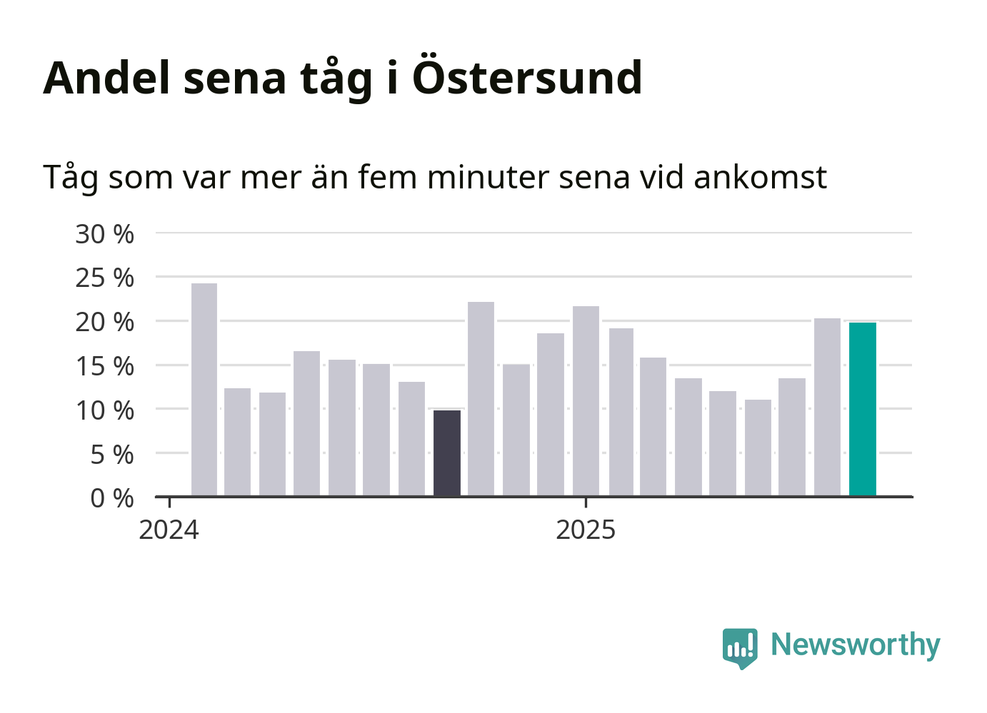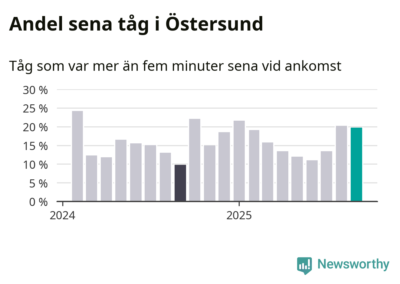 20 procent är marginellt mindre än månaden innan, och kan jämföras med tio procent i september 2024. Siffrorna bygger på realtidsinformation om tågavgångar och ankomster från Trafikverket, som Newsworthy löpande samlar in.