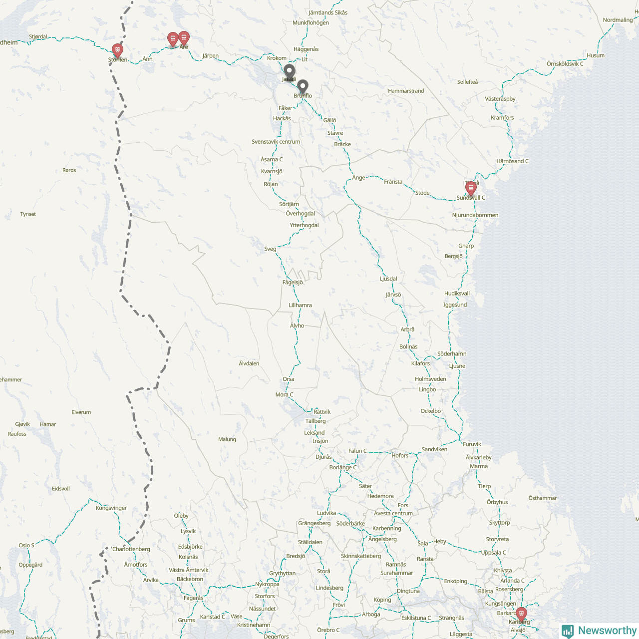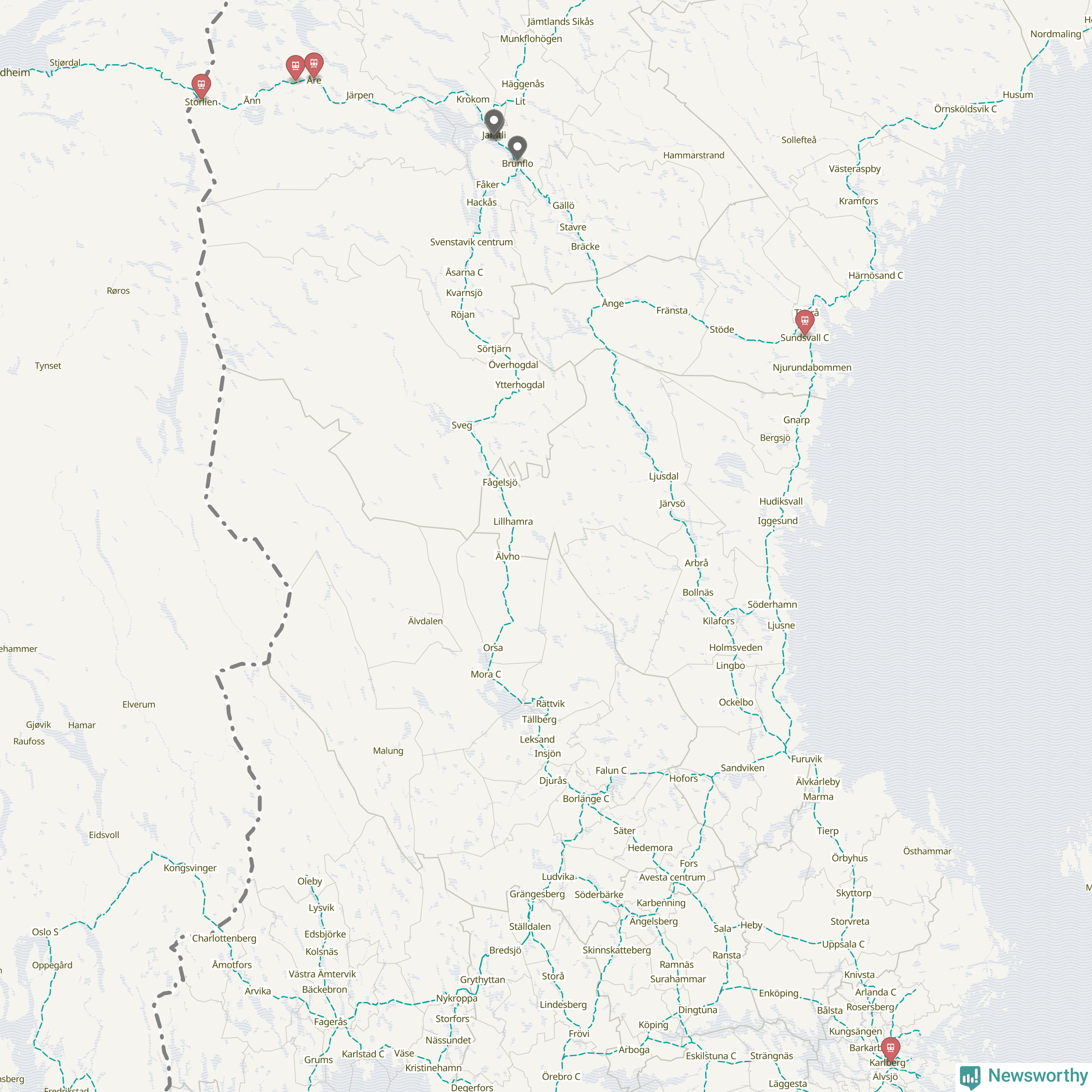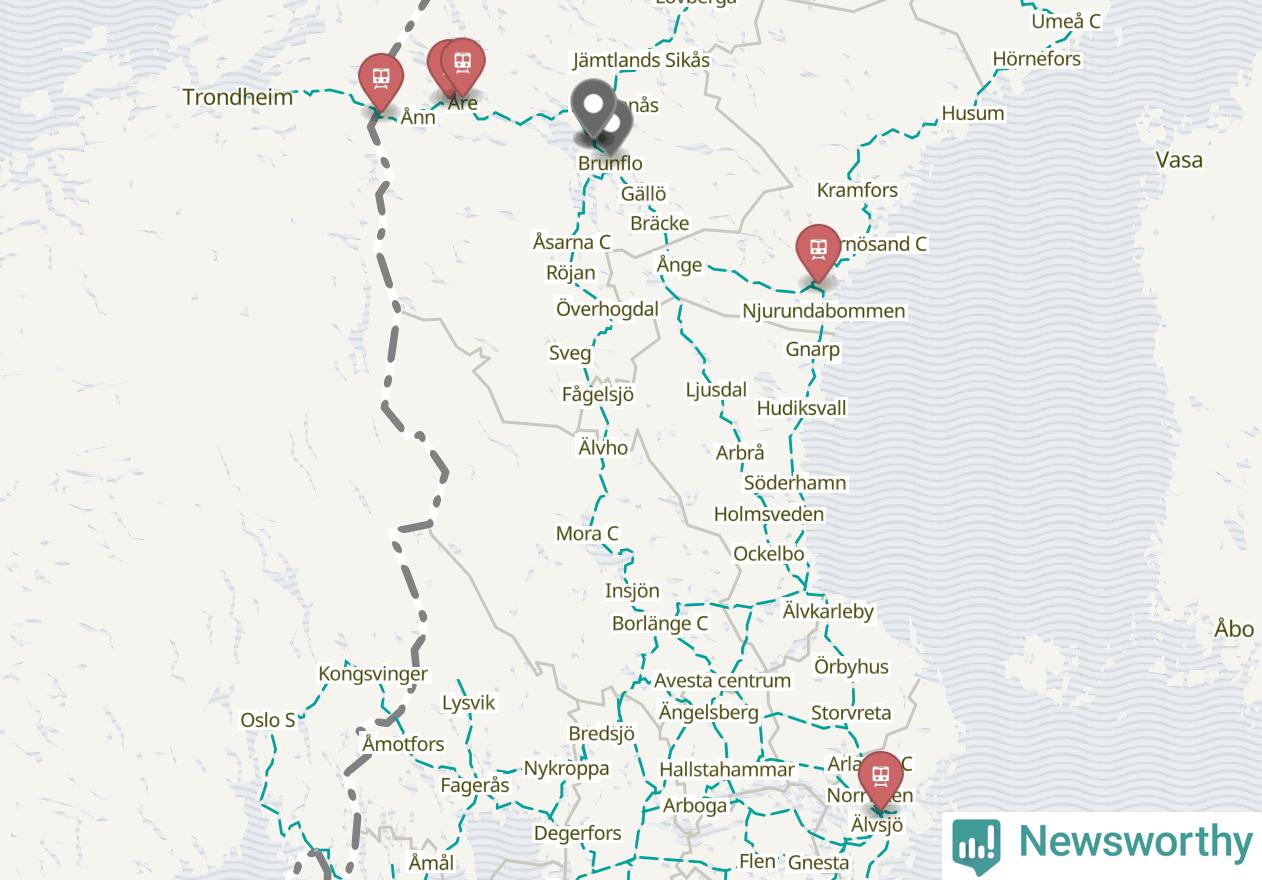 Kartdata från Mapbox, Newsworthy, OpenStreetMap och Trafikverket. Uppgifter om sträckor med passagerartrafik från jarnvag.net.
