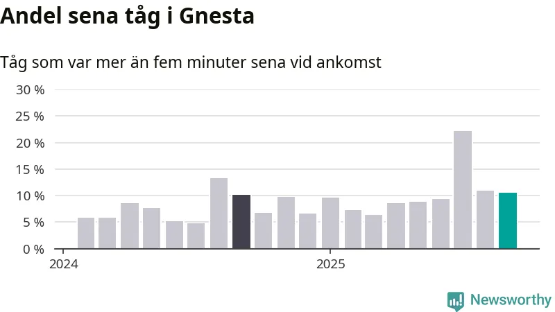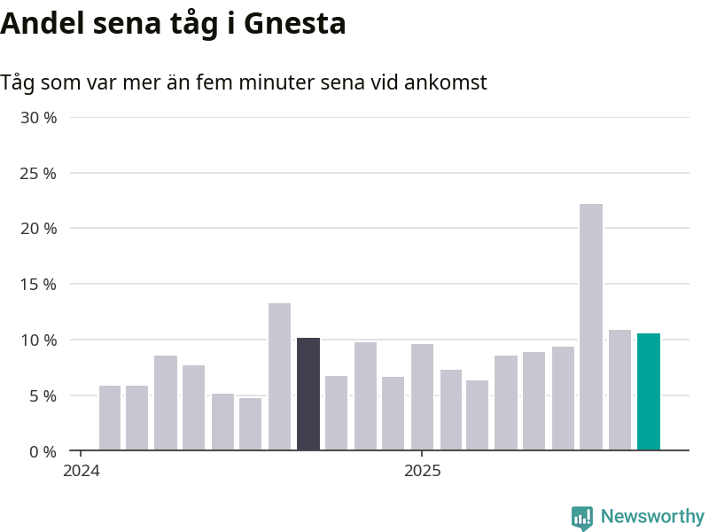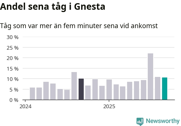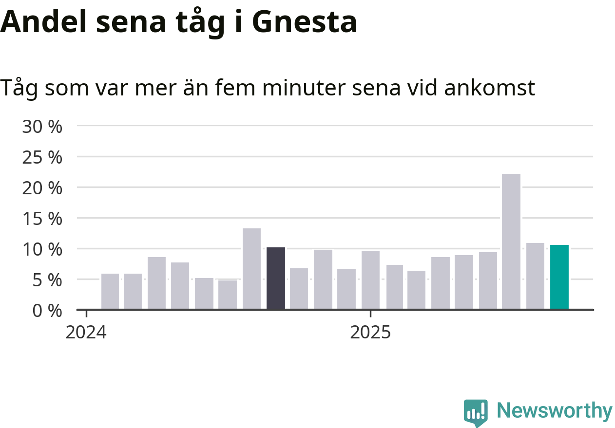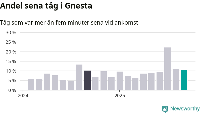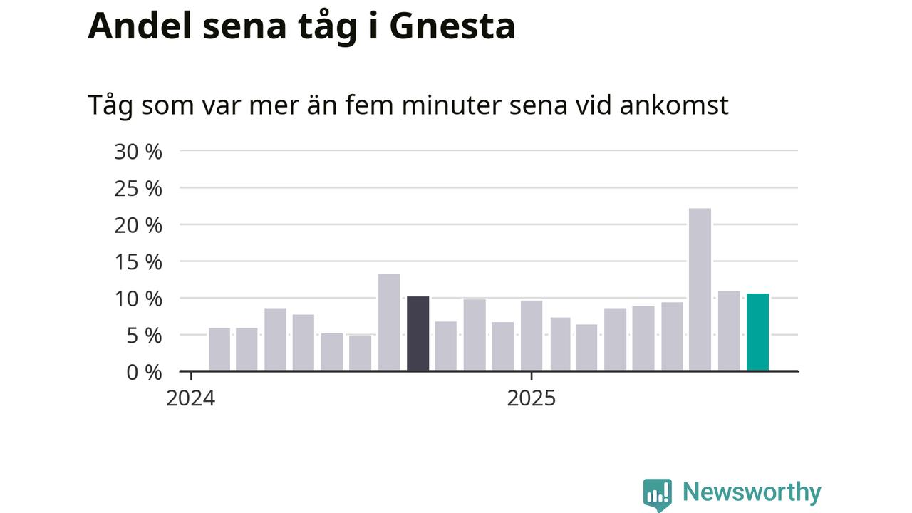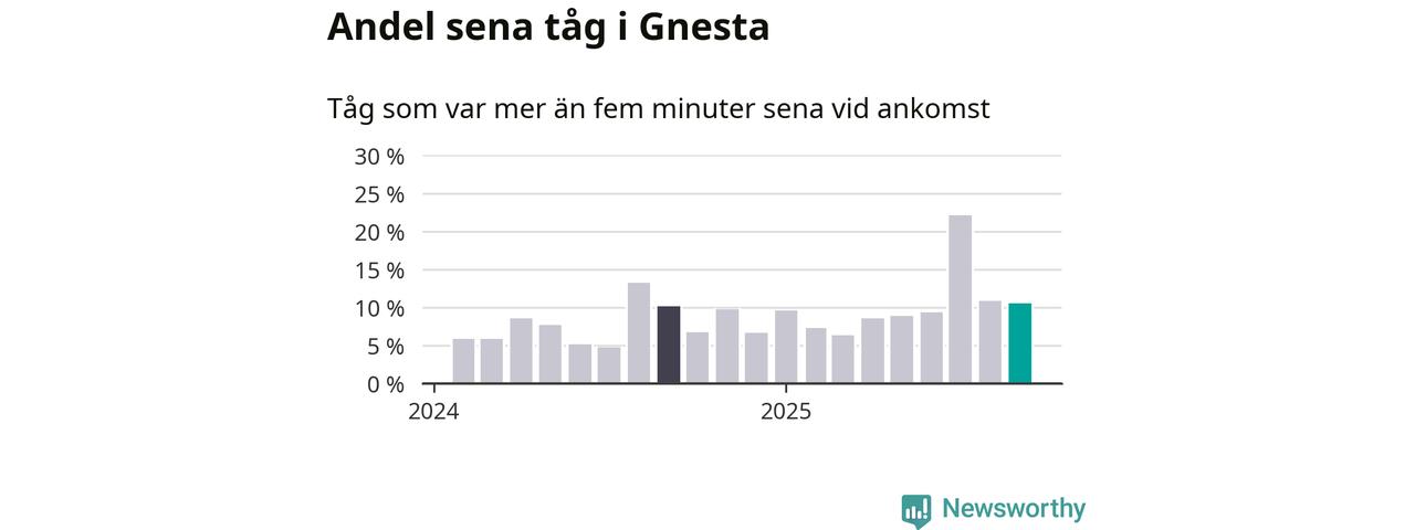 Elva procent är marginellt mindre än månaden innan, och kan jämföras med tio procent i september 2024. Siffrorna bygger på realtidsinformation om tågavgångar och ankomster från Trafikverket, som Newsworthy löpande samlar in.