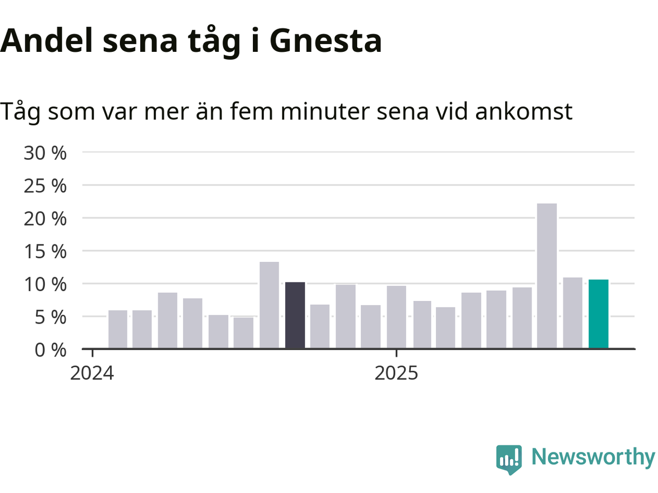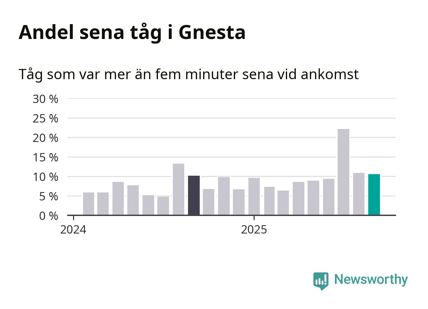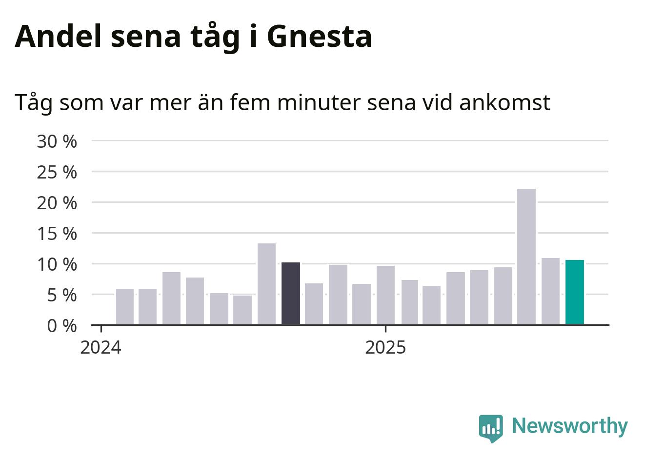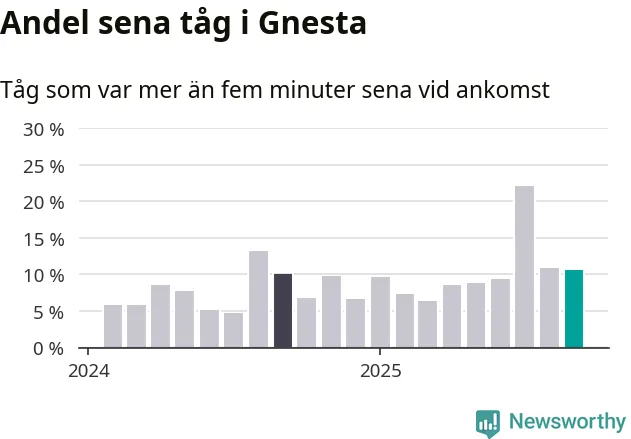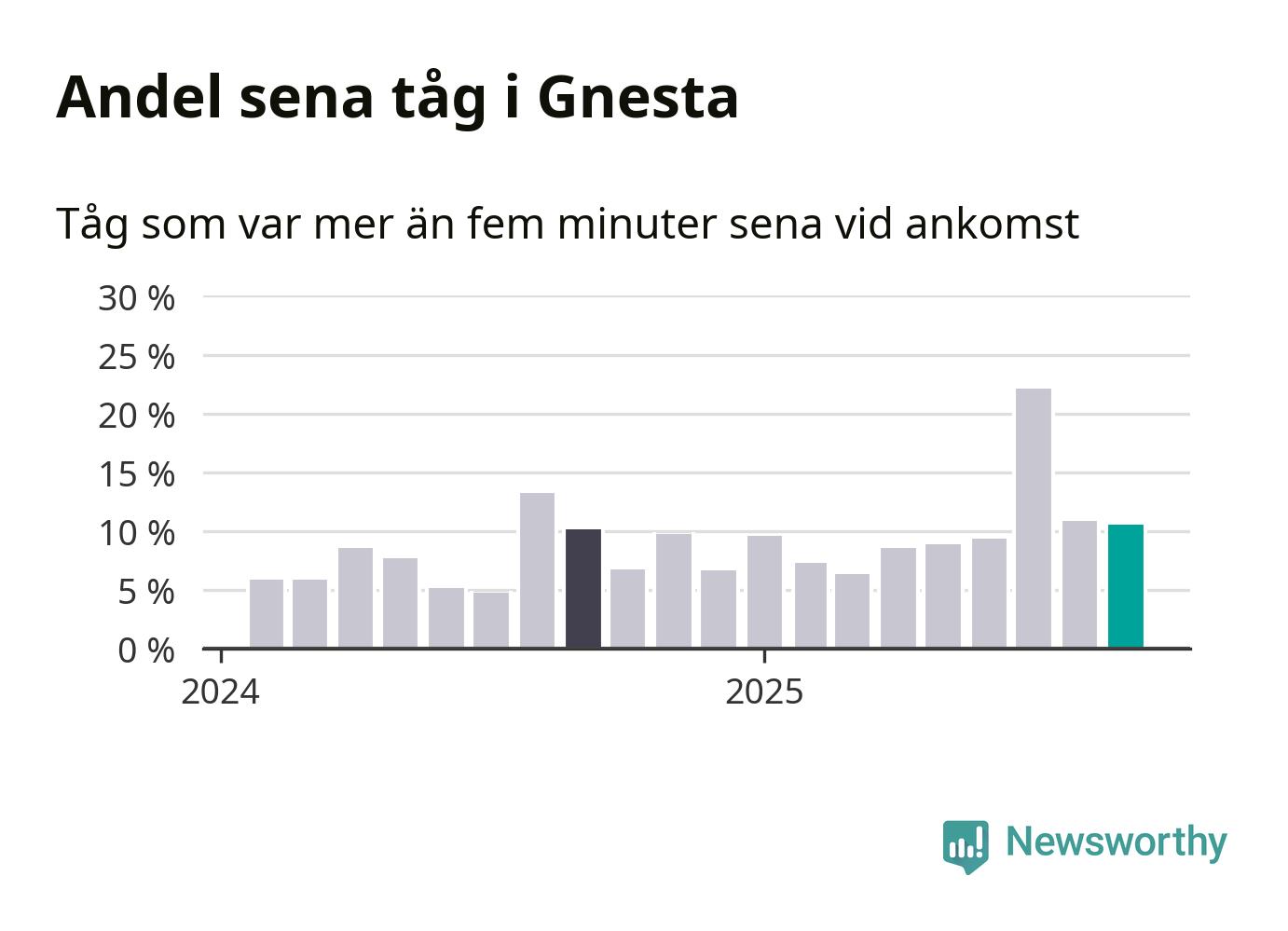 Elva procent är marginellt mindre än månaden innan, och kan jämföras med tio procent i september 2024. Siffrorna bygger på realtidsinformation om tågavgångar och ankomster från Trafikverket, som Newsworthy löpande samlar in.