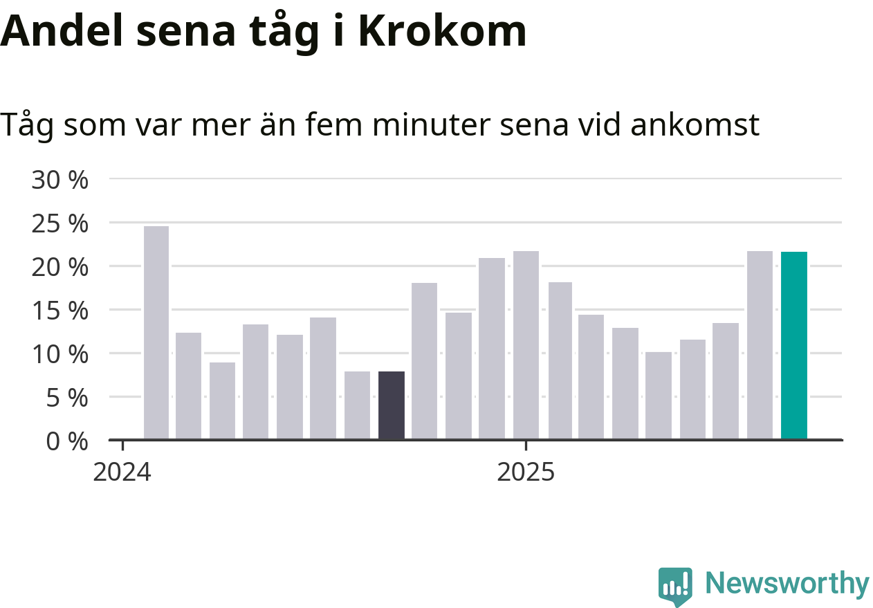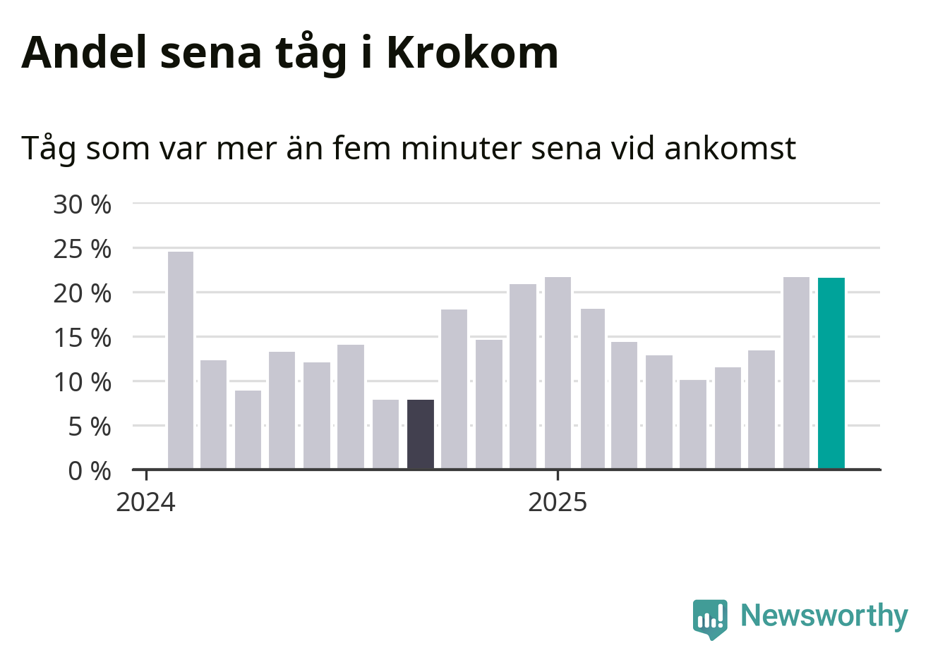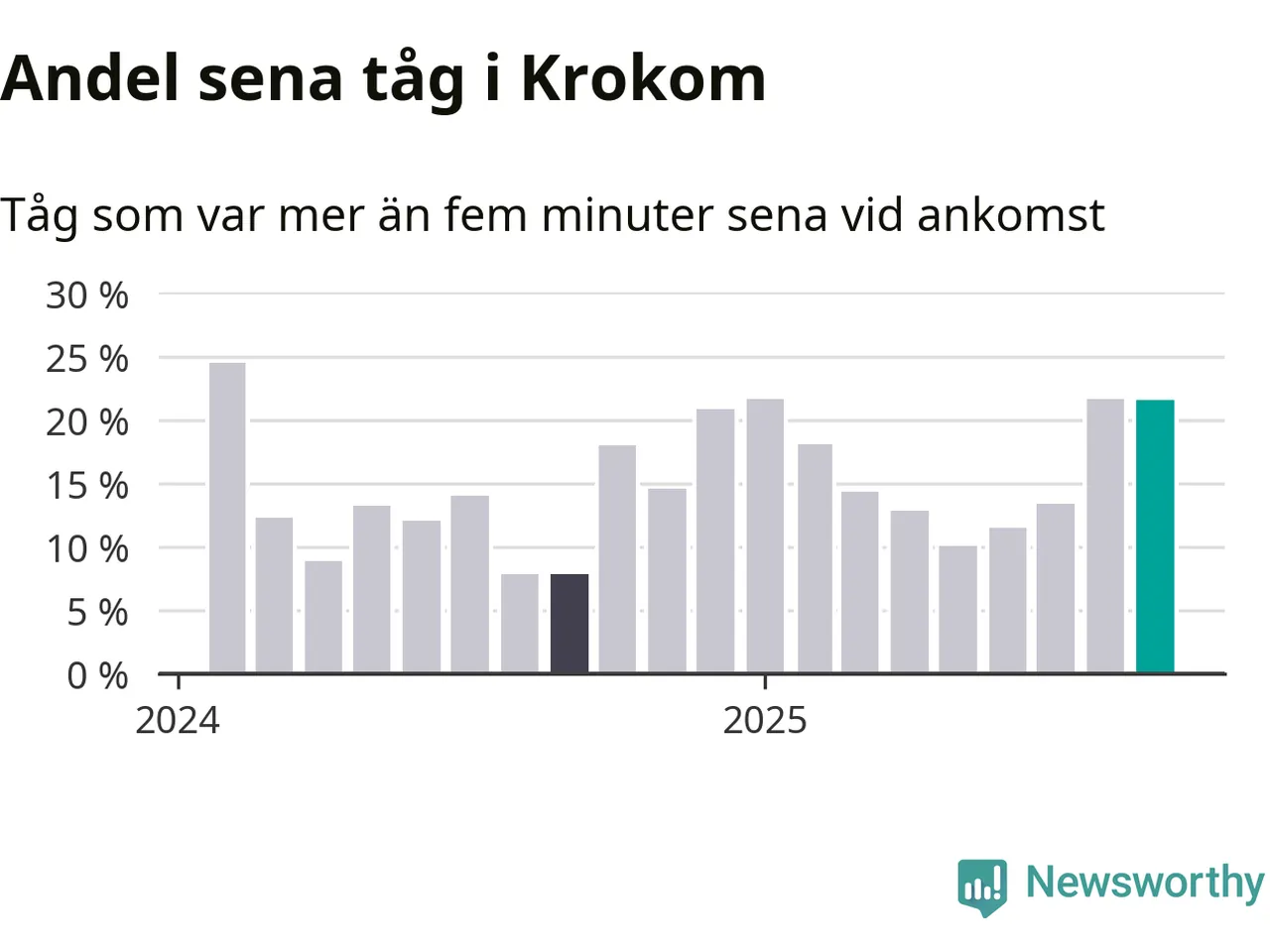 22 procent är marginellt mindre än månaden innan, och kan jämföras med åtta procent i september 2024. Siffrorna bygger på realtidsinformation om tågavgångar och ankomster från Trafikverket, som Newsworthy löpande samlar in.
