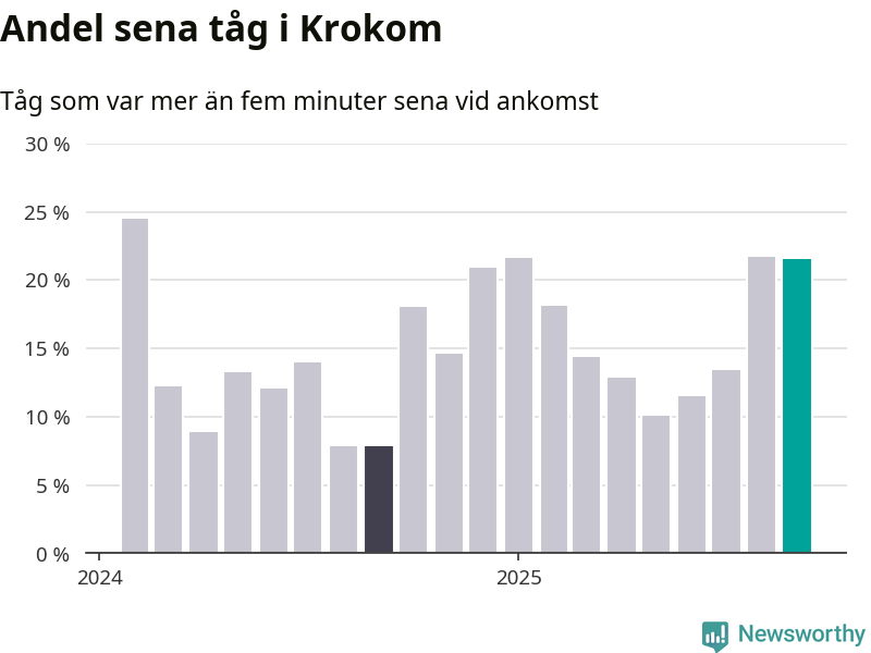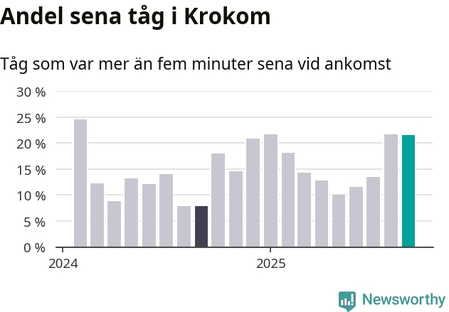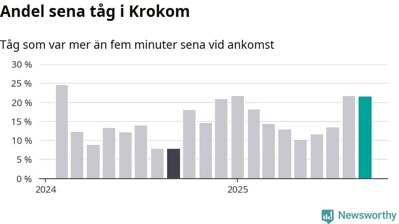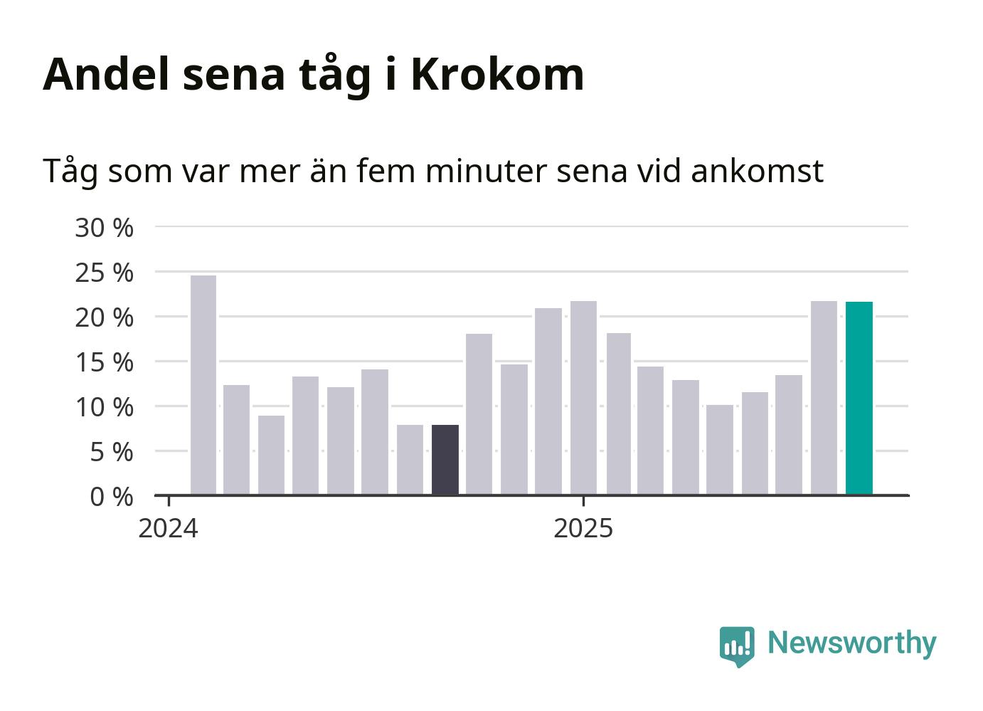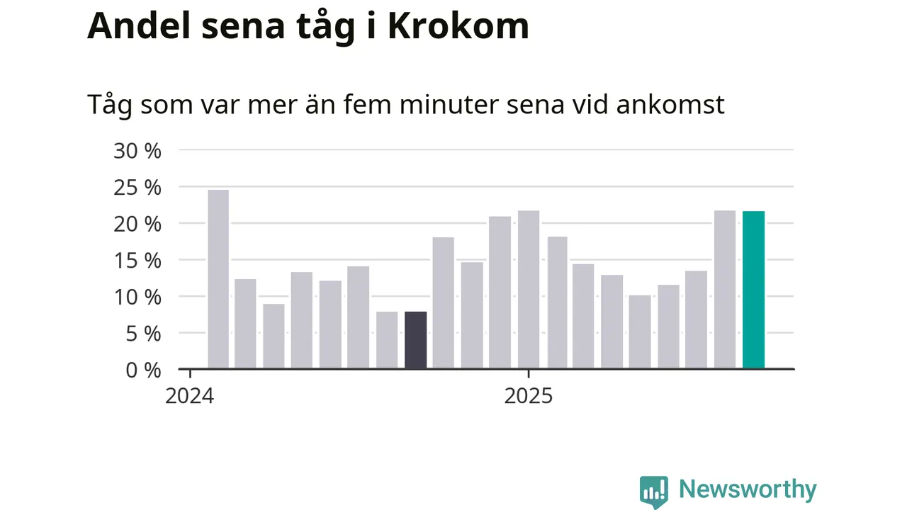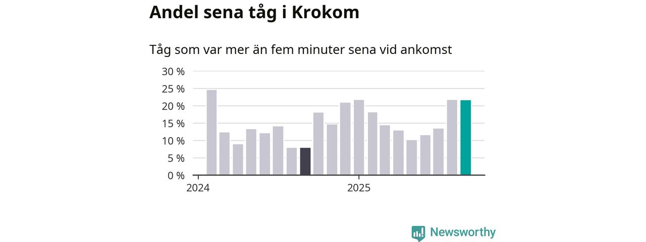 22 procent är marginellt mindre än månaden innan, och kan jämföras med åtta procent i september 2024. Siffrorna bygger på realtidsinformation om tågavgångar och ankomster från Trafikverket, som Newsworthy löpande samlar in.