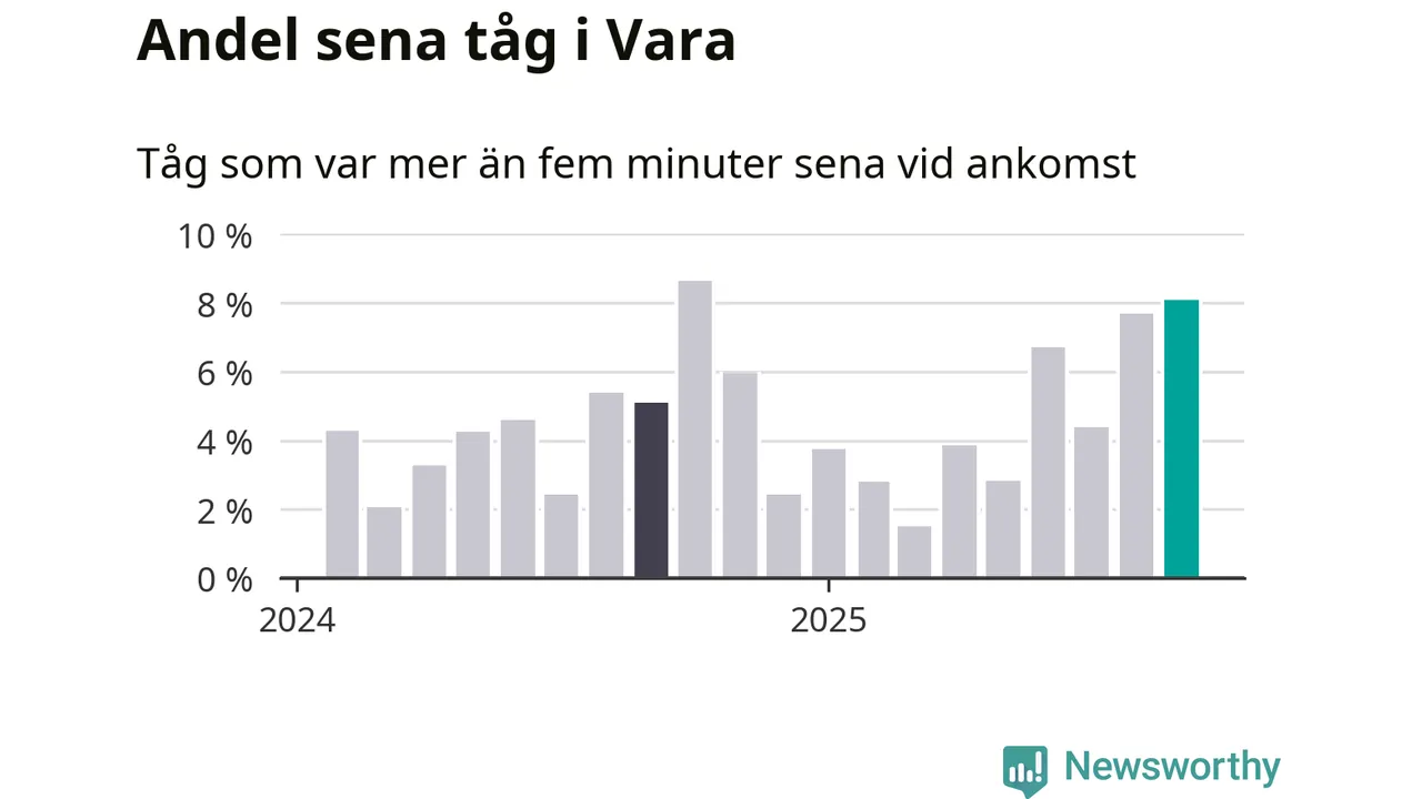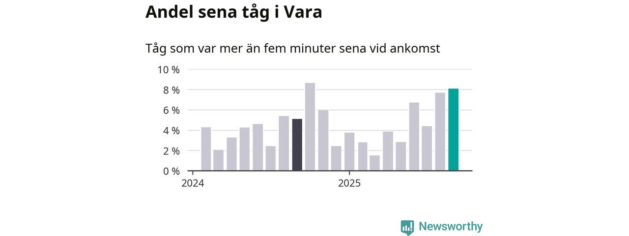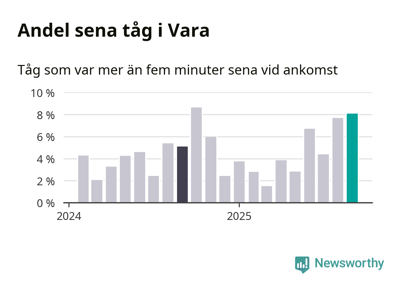 Åtta procent är marginellt mer än månaden innan, och kan jämföras med fem procent i september 2024. Siffrorna bygger på realtidsinformation om tågavgångar och ankomster från Trafikverket, som Newsworthy löpande samlar in.