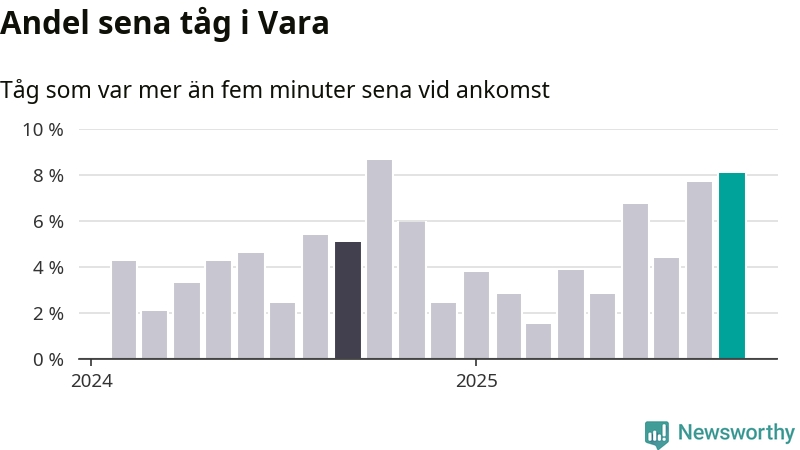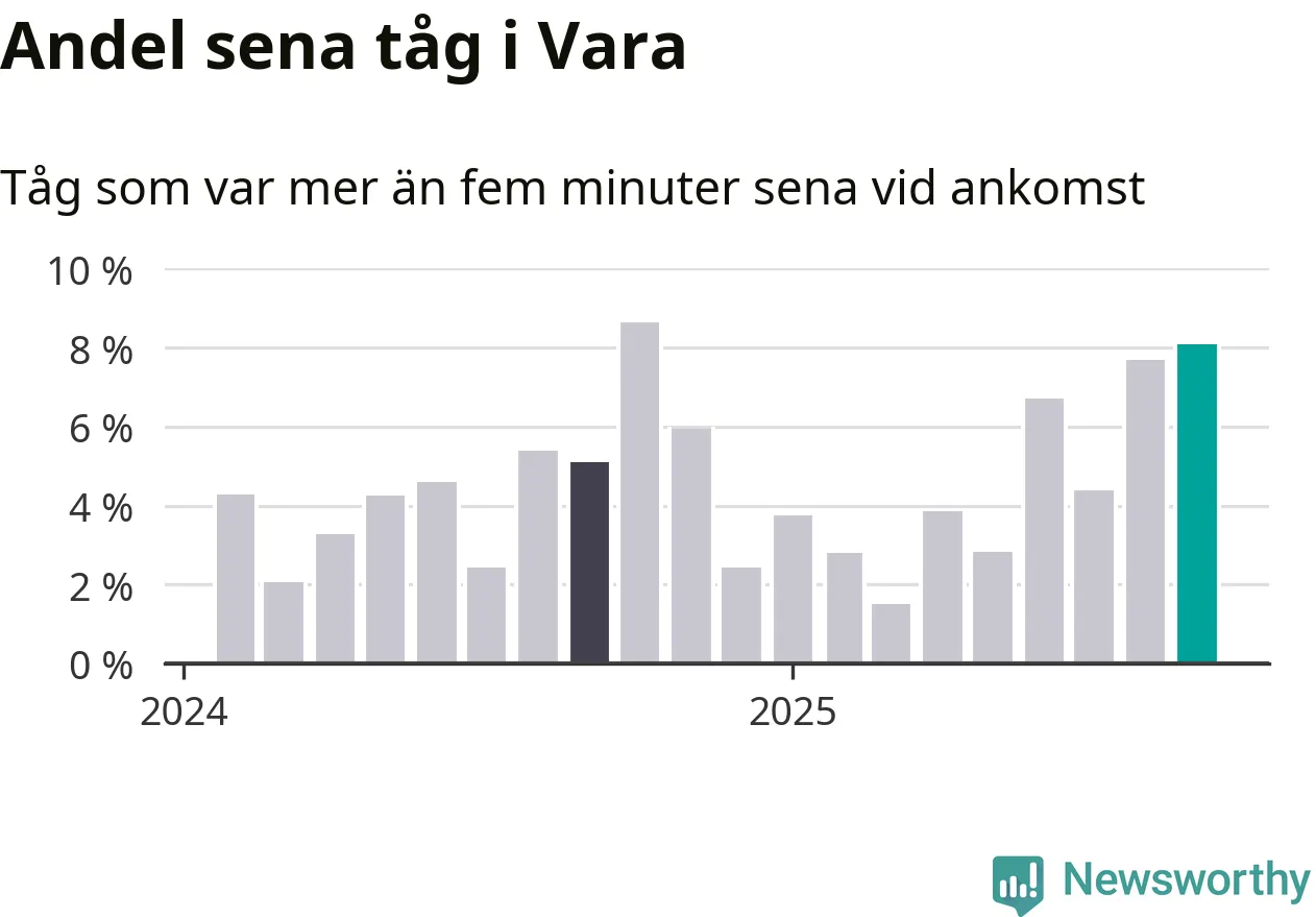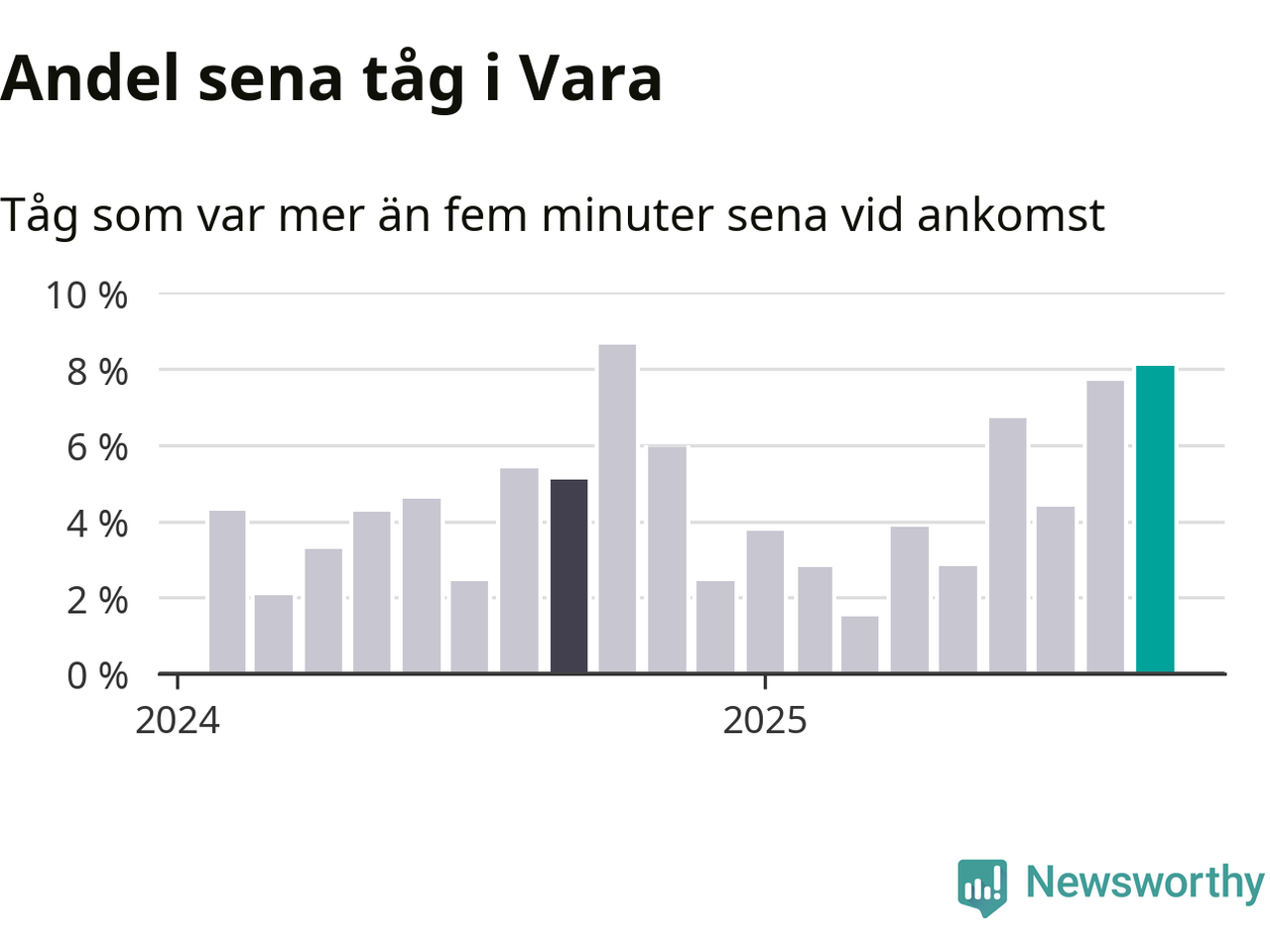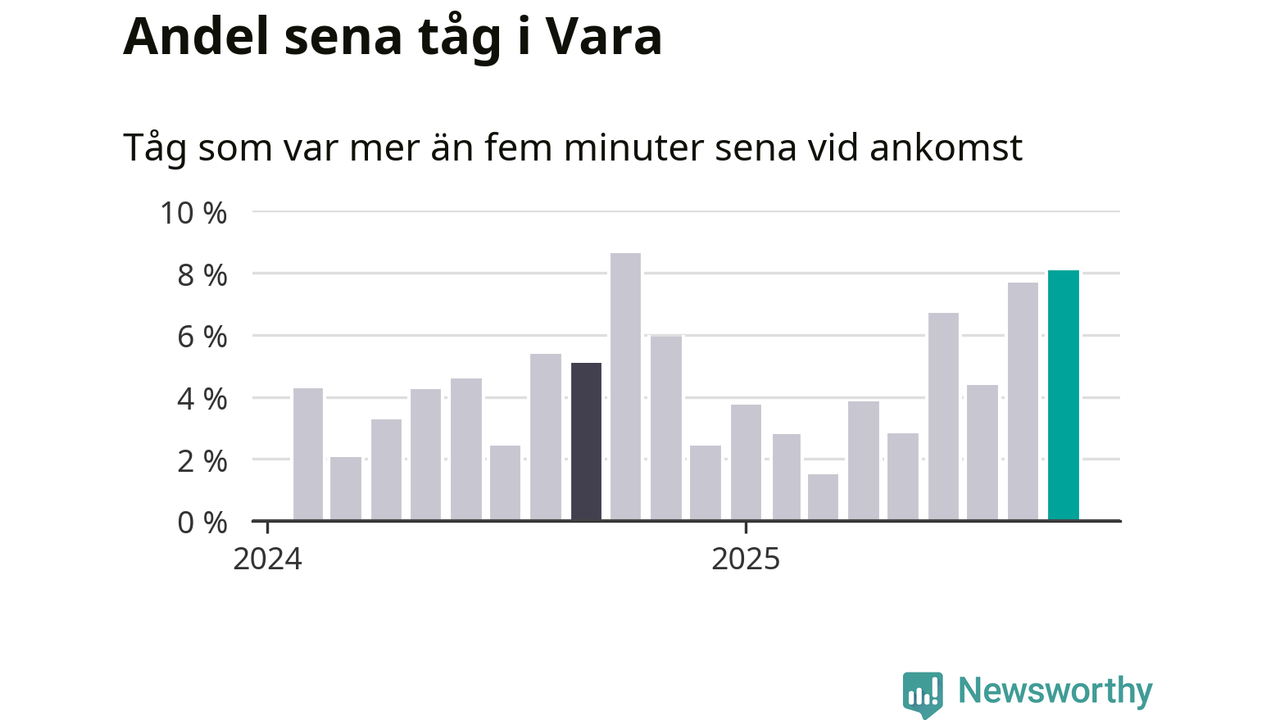 Åtta procent är marginellt mer än månaden innan, och kan jämföras med fem procent i september 2024. Siffrorna bygger på realtidsinformation om tågavgångar och ankomster från Trafikverket, som Newsworthy löpande samlar in.