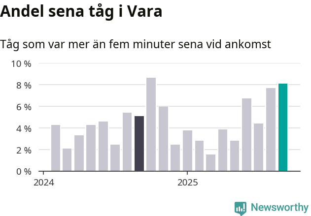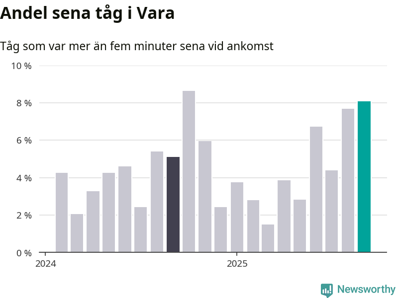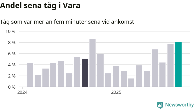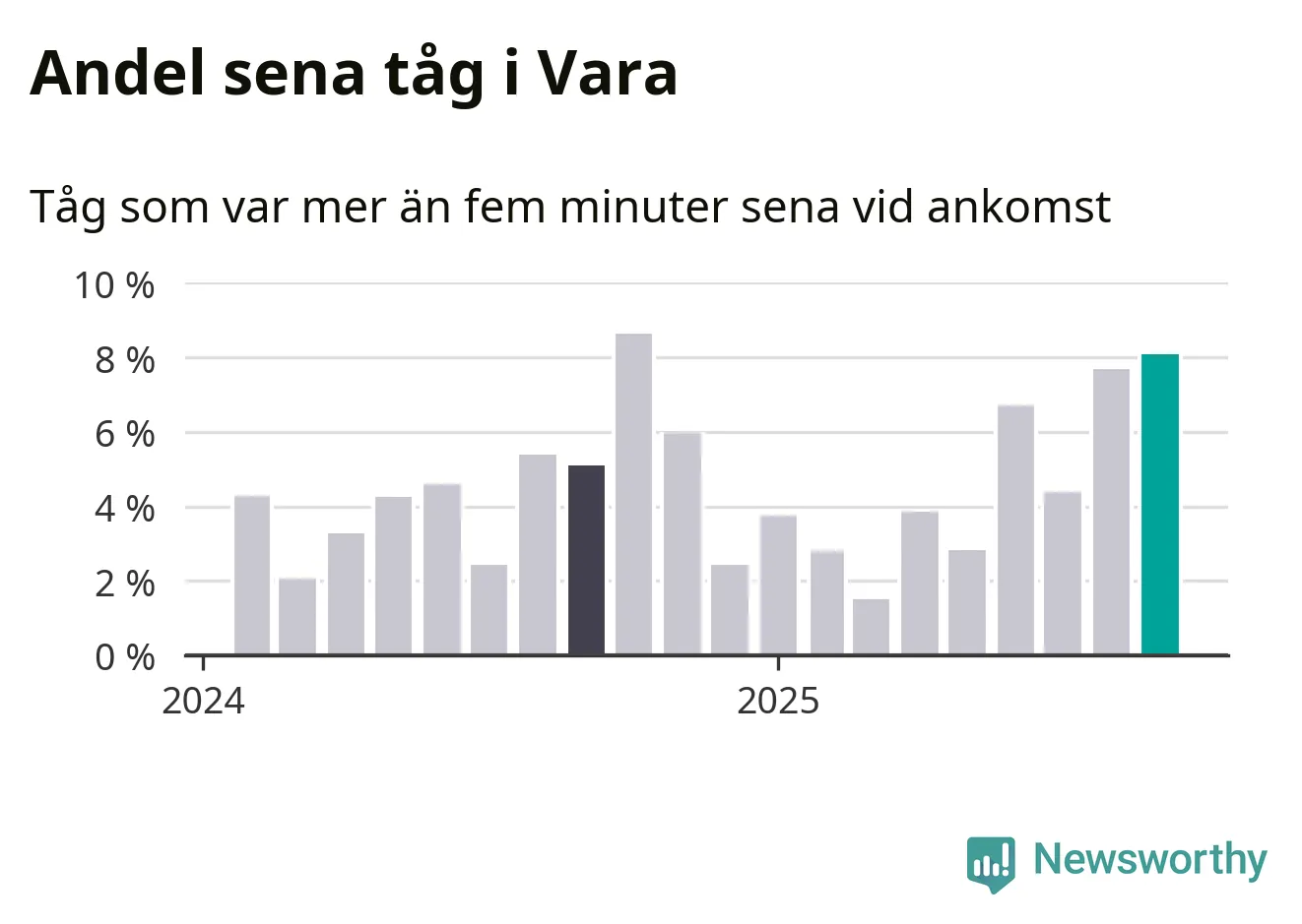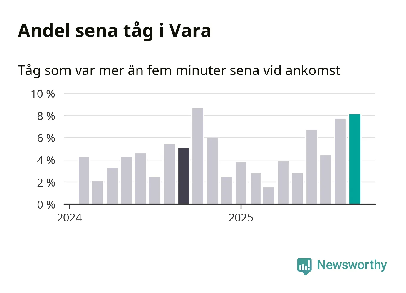 Den svenska järnvägsbranschen har ett gemensamt mål om att 95 procent av tågen ska komma fram i tid. Dit är det just nu långt. Så här sena var tågen vid stationerna i Vara kommun förra månaden.