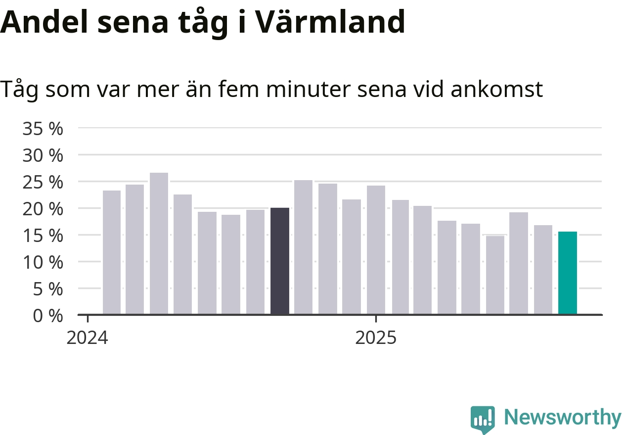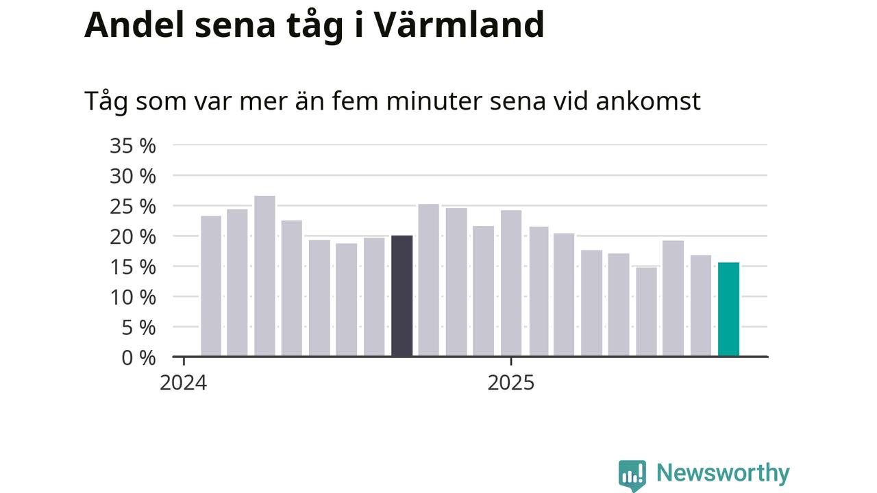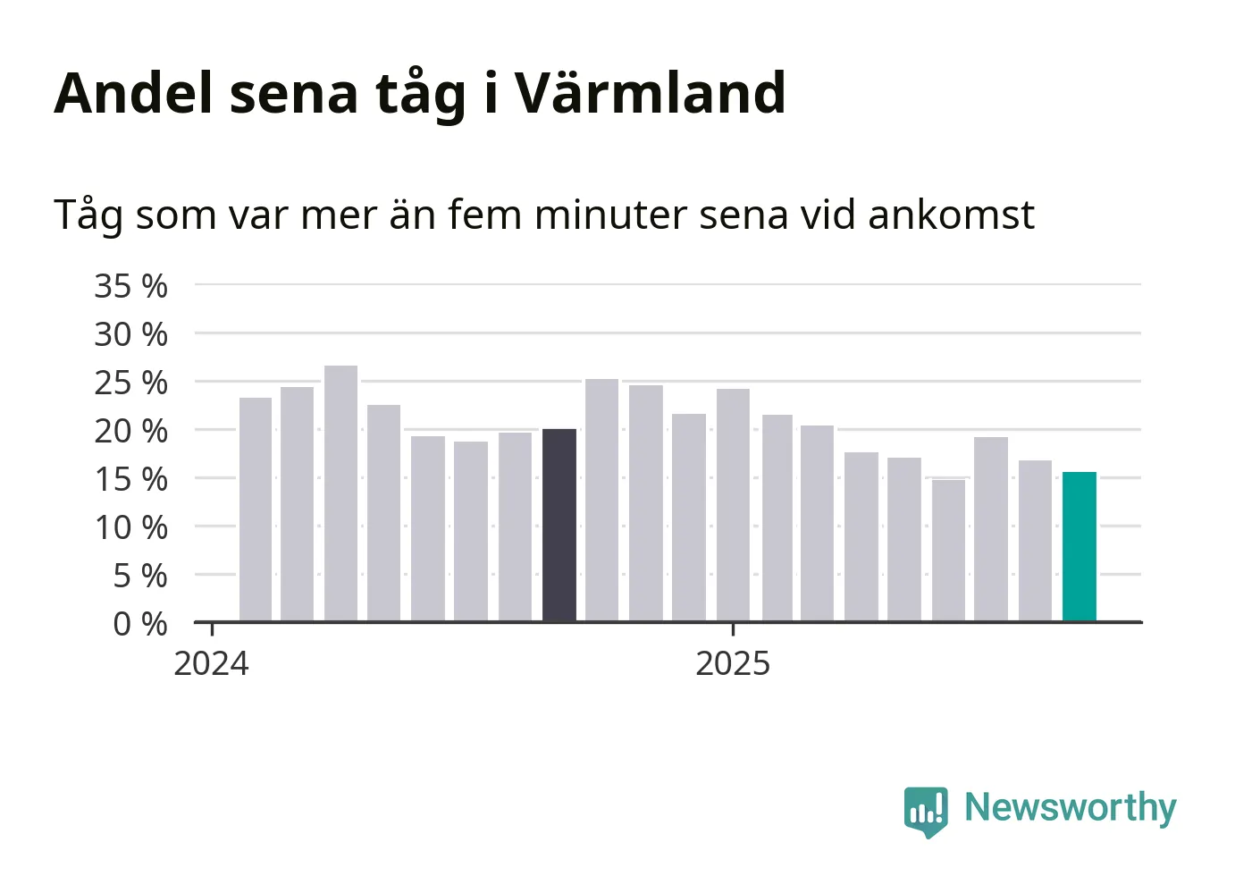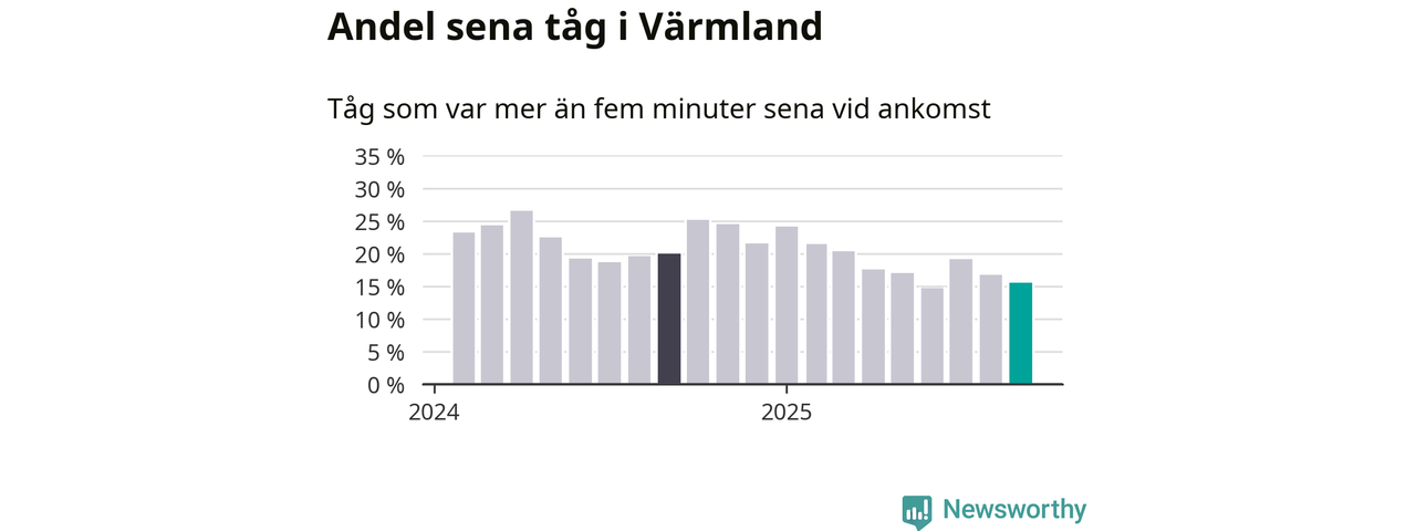 16 procent kan jämföras med 17 procent månaden innan, och 20 procent i september 2024. Siffrorna bygger på realtidsinformation om tågavgångar och ankomster från Trafikverket, som Newsworthy löpande samlar in.