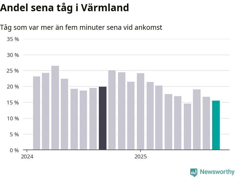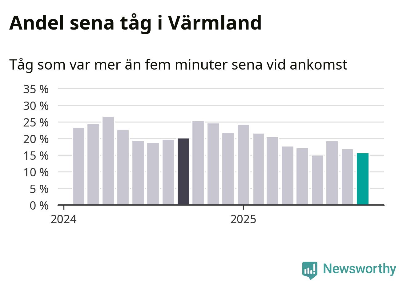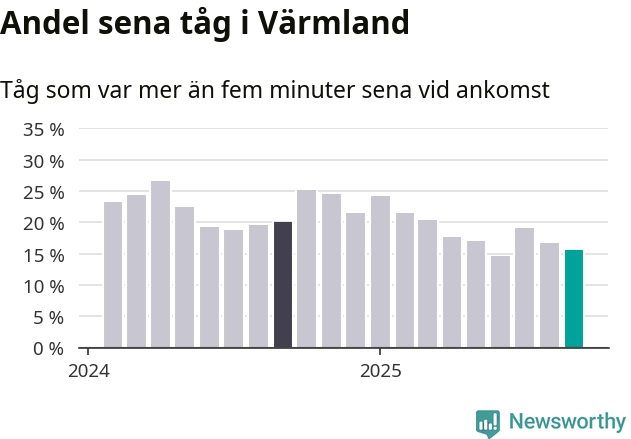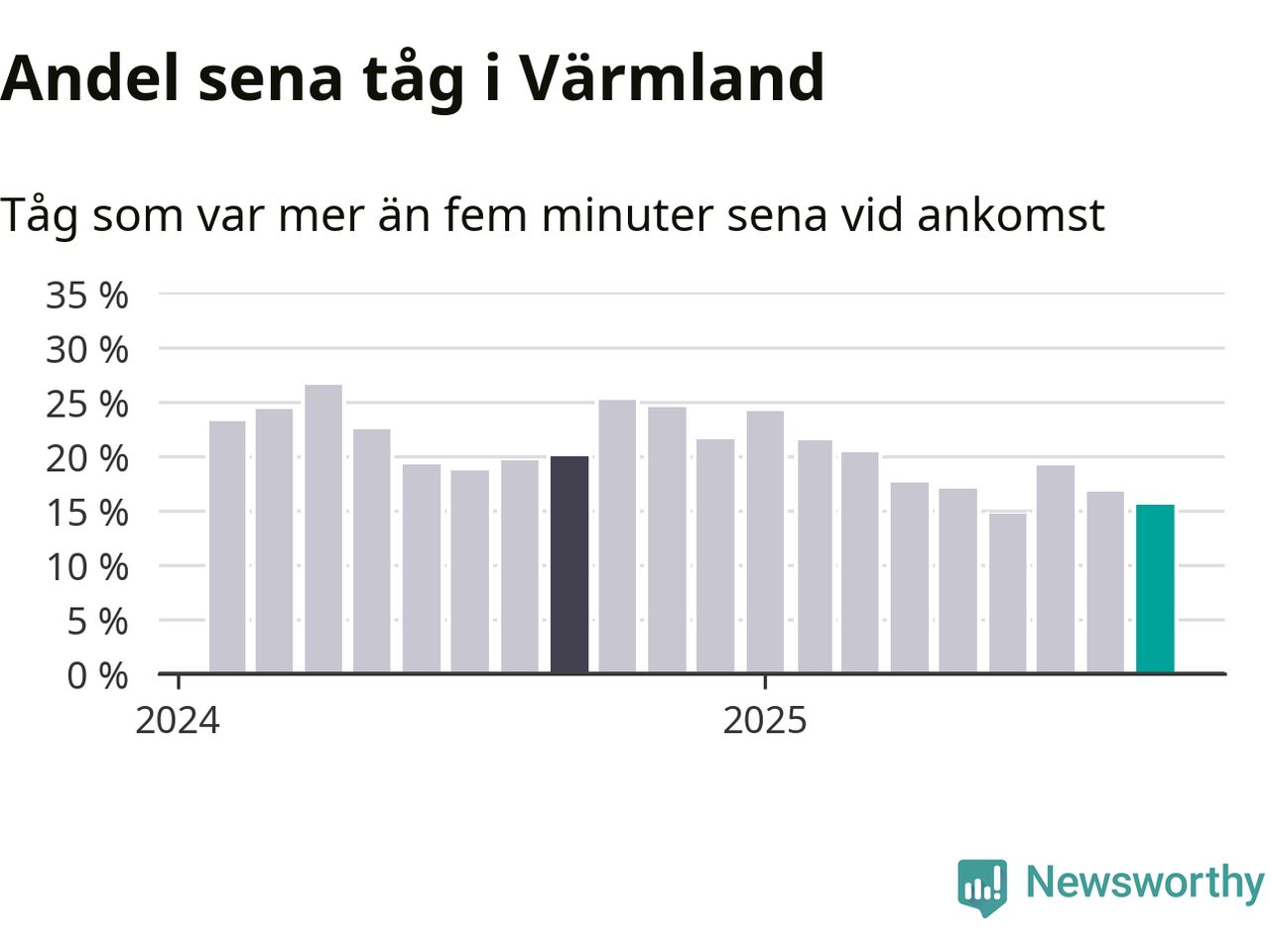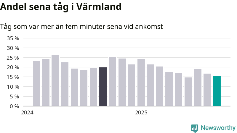 16 procent kan jämföras med 17 procent månaden innan, och 20 procent i september 2024. Siffrorna bygger på realtidsinformation om tågavgångar och ankomster från Trafikverket, som Newsworthy löpande samlar in.