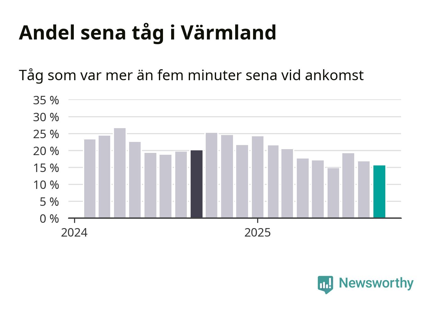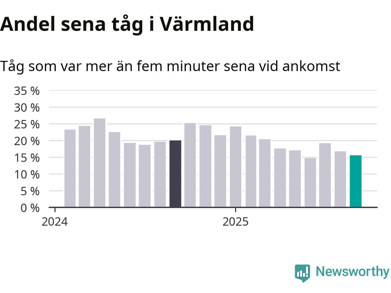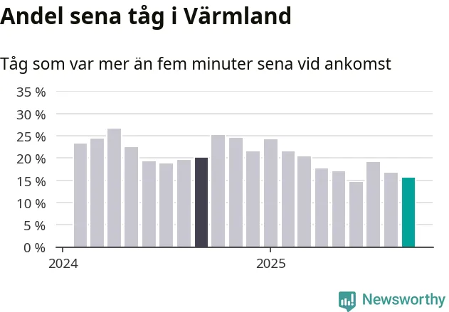 Av omkring 2 100 tåg som passerade någon av stationerna i Värmlands län i september var 326 mer än fem minuter sena. Det motsvarar 16 procent, en bra bit över den nationella målsättningen som säger att inte mer än fem procent av tågen ska vara sena.