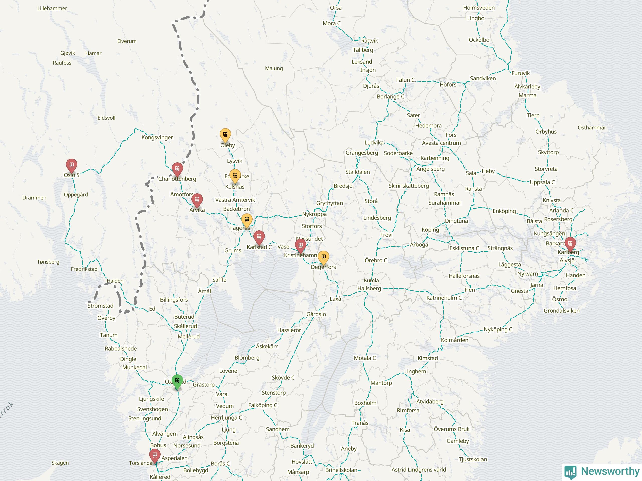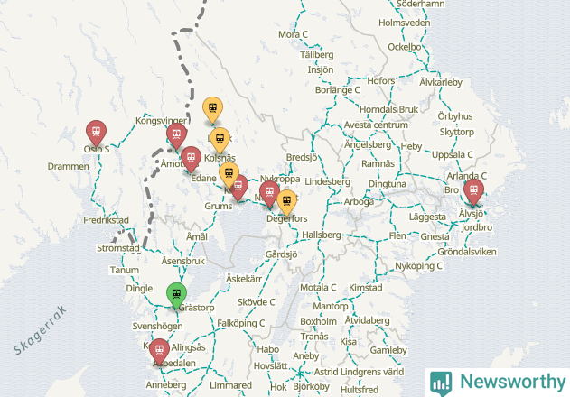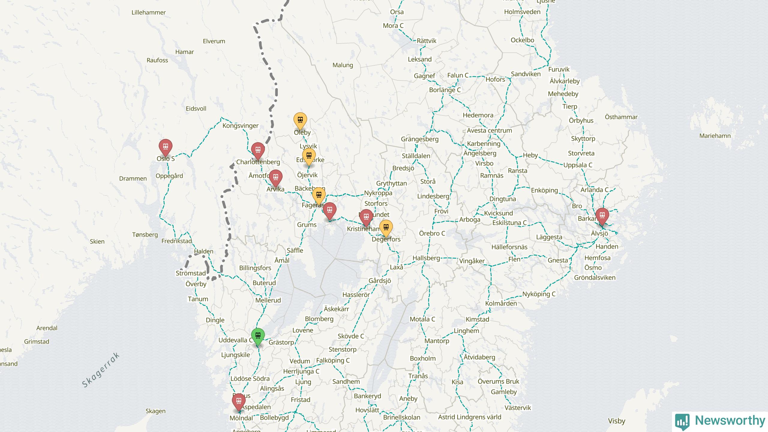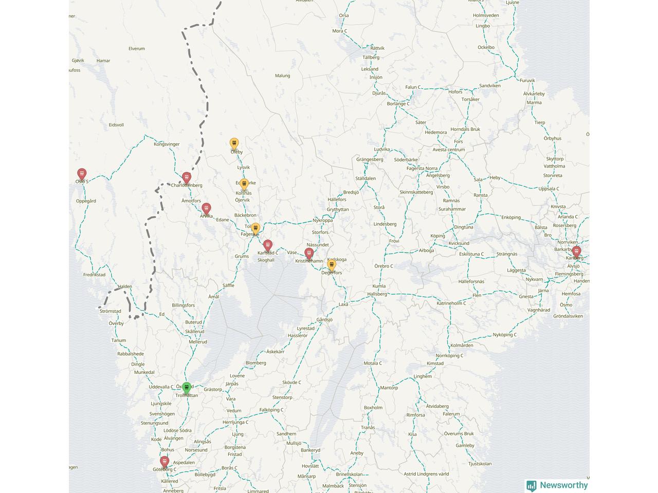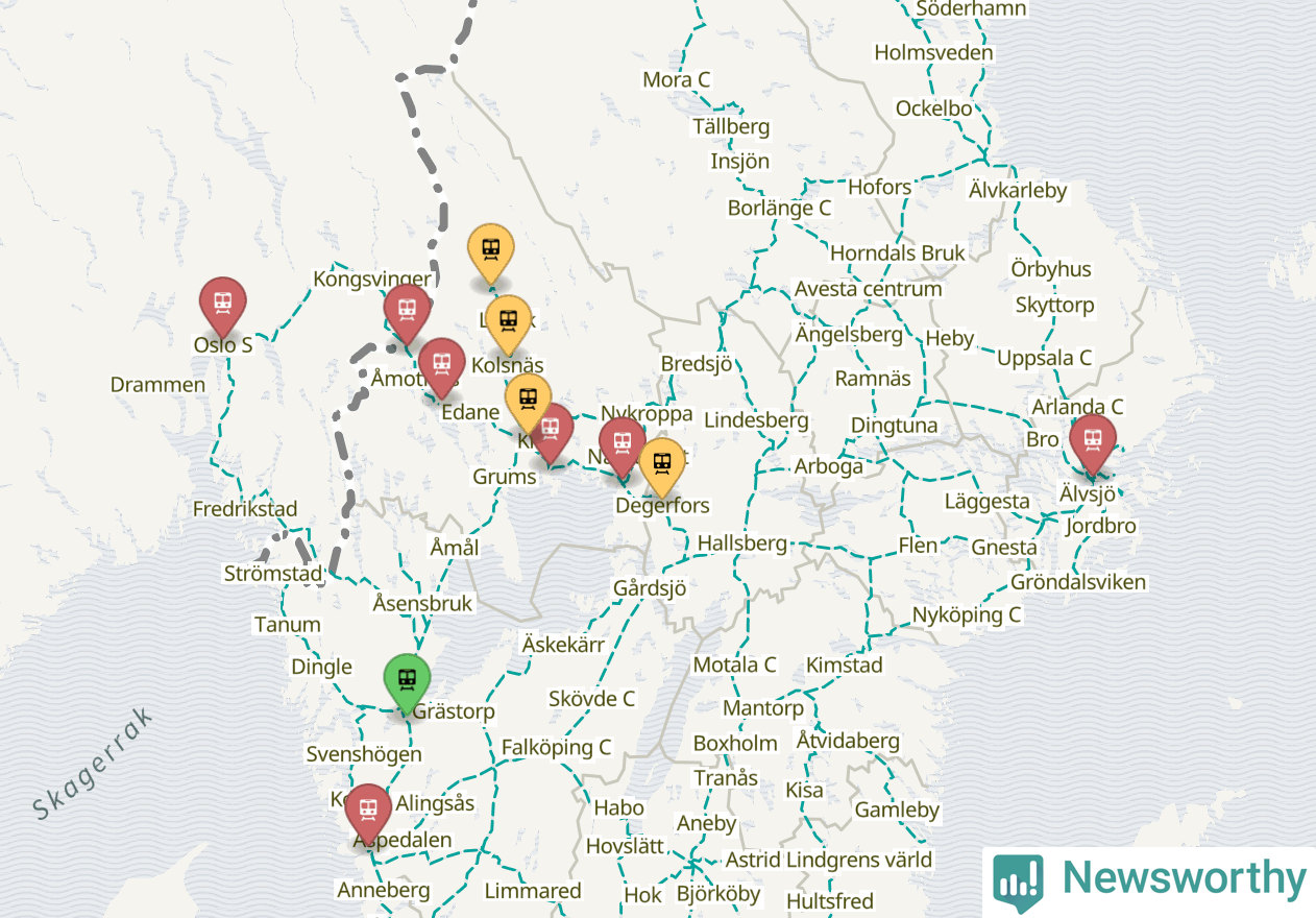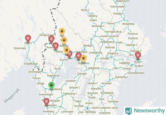 Kartdata från Mapbox, Newsworthy, OpenStreetMap och Trafikverket. Uppgifter om sträckor med passagerartrafik från jarnvag.net.