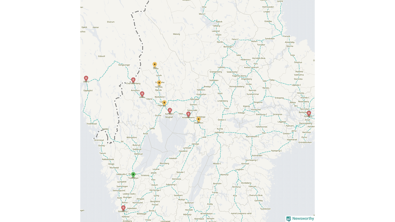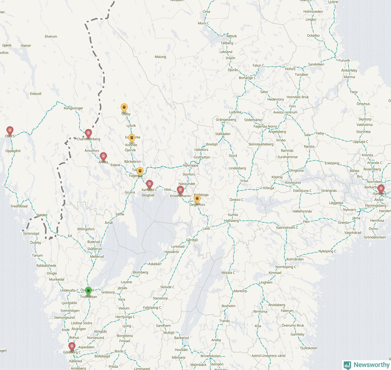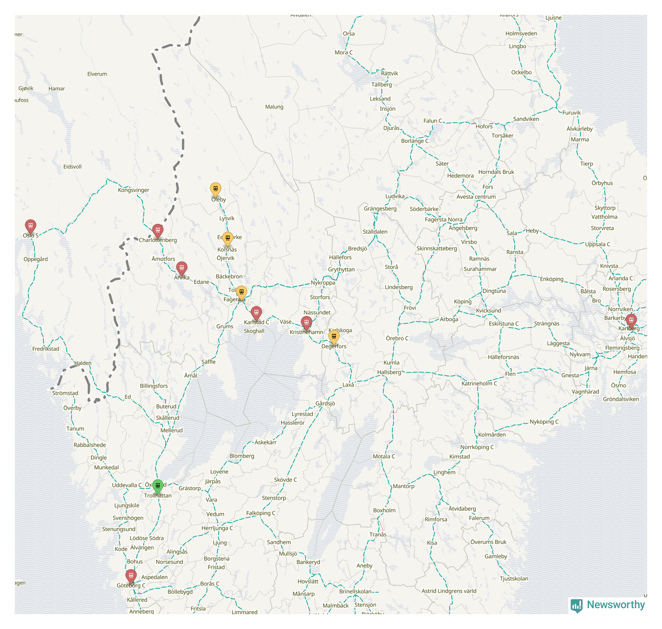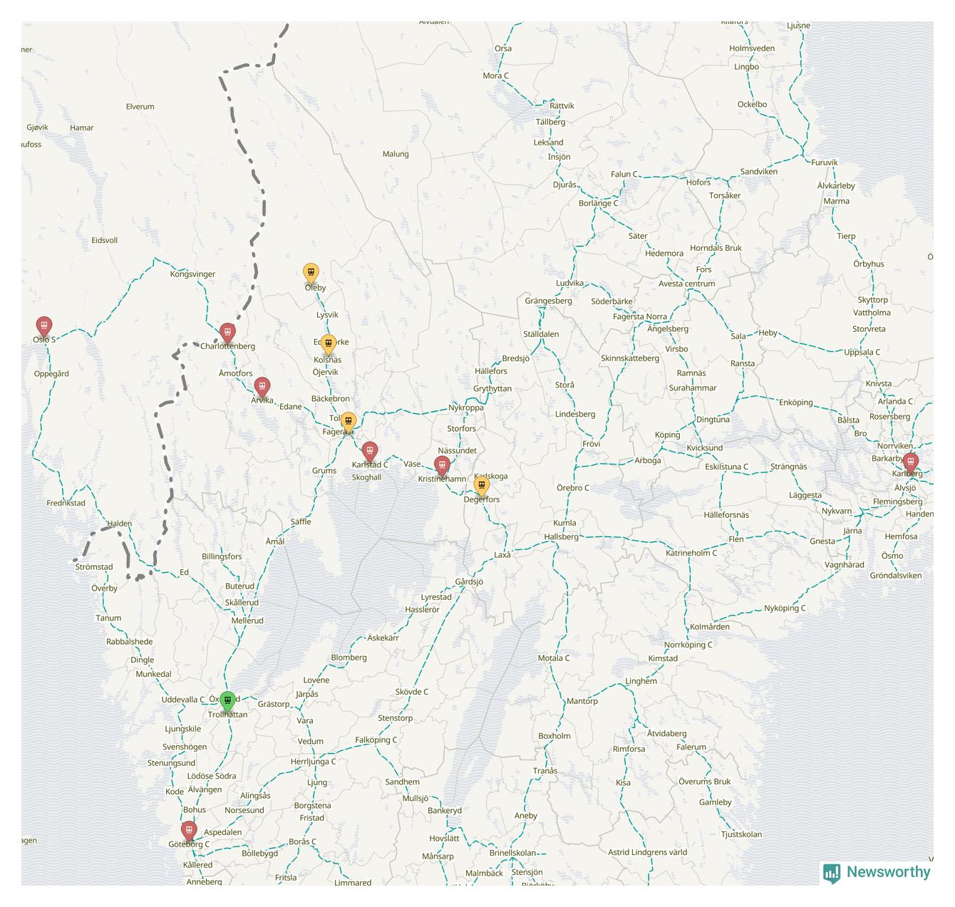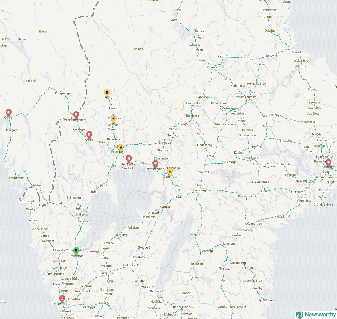 Kartdata från Mapbox, Newsworthy, OpenStreetMap och Trafikverket. Uppgifter om sträckor med passagerartrafik från jarnvag.net.