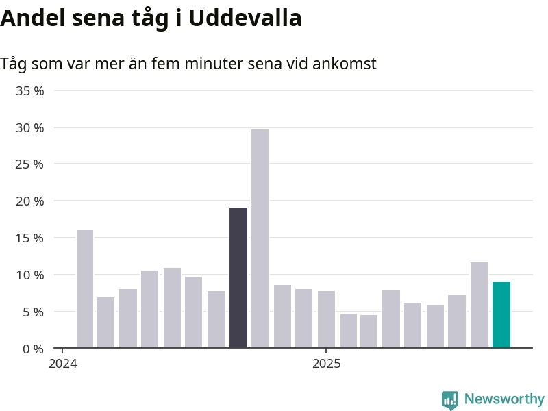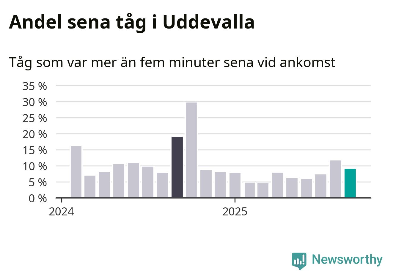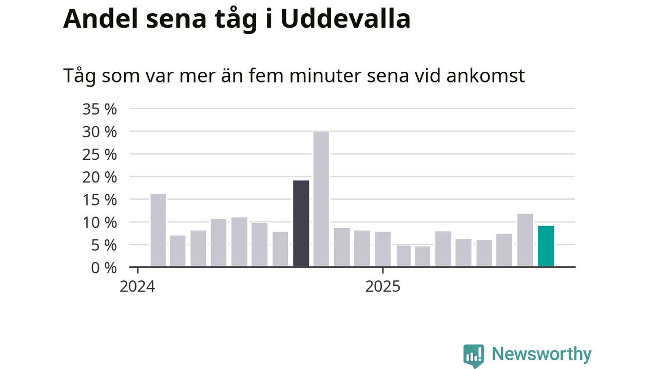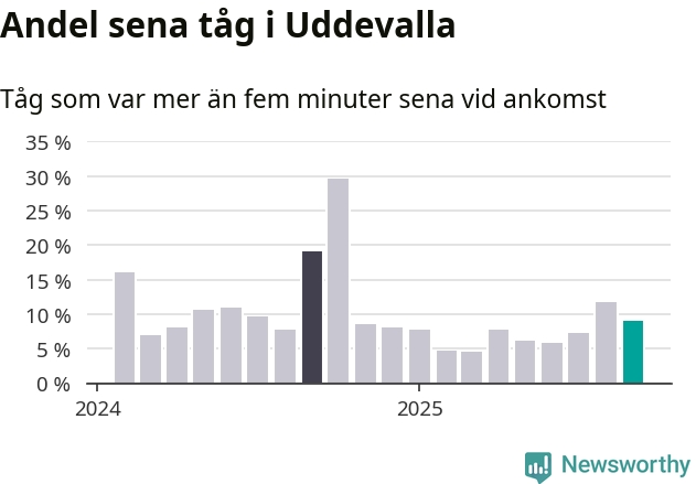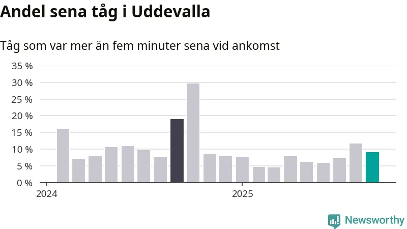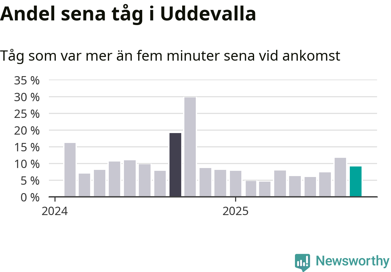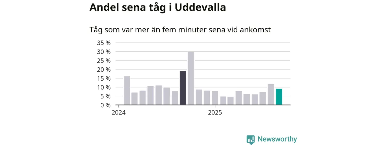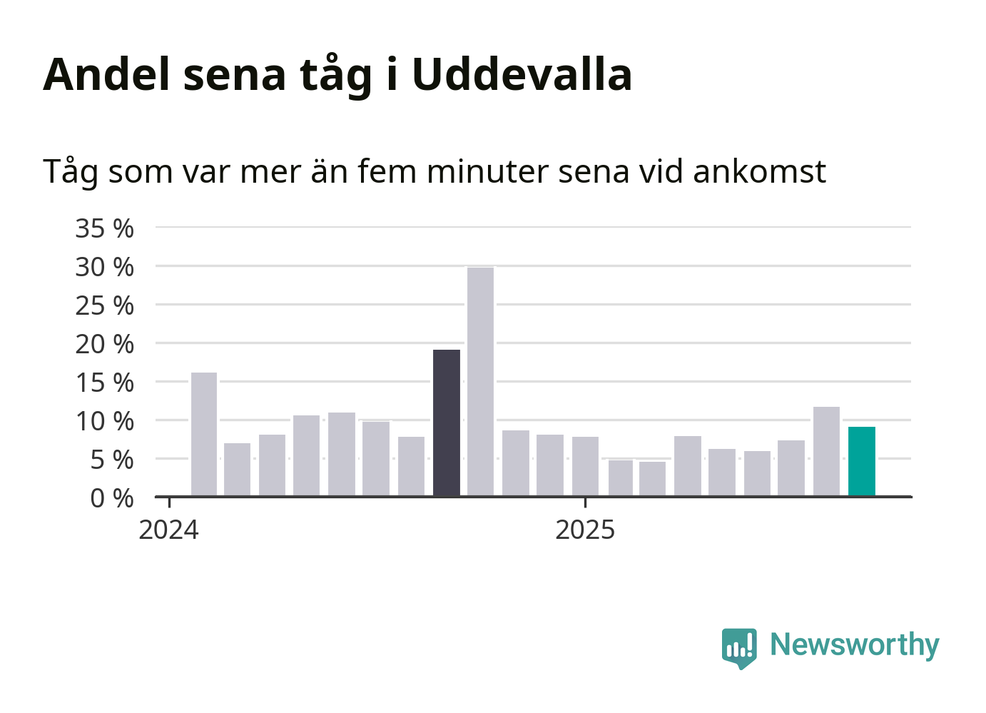 Nio procent kan jämföras med tolv procent månaden innan, och 19 procent i september 2024. Siffrorna bygger på realtidsinformation om tågavgångar och ankomster från Trafikverket, som Newsworthy löpande samlar in.