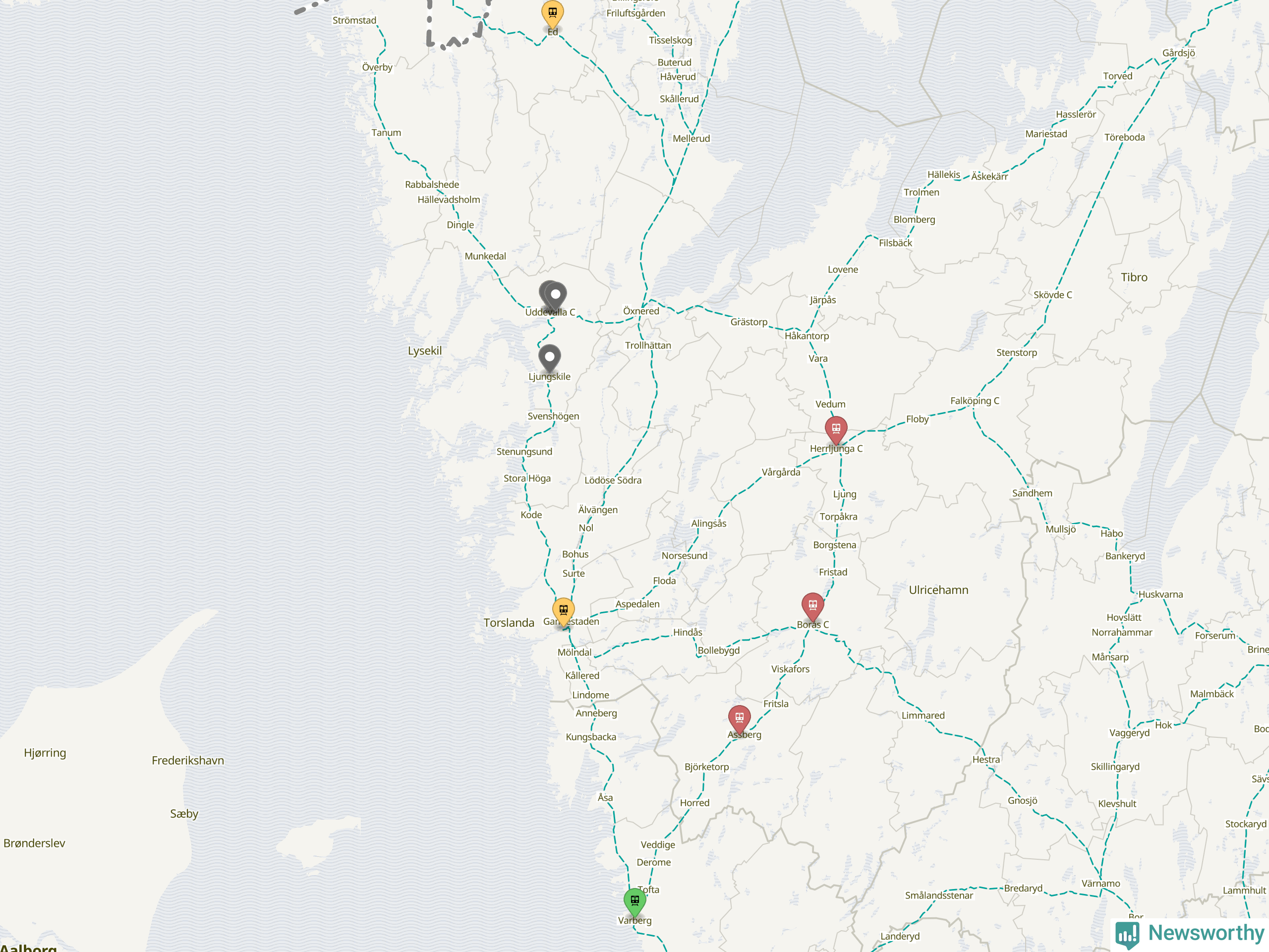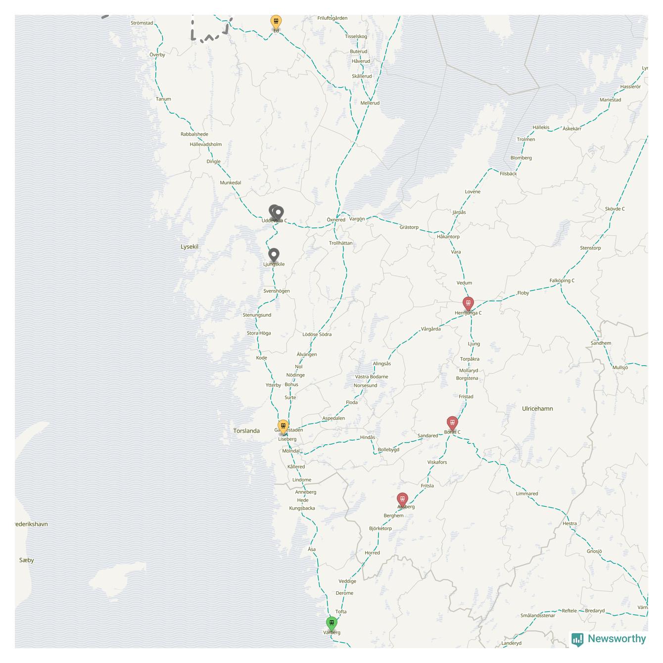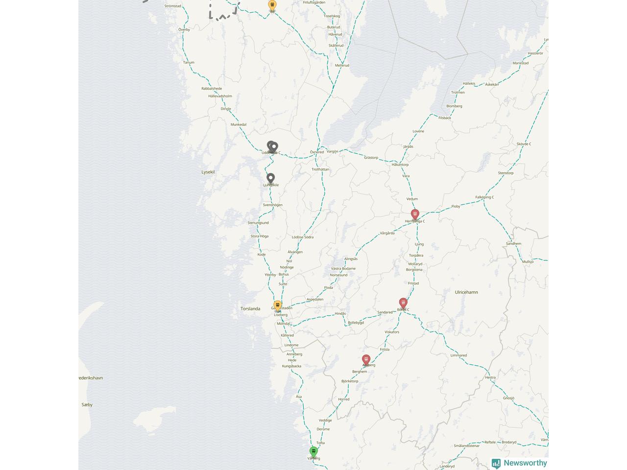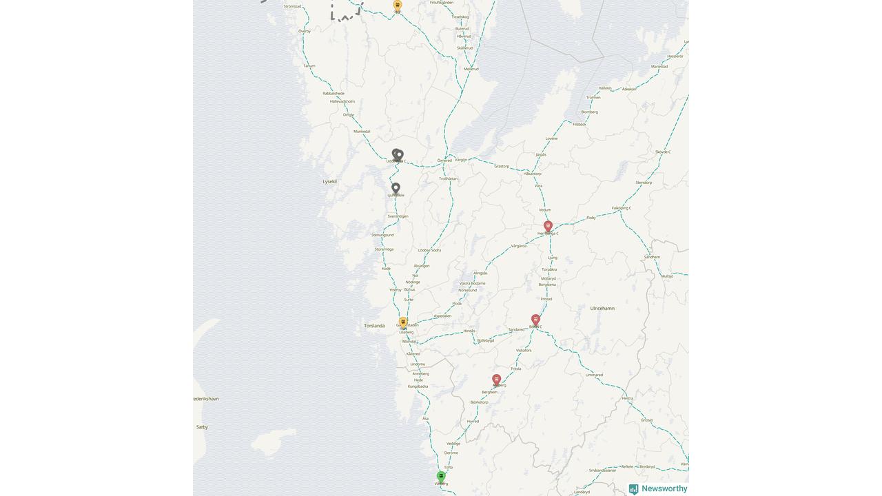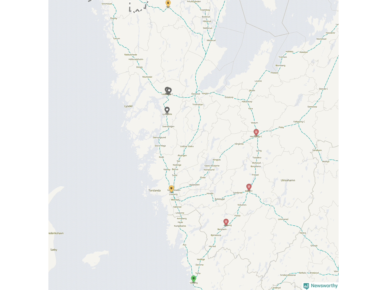 Kartdata från Mapbox, Newsworthy, OpenStreetMap och Trafikverket. Uppgifter om sträckor med passagerartrafik från jarnvag.net.