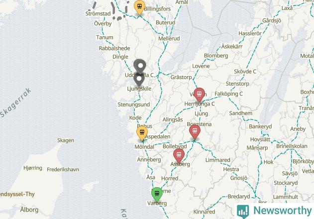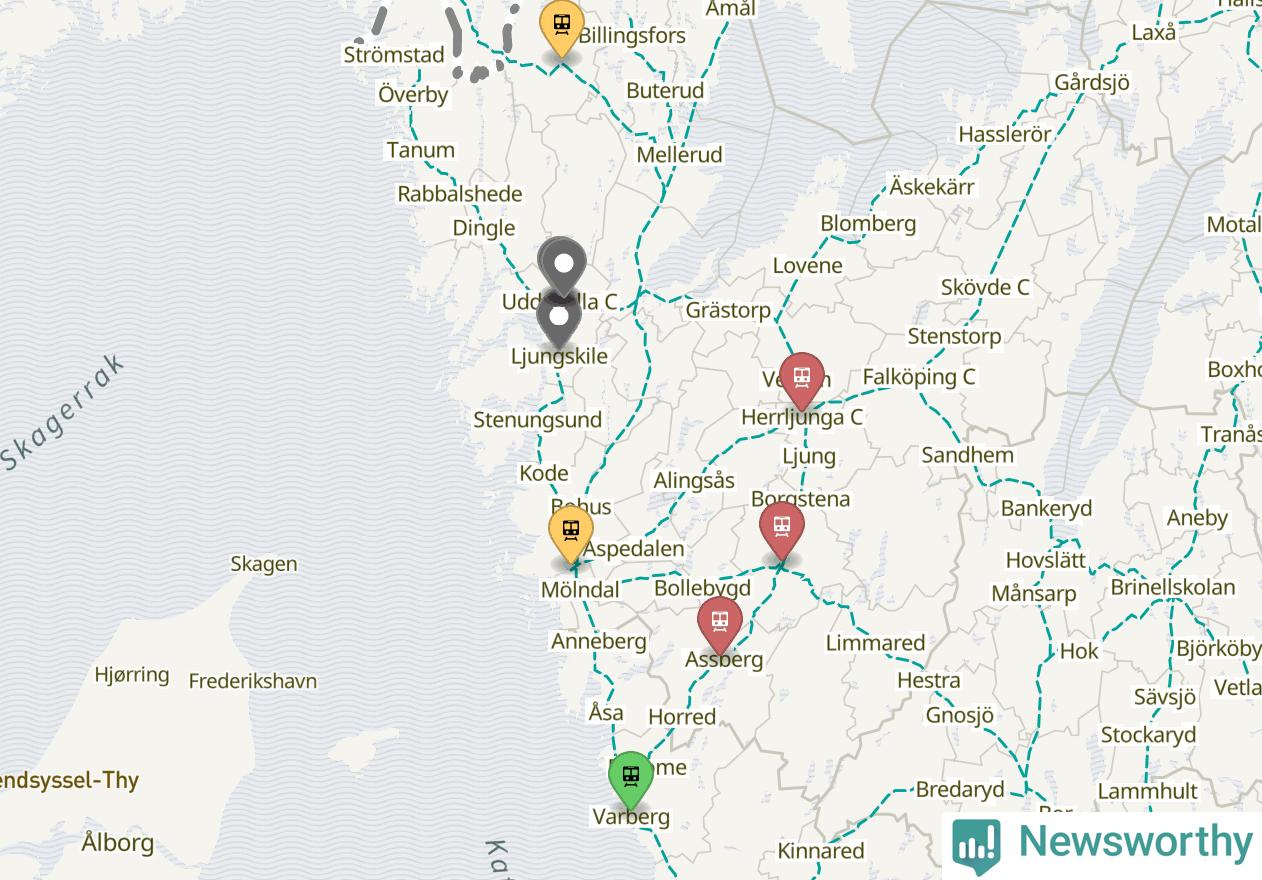 Den svenska järnvägsbranschen har ett gemensamt mål om att 95 procent av tågen ska komma fram i tid. Dit är det just nu långt. Så här sena var tågen vid stationerna i Uddevalla kommun förra månaden.