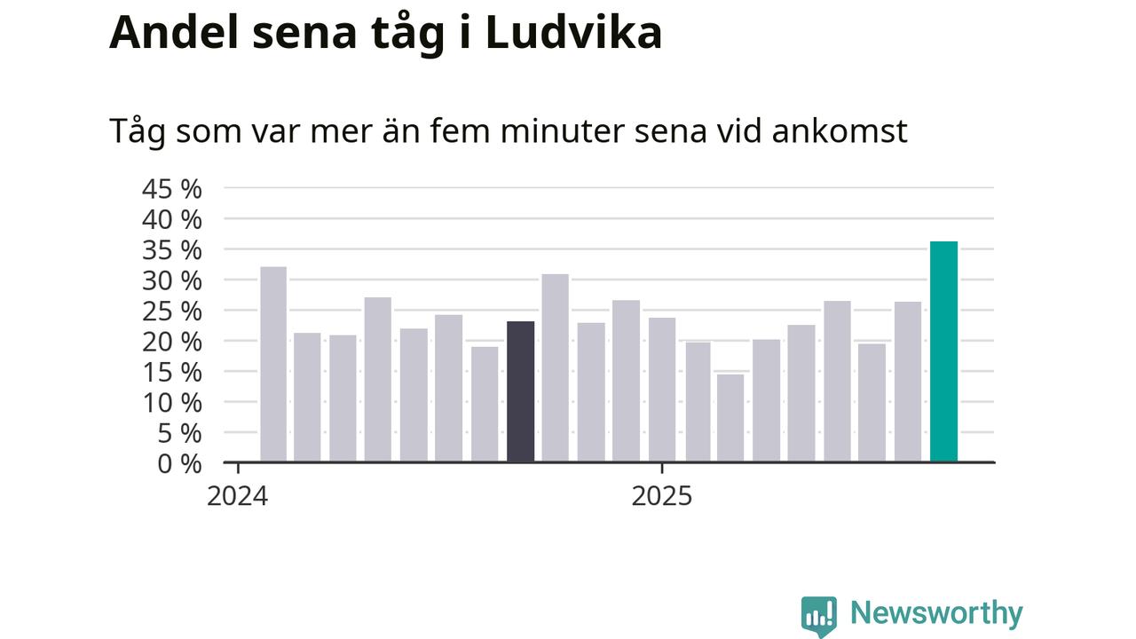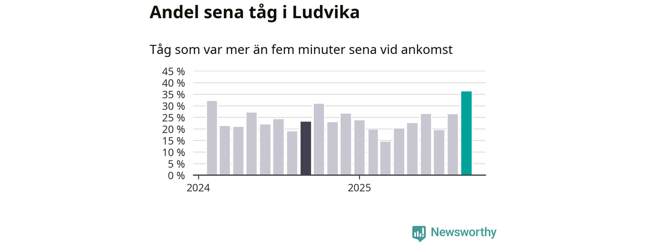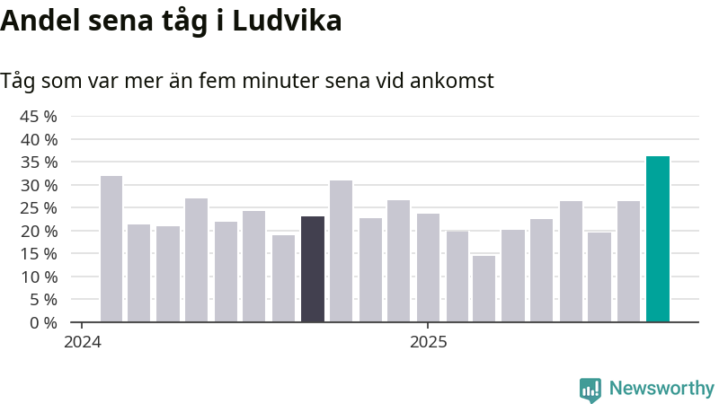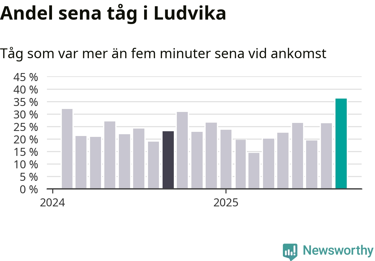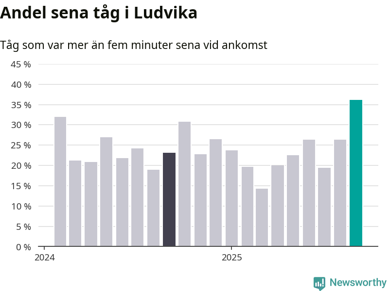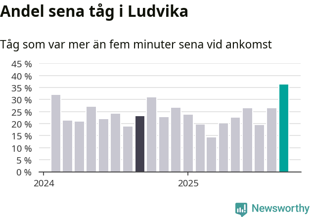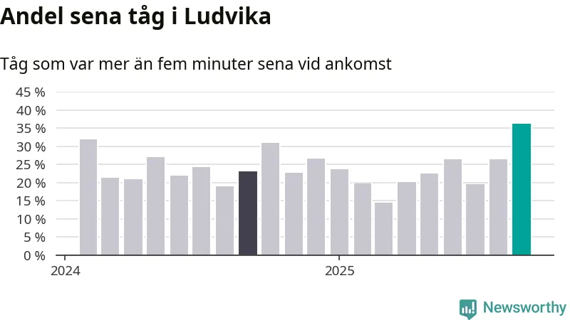 36 procent är den högsta andelen sena tåg sedan åtminstone den hårt förseningsdrabbade vintern 2023/24. Siffrorna bygger på realtidsinformation om tågavgångar och ankomster från Trafikverket, som Newsworthy löpande samlar in.