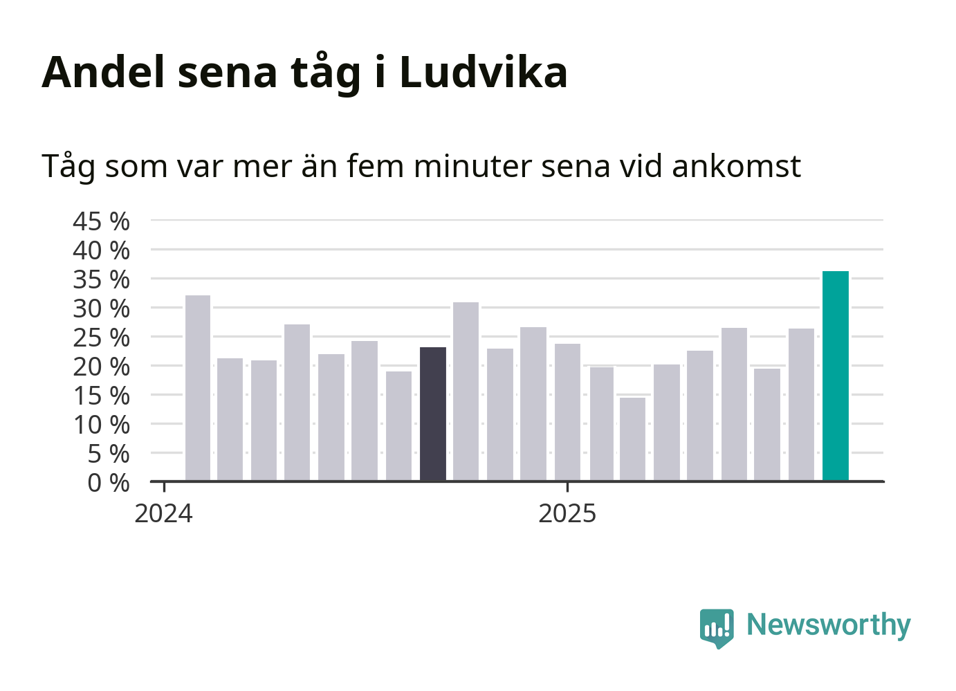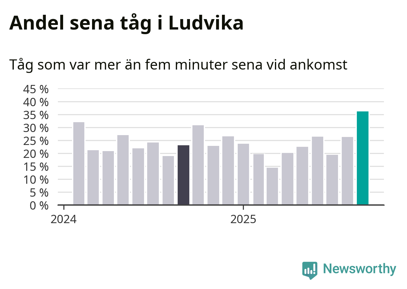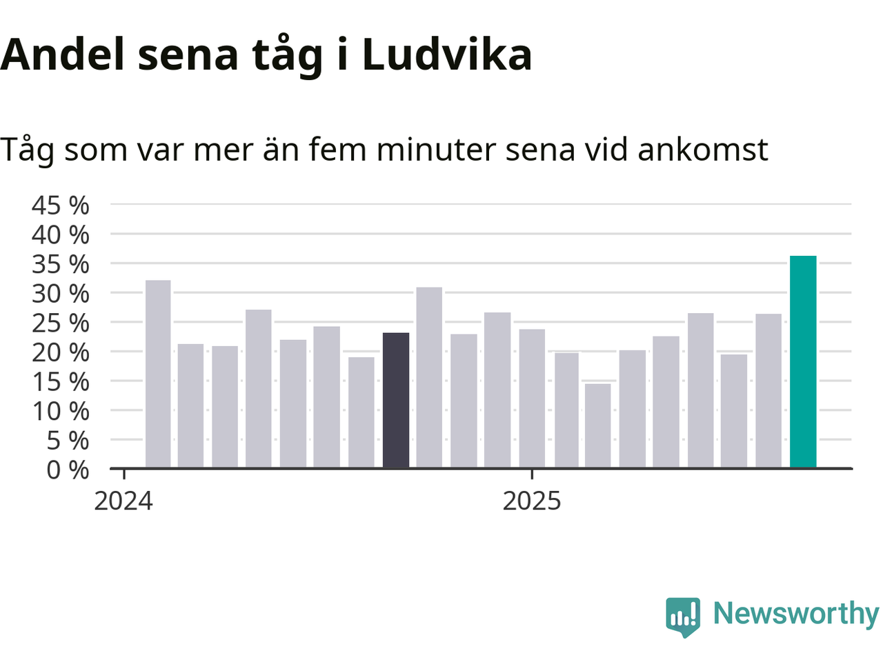 36 procent är den högsta andelen sena tåg sedan åtminstone den hårt förseningsdrabbade vintern 2023/24. Siffrorna bygger på realtidsinformation om tågavgångar och ankomster från Trafikverket, som Newsworthy löpande samlar in.