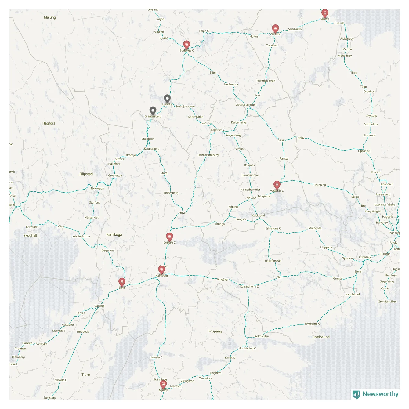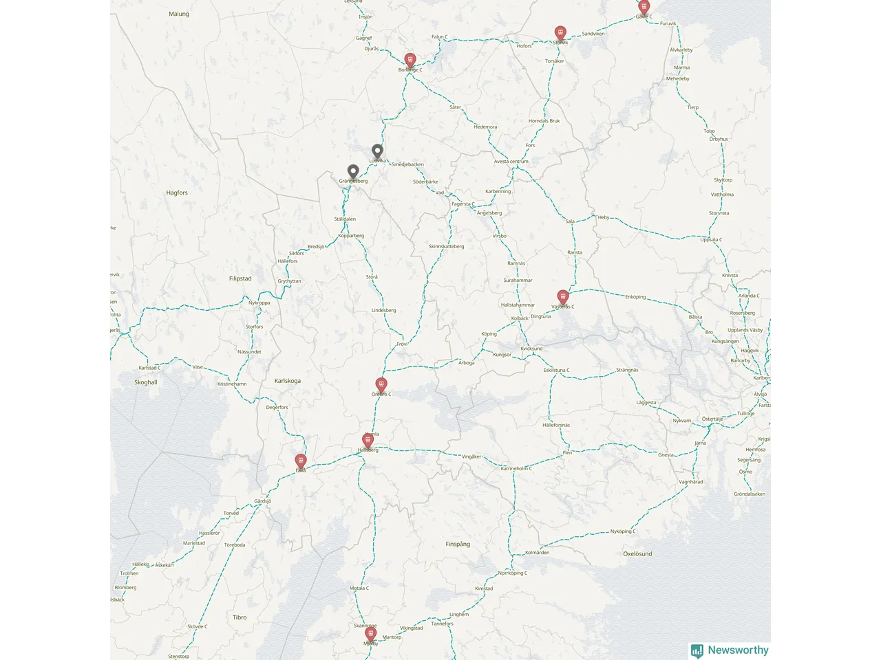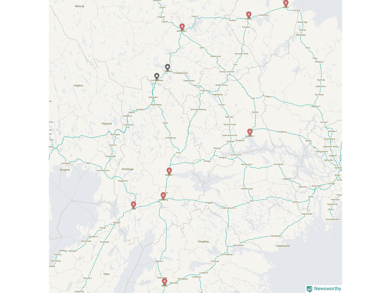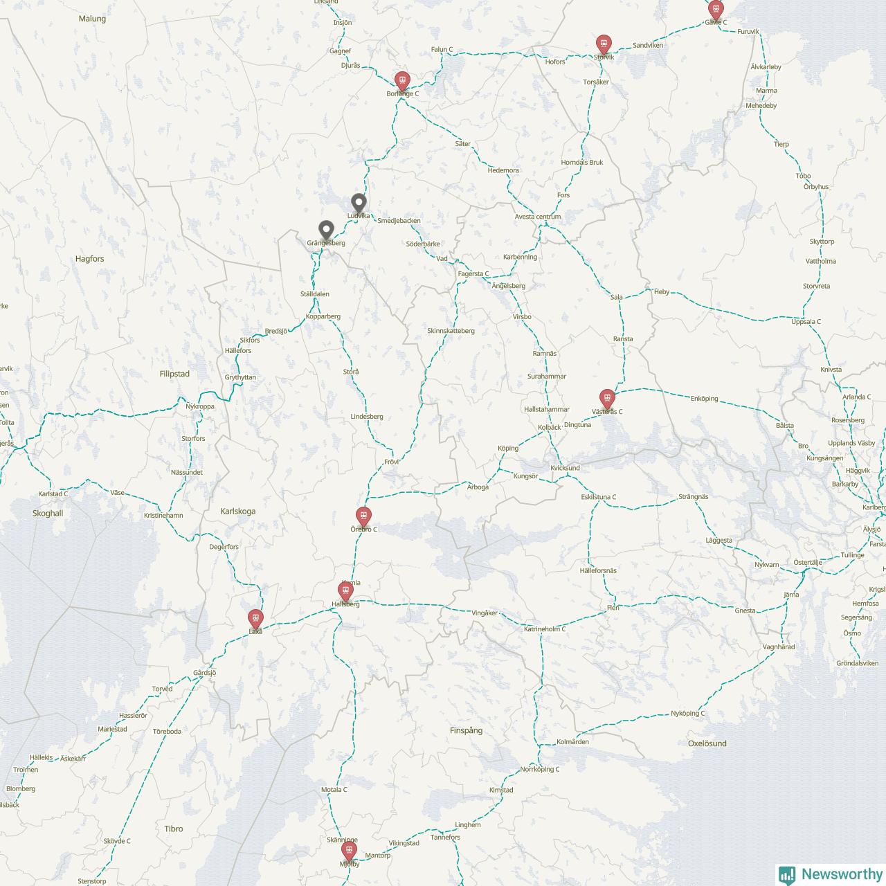 Kartdata från Mapbox, Newsworthy, OpenStreetMap och Trafikverket. Uppgifter om sträckor med passagerartrafik från jarnvag.net.