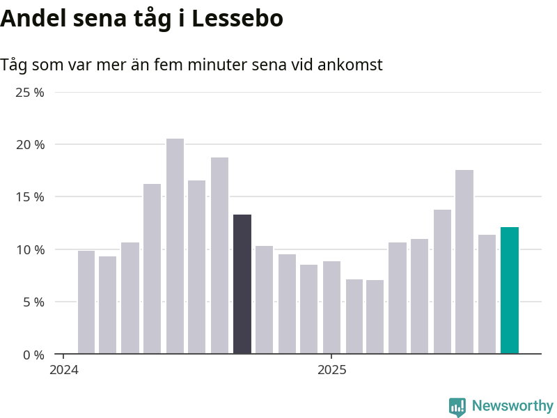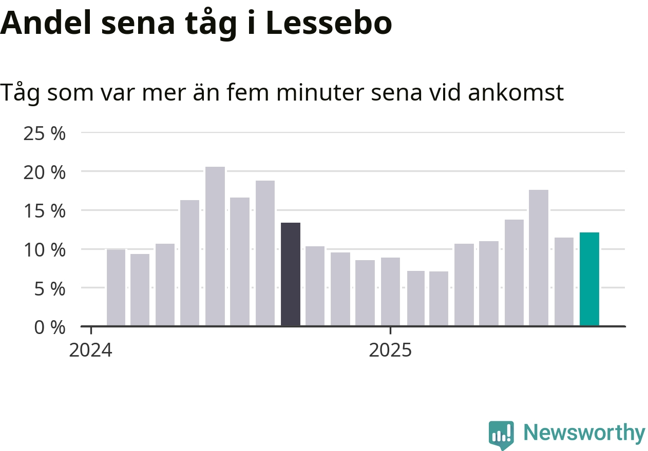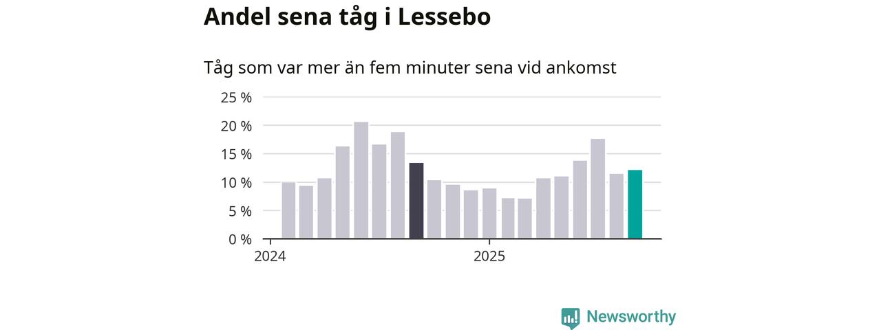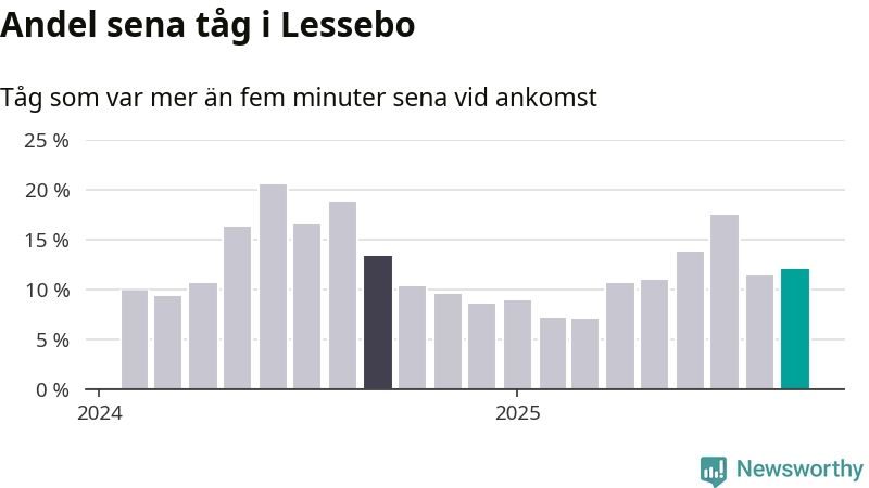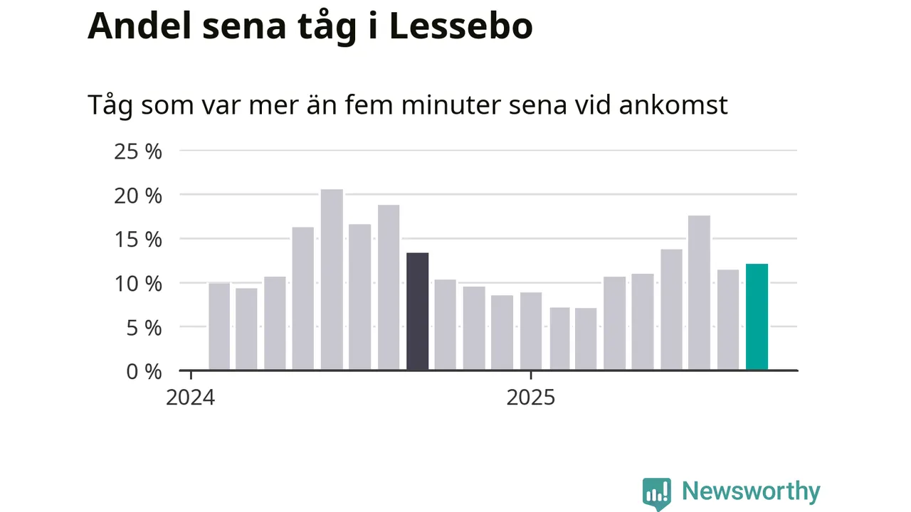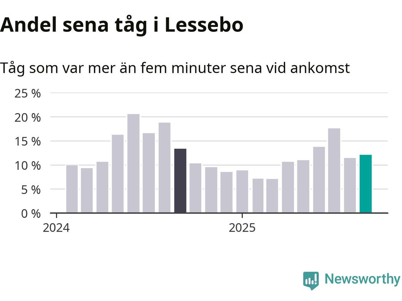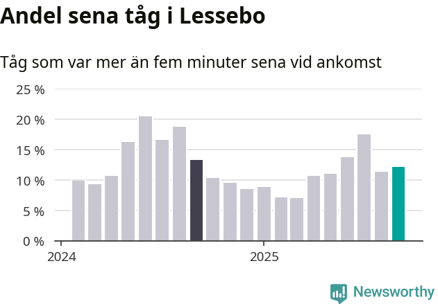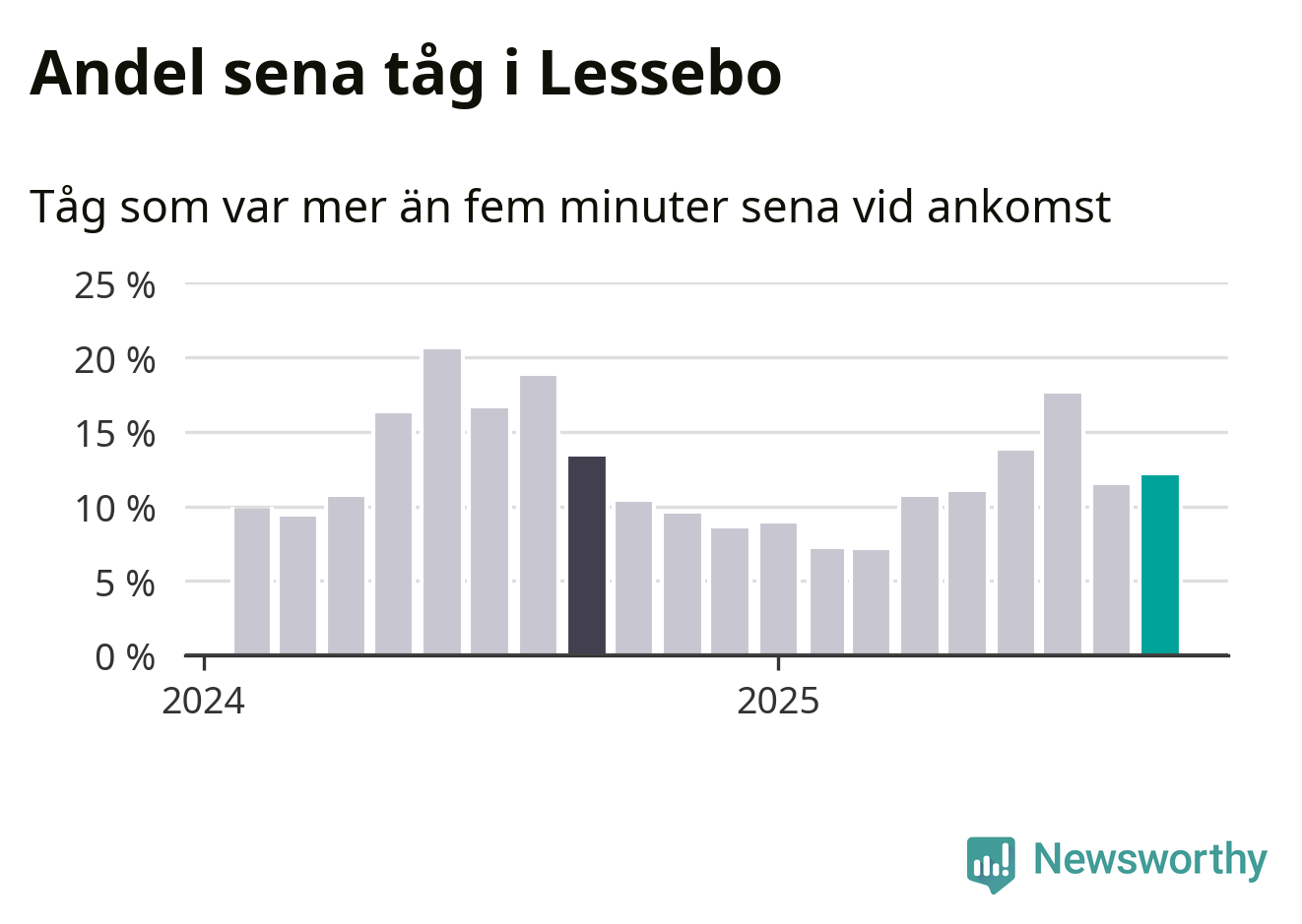 Tolv procent kan jämföras med elva procent månaden innan, och 13 procent i september 2024. Siffrorna bygger på realtidsinformation om tågavgångar och ankomster från Trafikverket, som Newsworthy löpande samlar in.