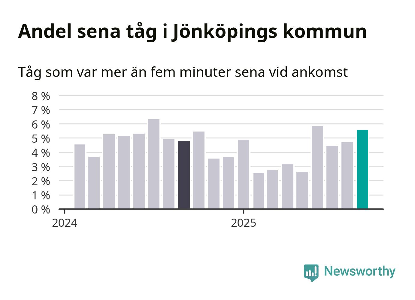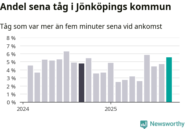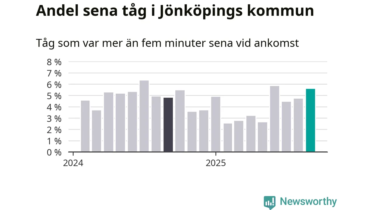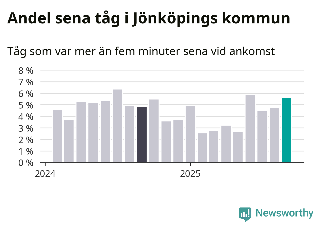 Sex procent kan jämföras med fem procent månaden innan, och fem procent i september 2024. Siffrorna bygger på realtidsinformation om tågavgångar och ankomster från Trafikverket, som Newsworthy löpande samlar in.