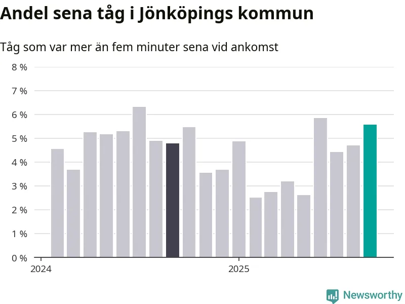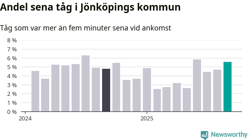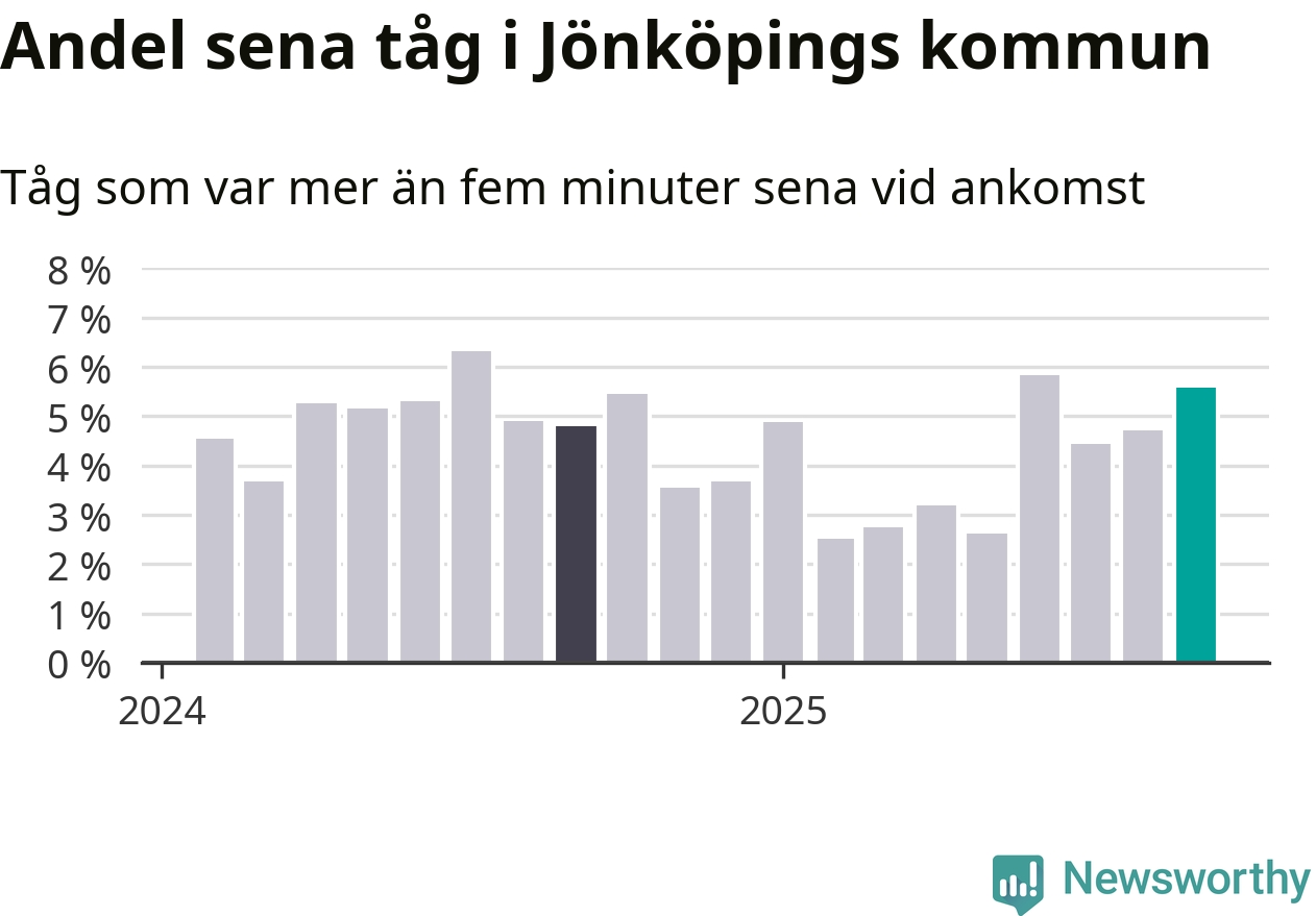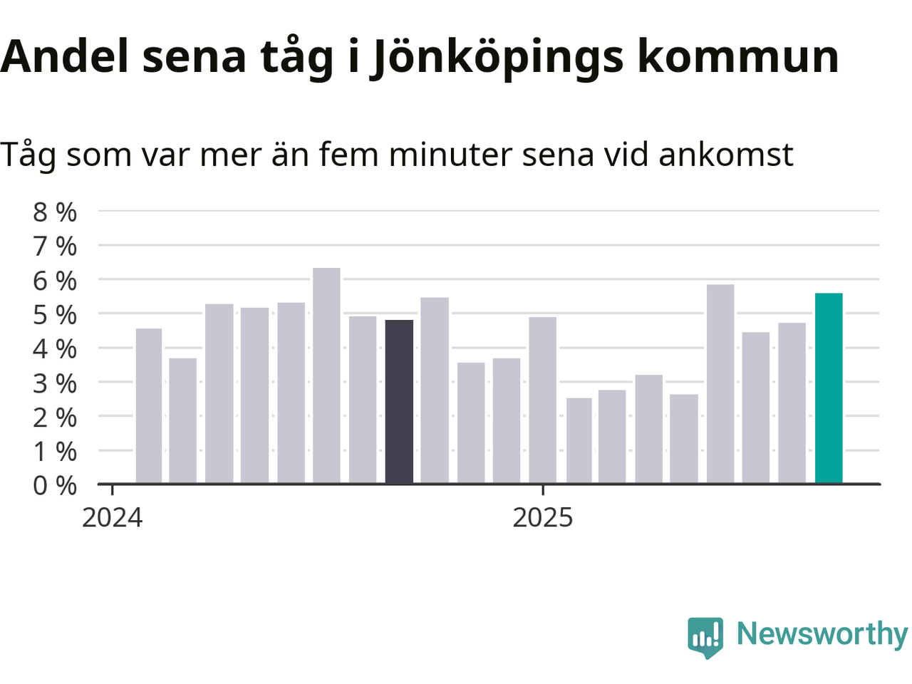 Sex procent kan jämföras med fem procent månaden innan, och fem procent i september 2024. Siffrorna bygger på realtidsinformation om tågavgångar och ankomster från Trafikverket, som Newsworthy löpande samlar in.