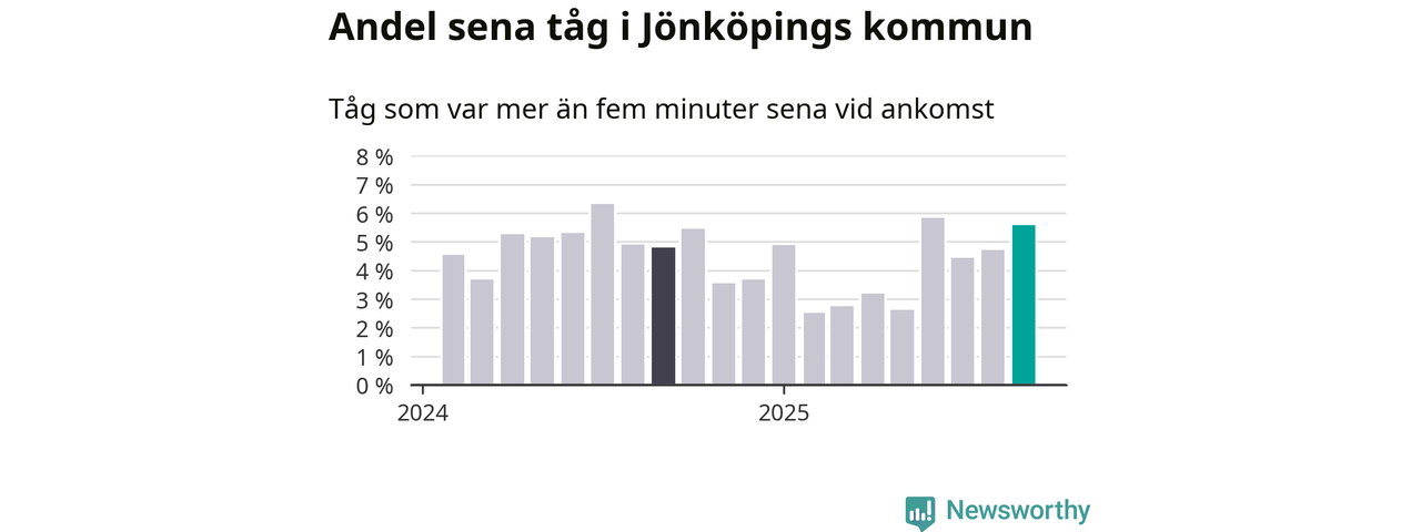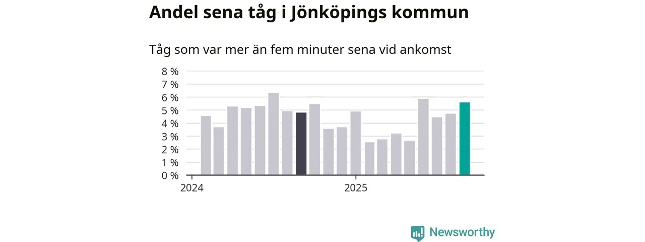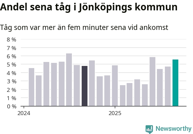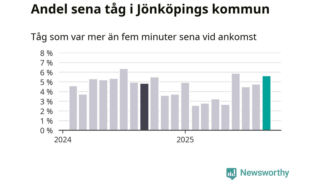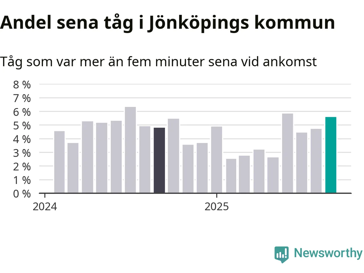 Av drygt 2 500 tåg som passerade någon av stationerna i Jönköpings kommun i september var 142 mer än fem minuter sena. Det motsvarar 6 procent.