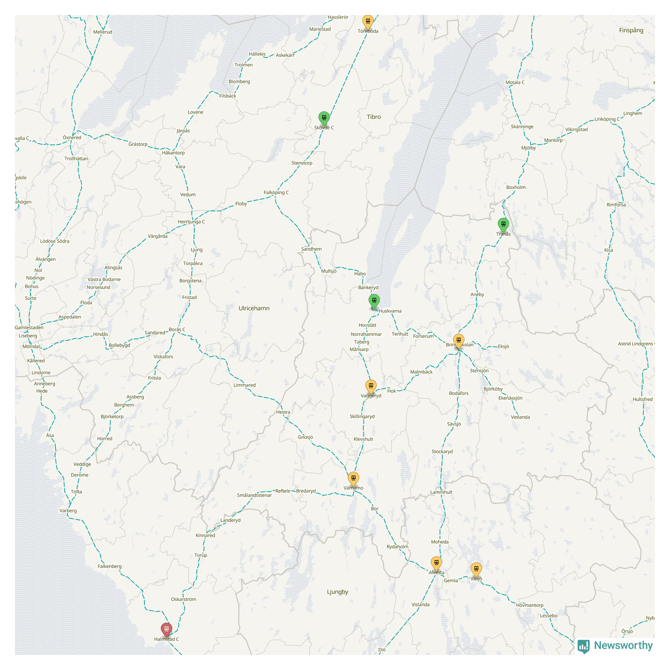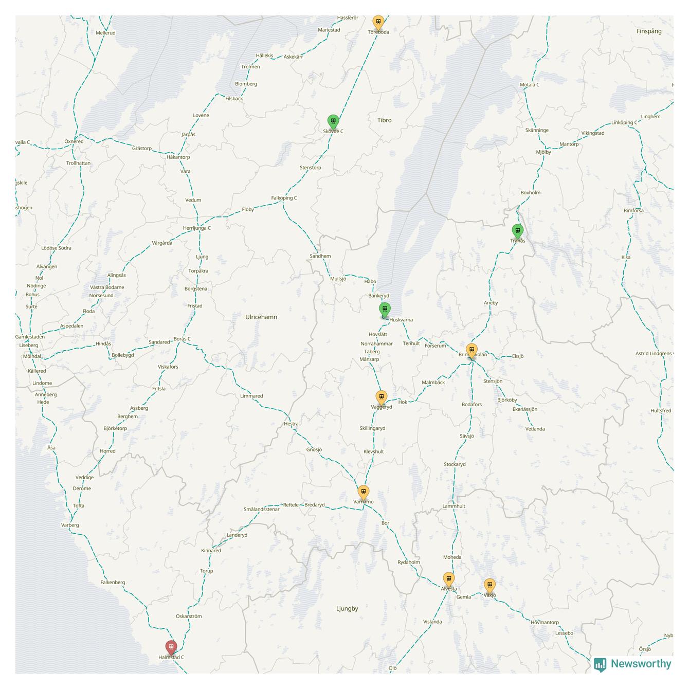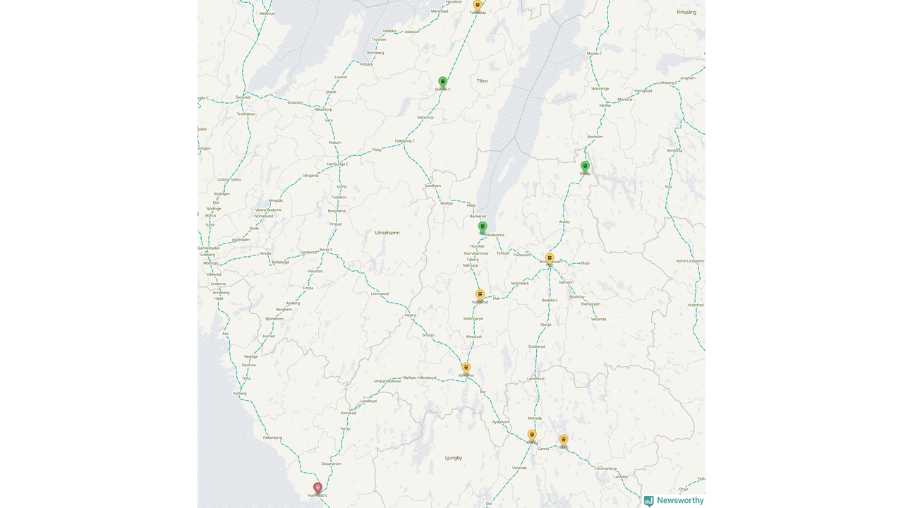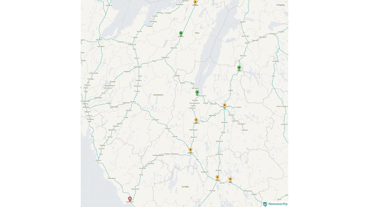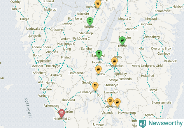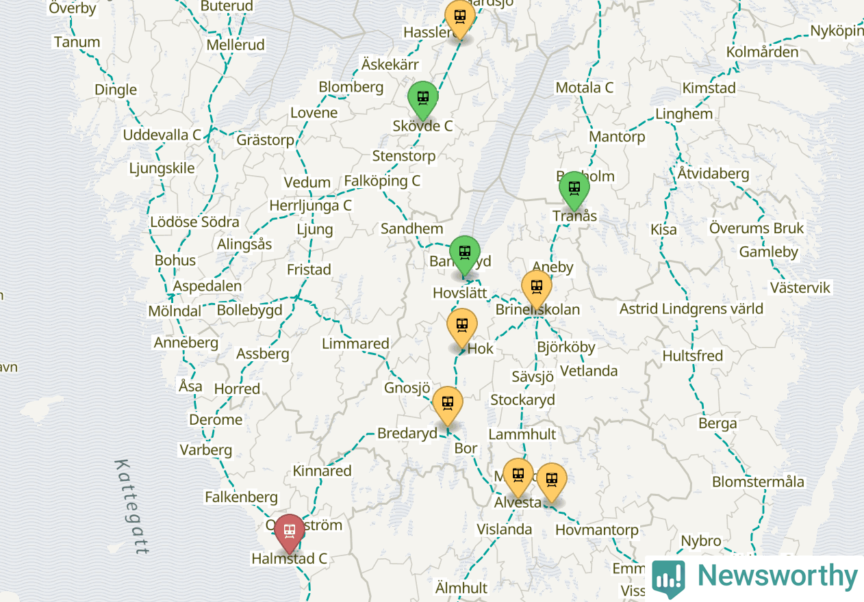 Kartdata från Mapbox, Newsworthy, OpenStreetMap och Trafikverket. Uppgifter om sträckor med passagerartrafik från jarnvag.net.