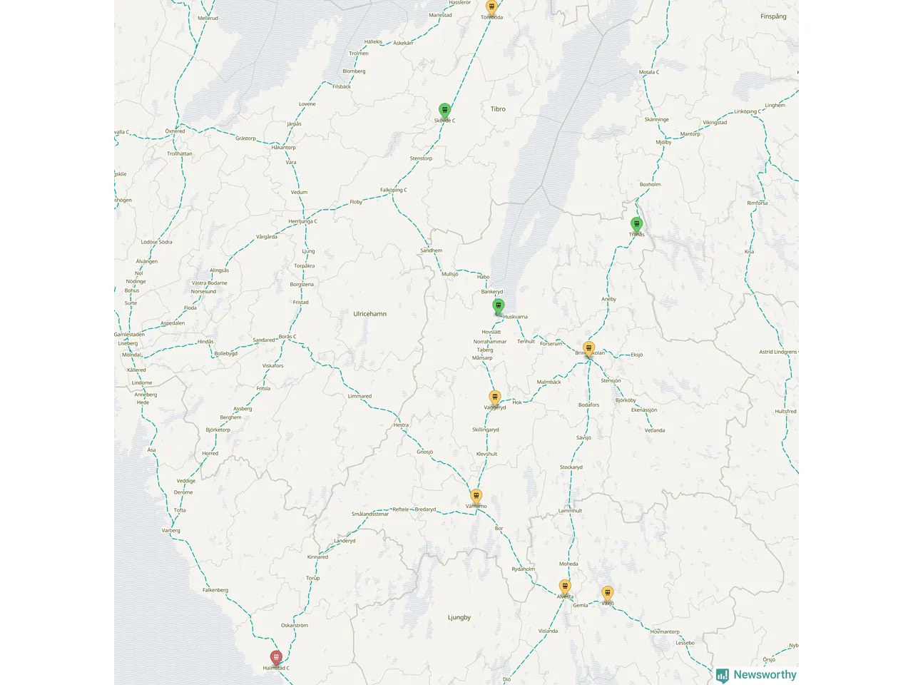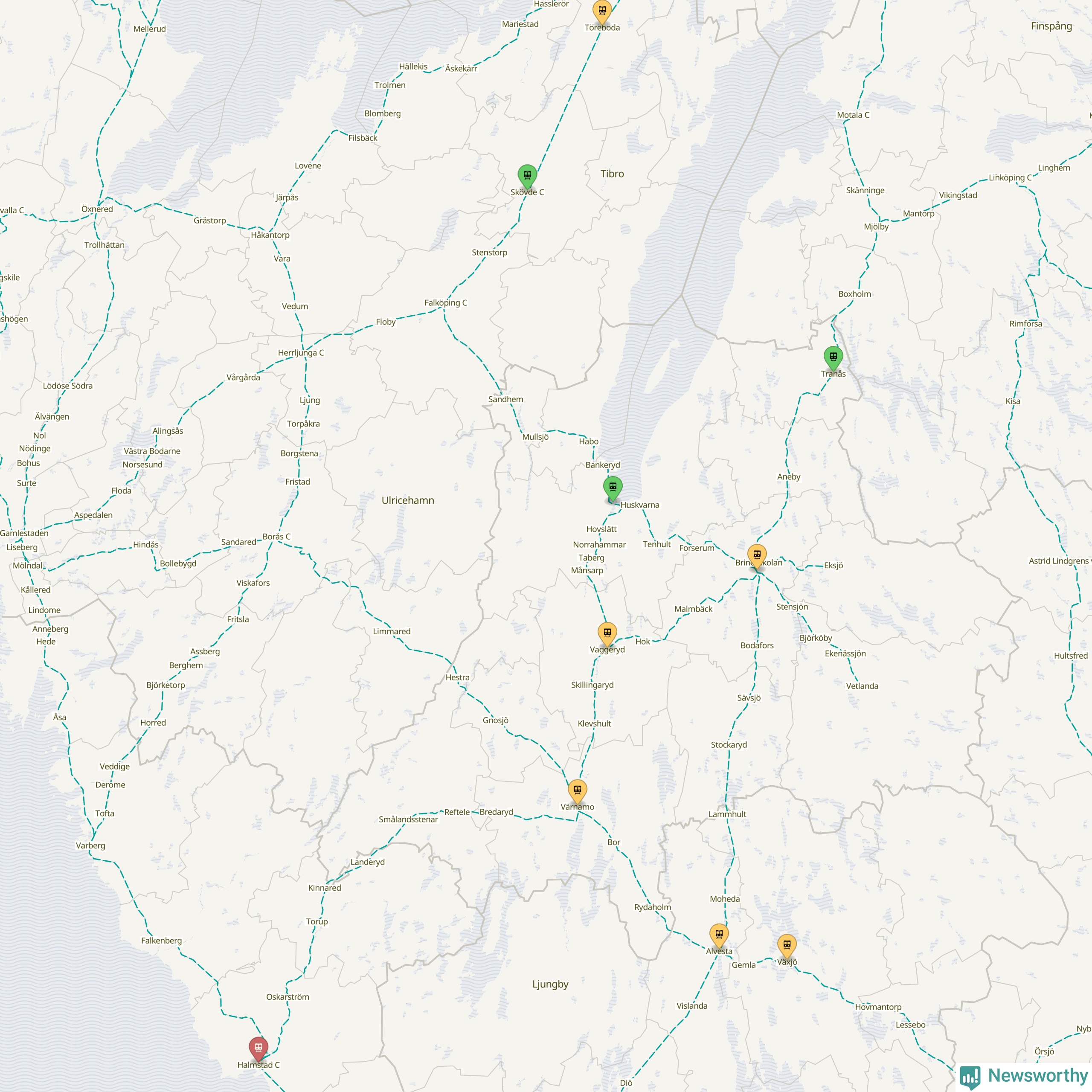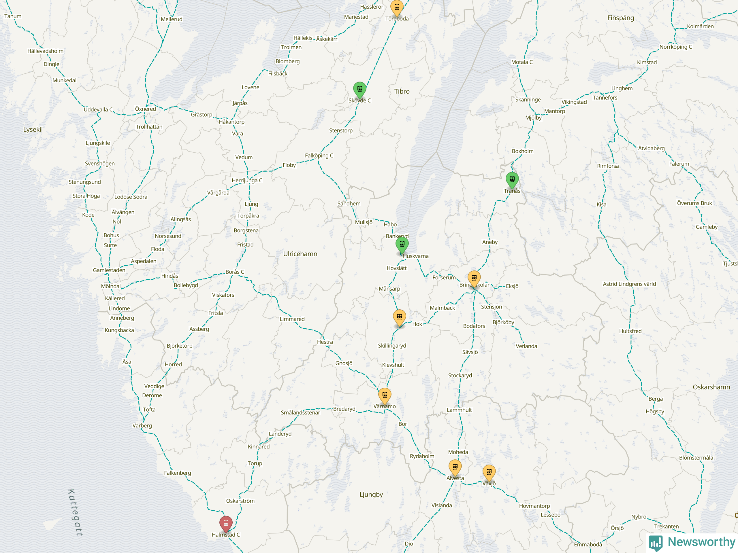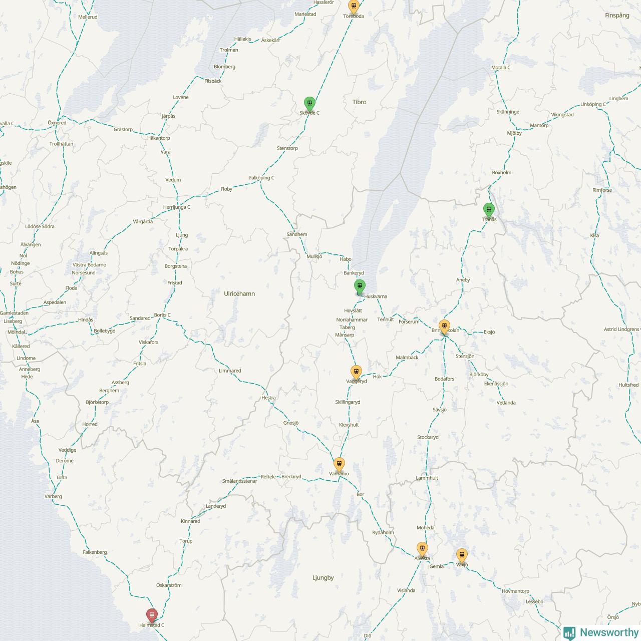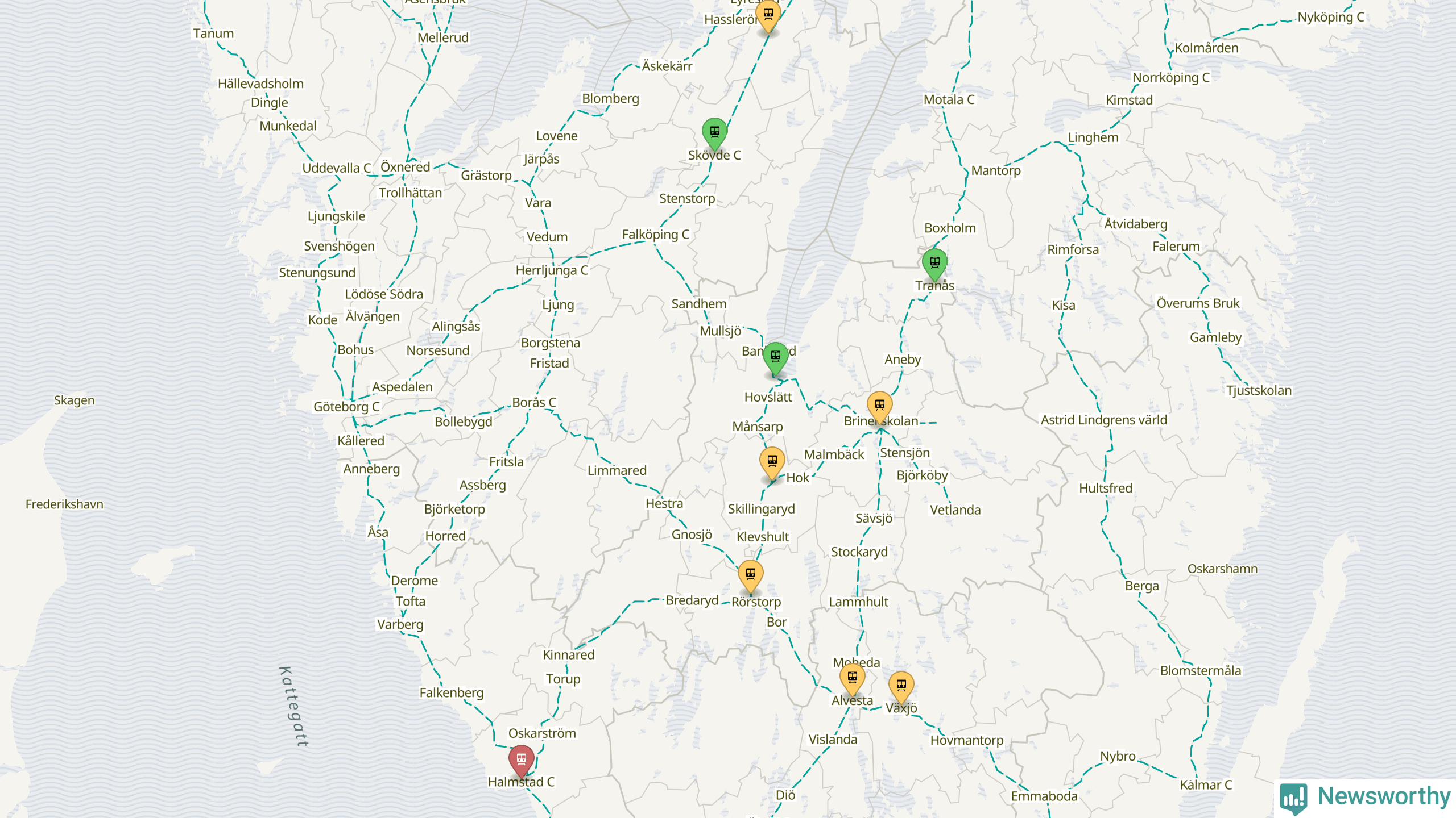 Kartdata från Mapbox, Newsworthy, OpenStreetMap och Trafikverket. Uppgifter om sträckor med passagerartrafik från jarnvag.net.