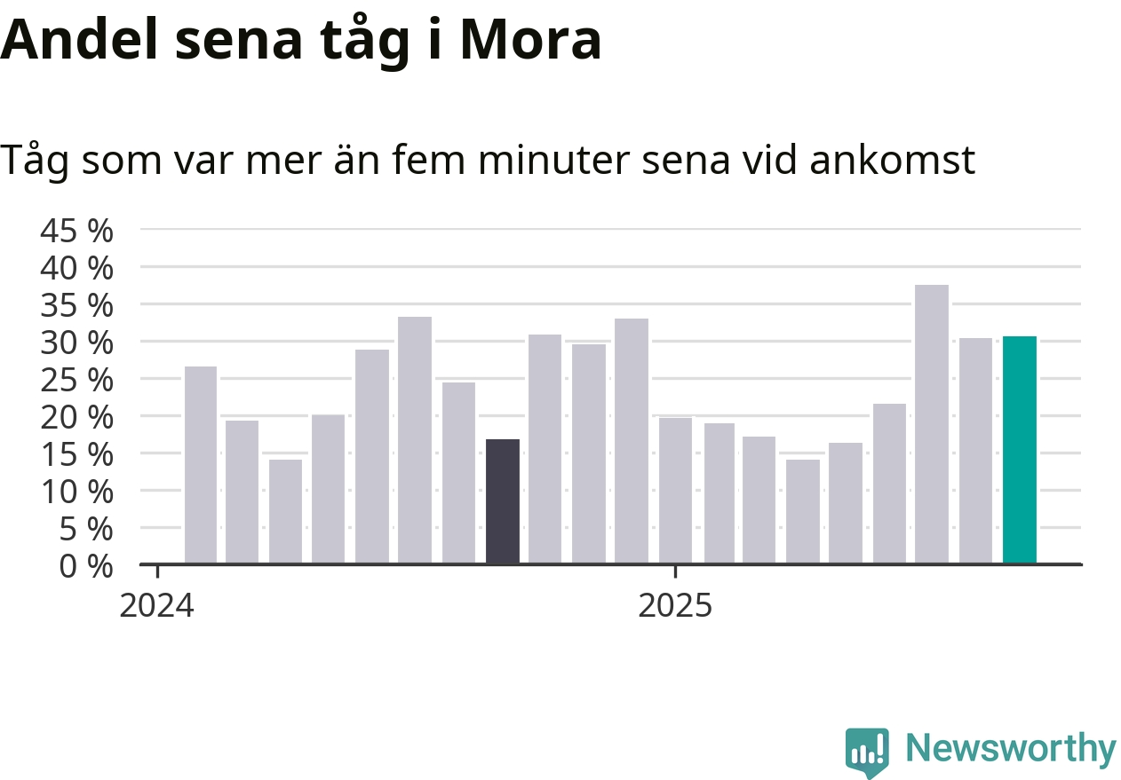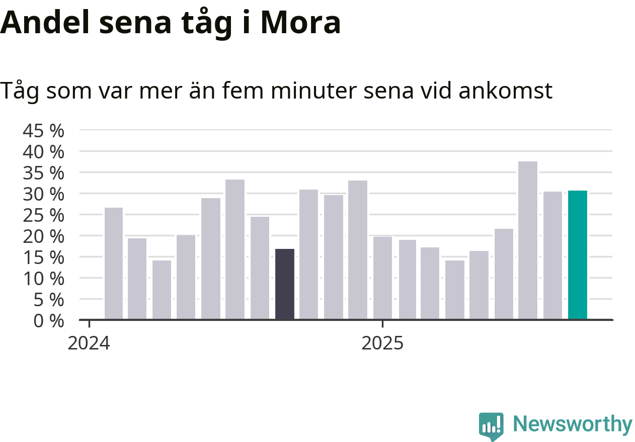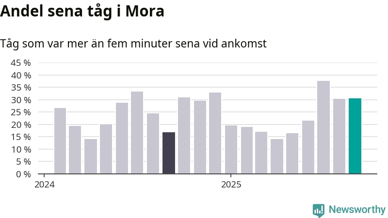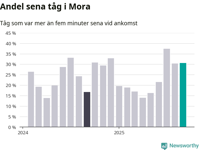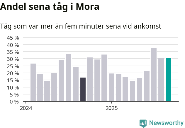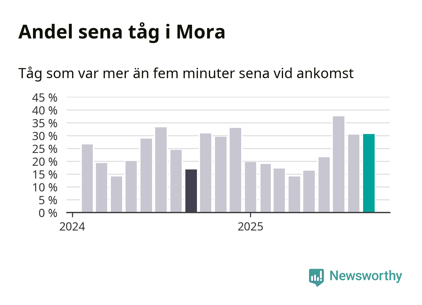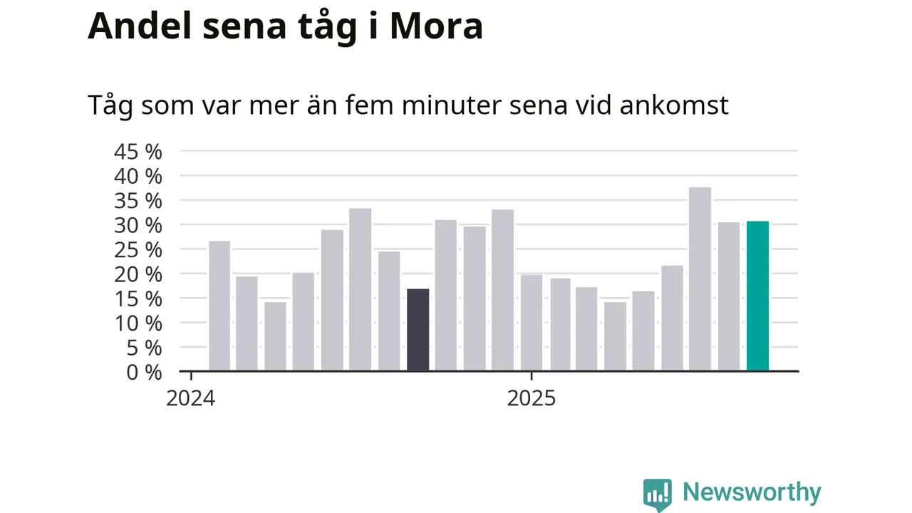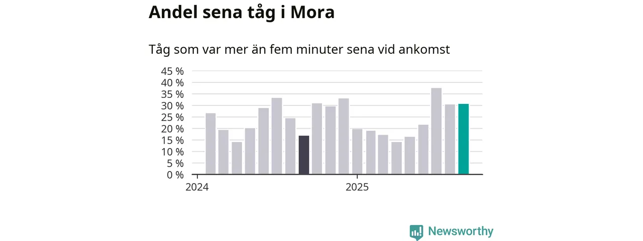 31 procent kan jämföras med 30 procent månaden innan, och 17 procent i september 2024. Siffrorna bygger på realtidsinformation om tågavgångar och ankomster från Trafikverket, som Newsworthy löpande samlar in.
