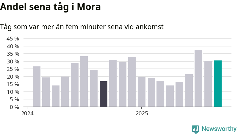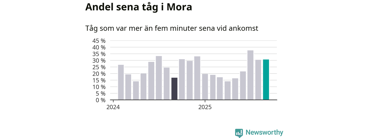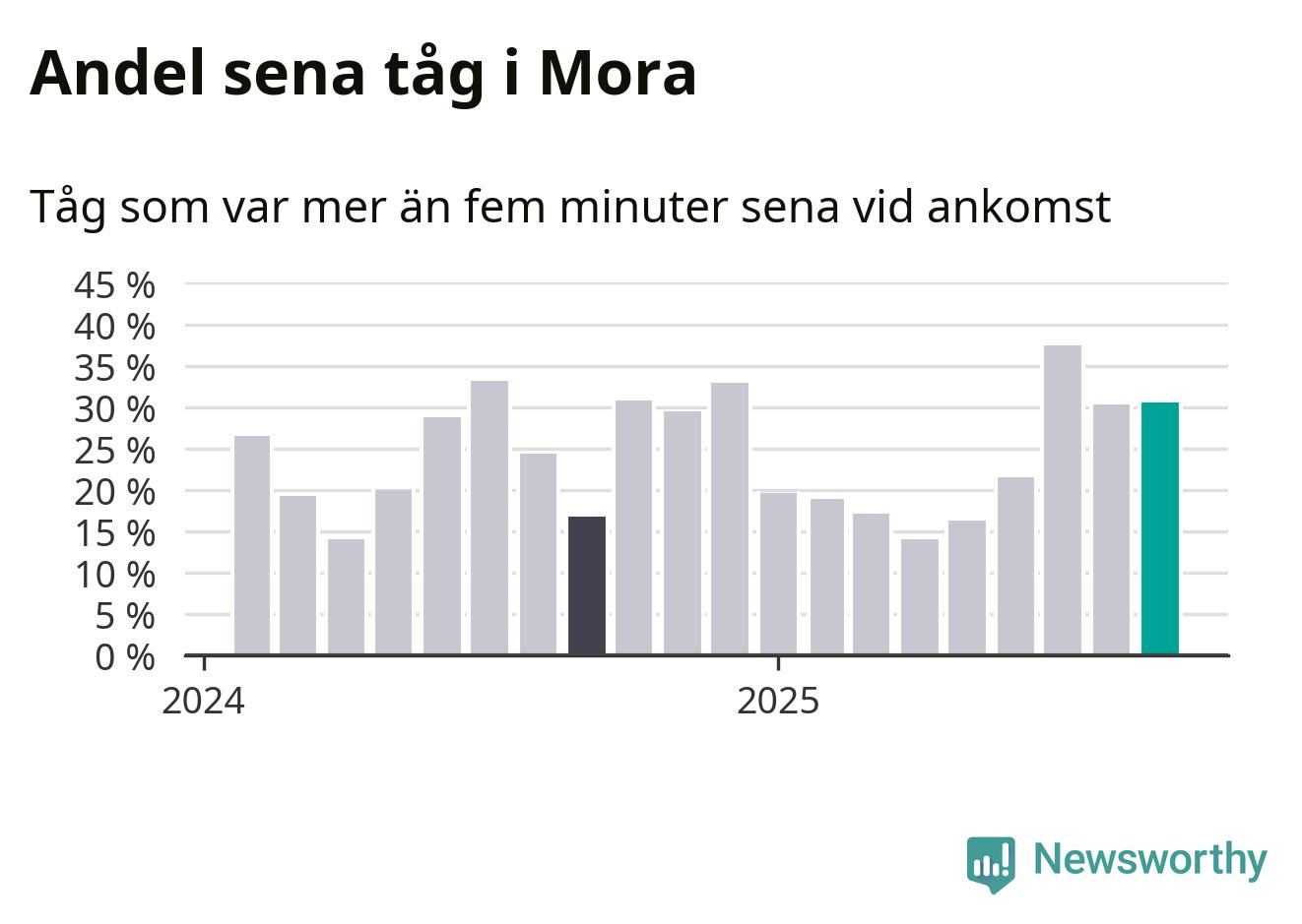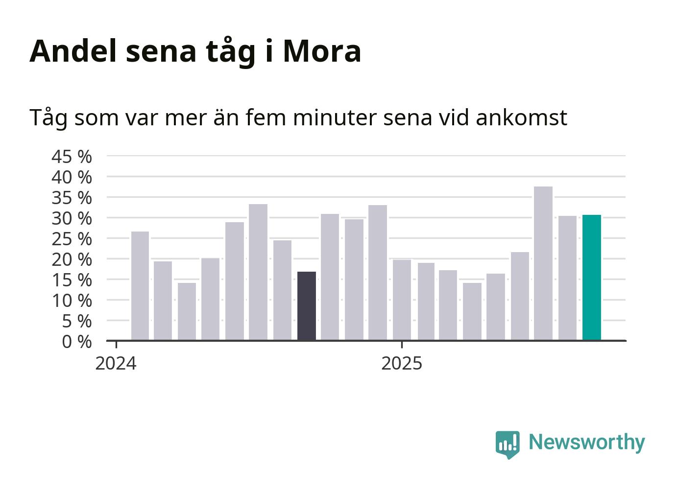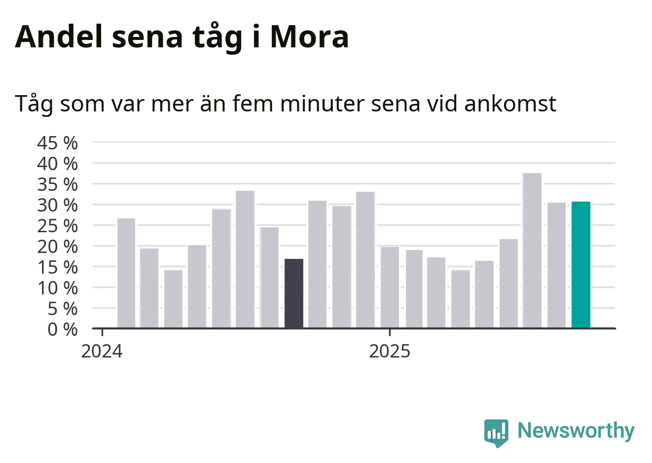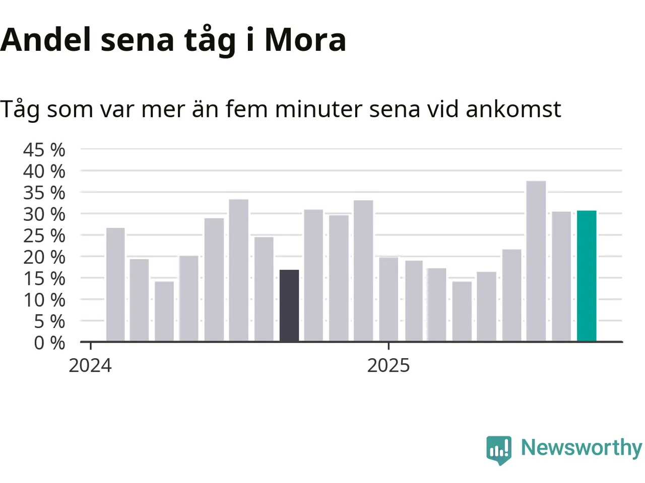 Av omkring 400 tåg som passerade någon av stationerna i Mora kommun i september var 123 mer än fem minuter sena. Det motsvarar 31 procent, en bra bit över den nationella målsättningen som säger att inte mer än fem procent av tågen ska vara sena.