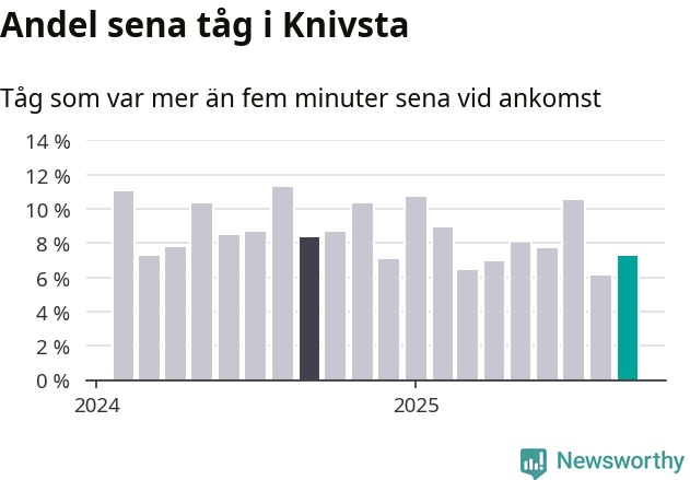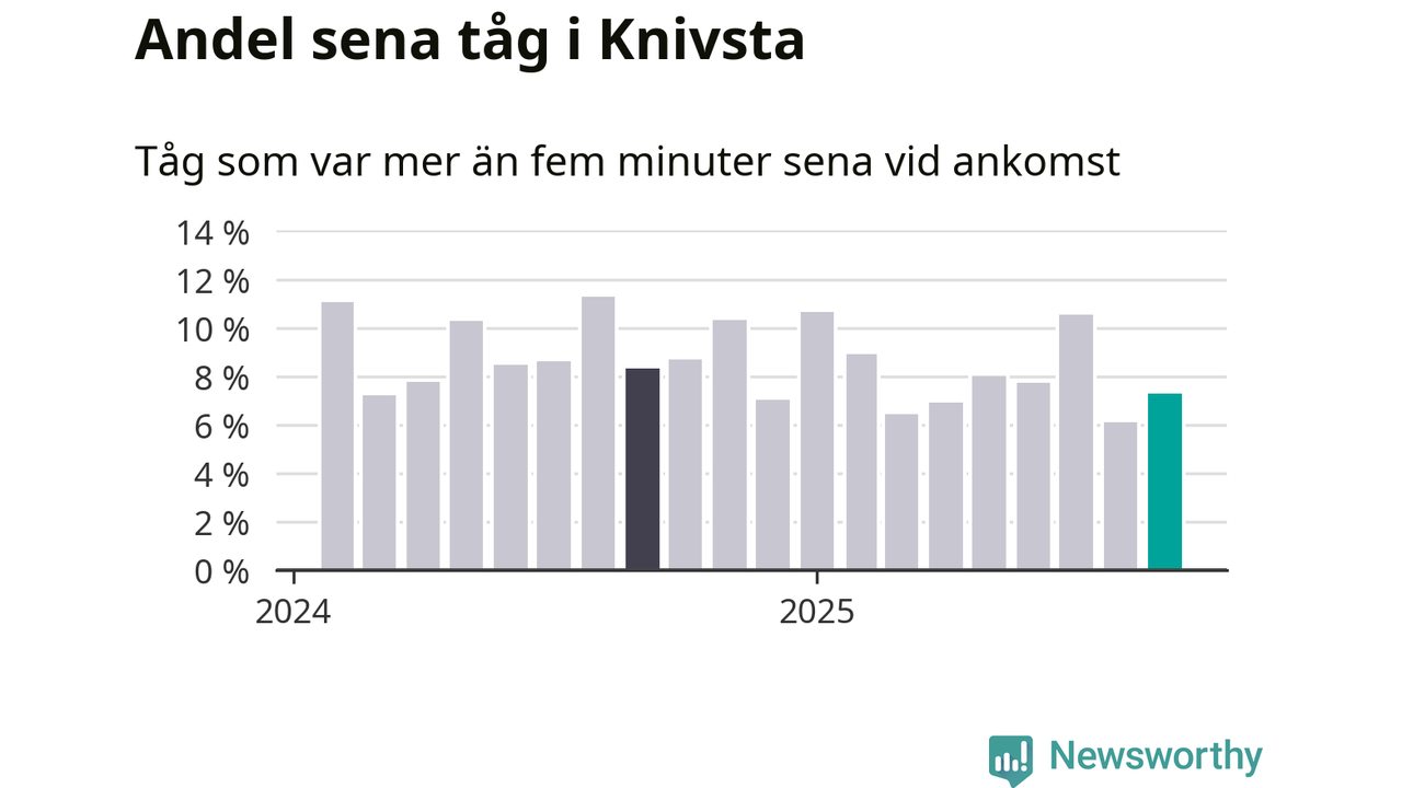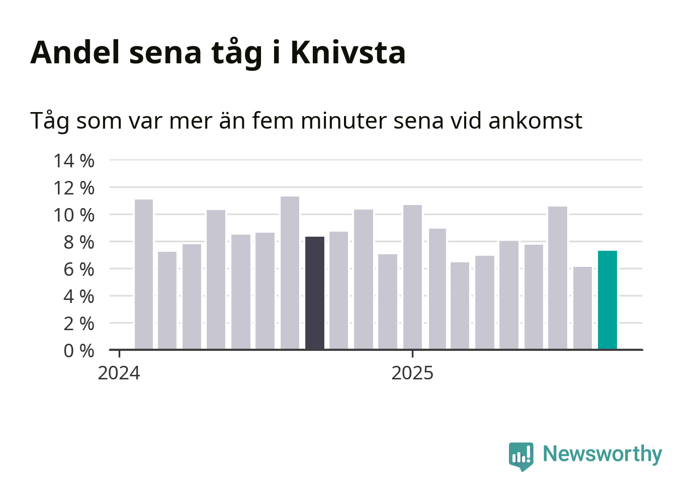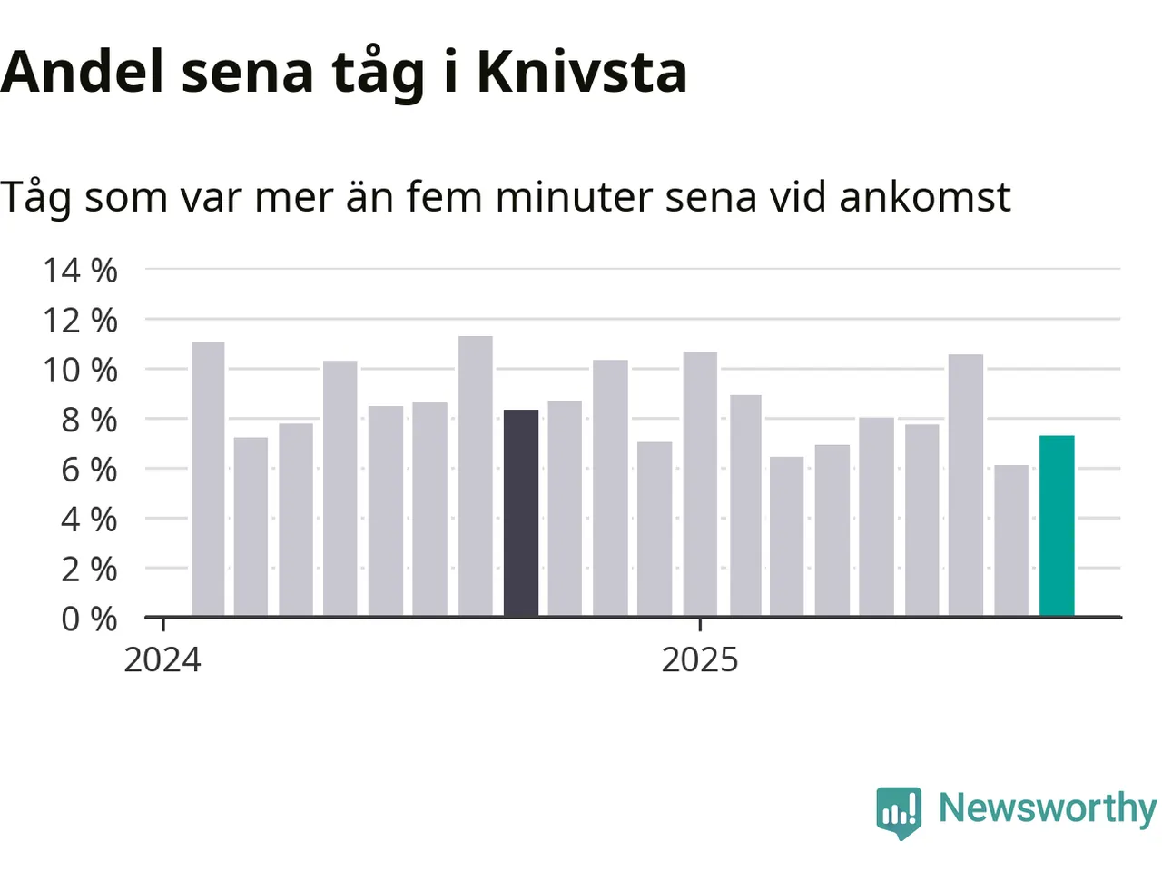 Sju procent kan jämföras med sex procent månaden innan, och åtta procent i september 2024. Siffrorna bygger på realtidsinformation om tågavgångar och ankomster från Trafikverket, som Newsworthy löpande samlar in.