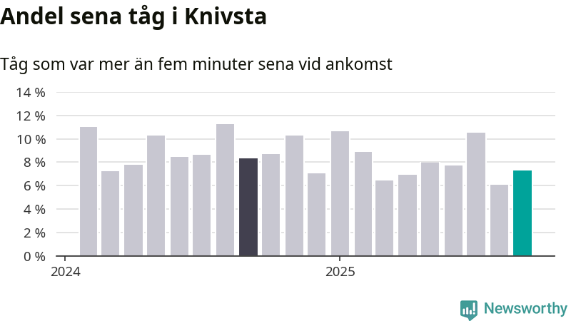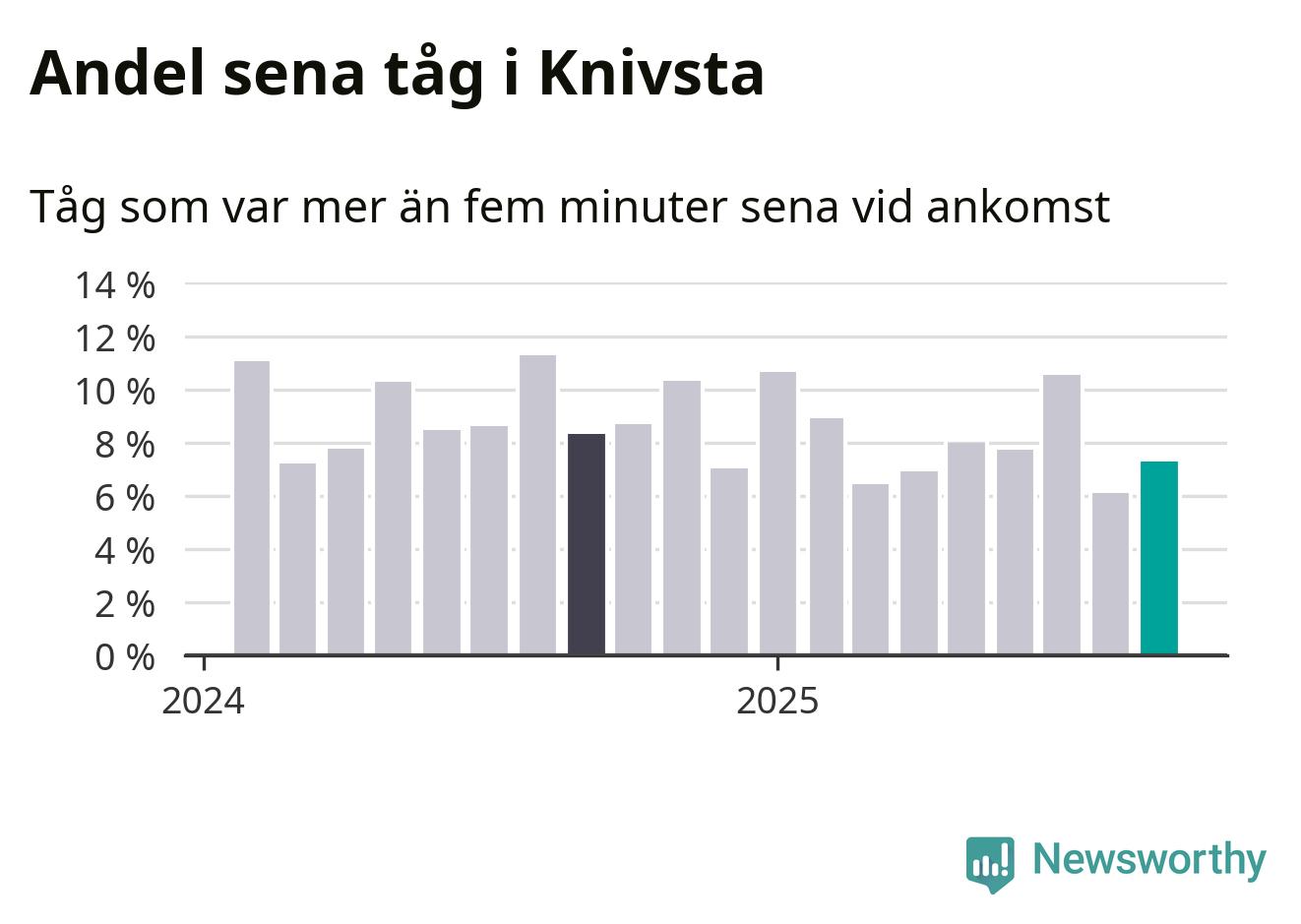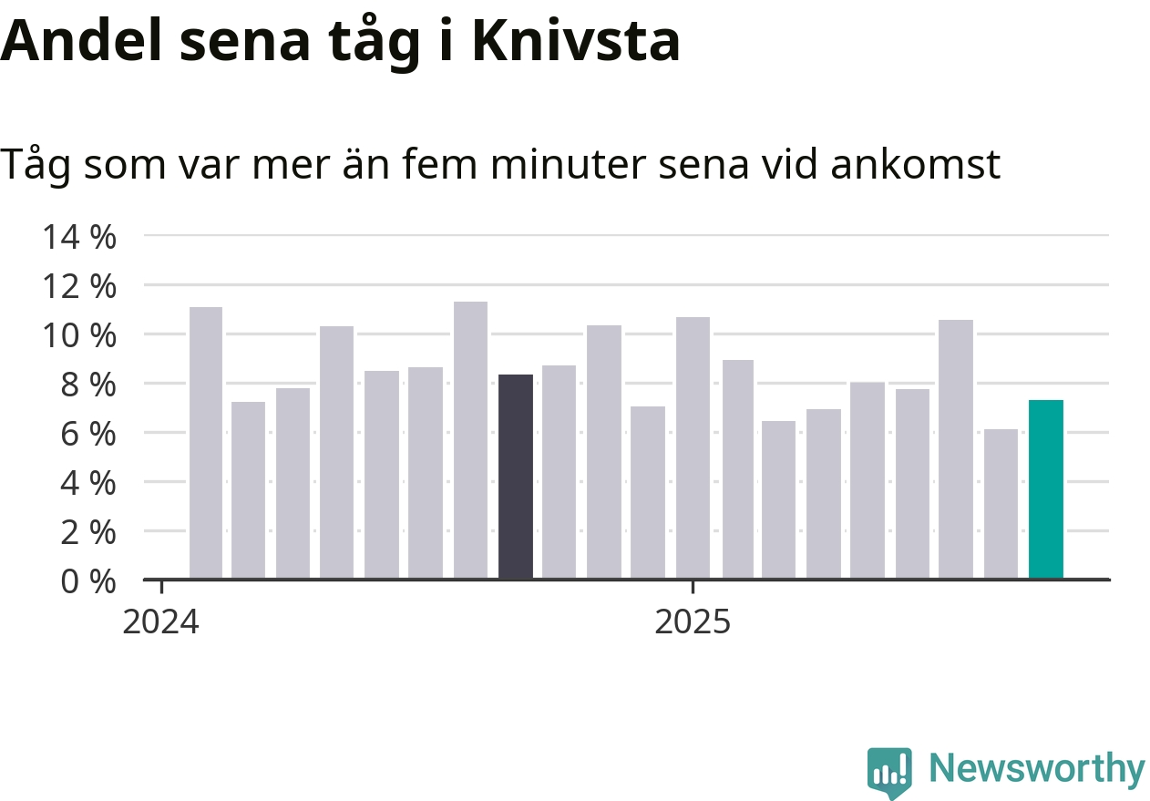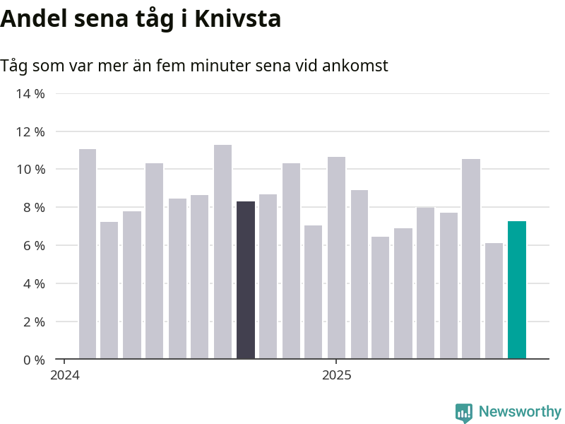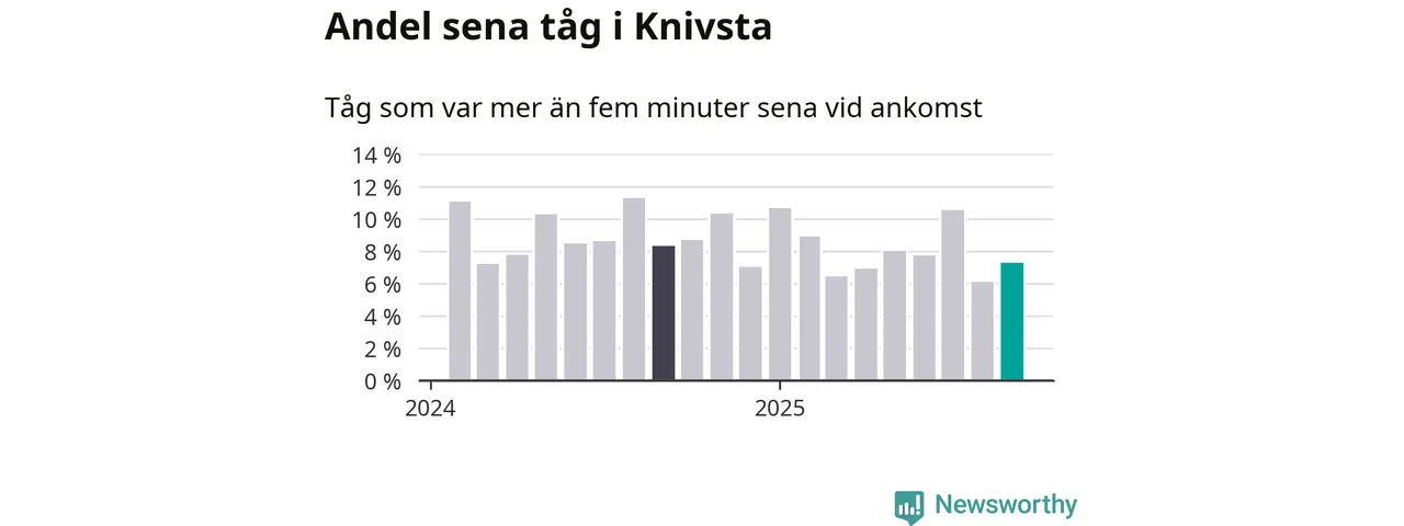 Sju procent kan jämföras med sex procent månaden innan, och åtta procent i september 2024. Siffrorna bygger på realtidsinformation om tågavgångar och ankomster från Trafikverket, som Newsworthy löpande samlar in.