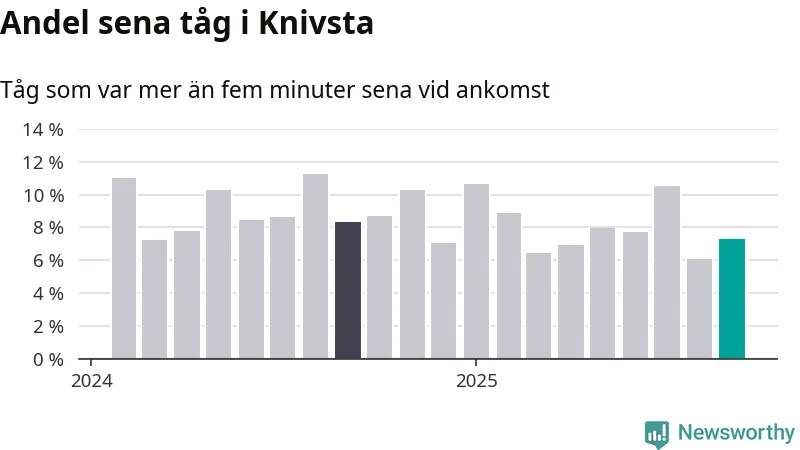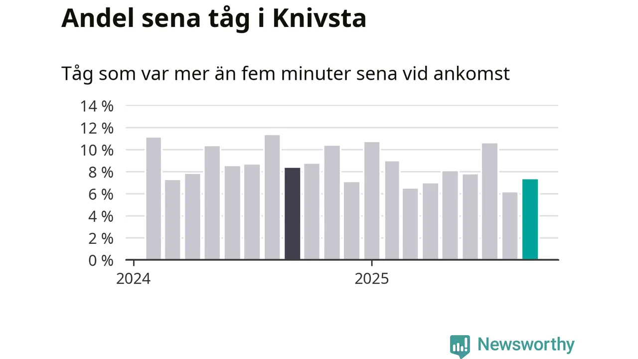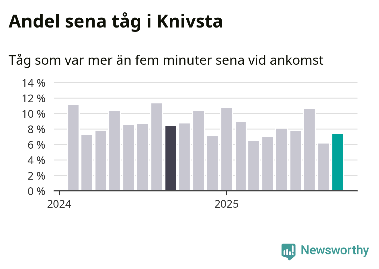 Av omkring 4 700 tåg som passerade Knivsta station i september var 341 mer än fem minuter sena. Det motsvarar 7 procent, en bit över den nationella målsättningen som säger att inte mer än fem procent av tågen ska vara sena.