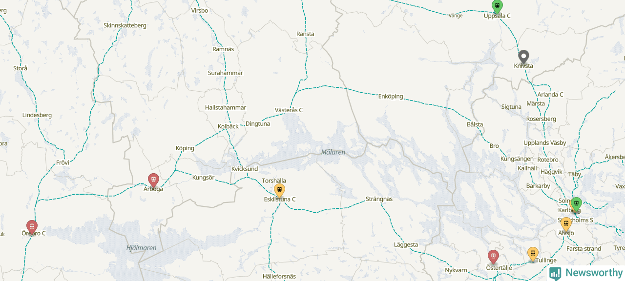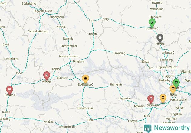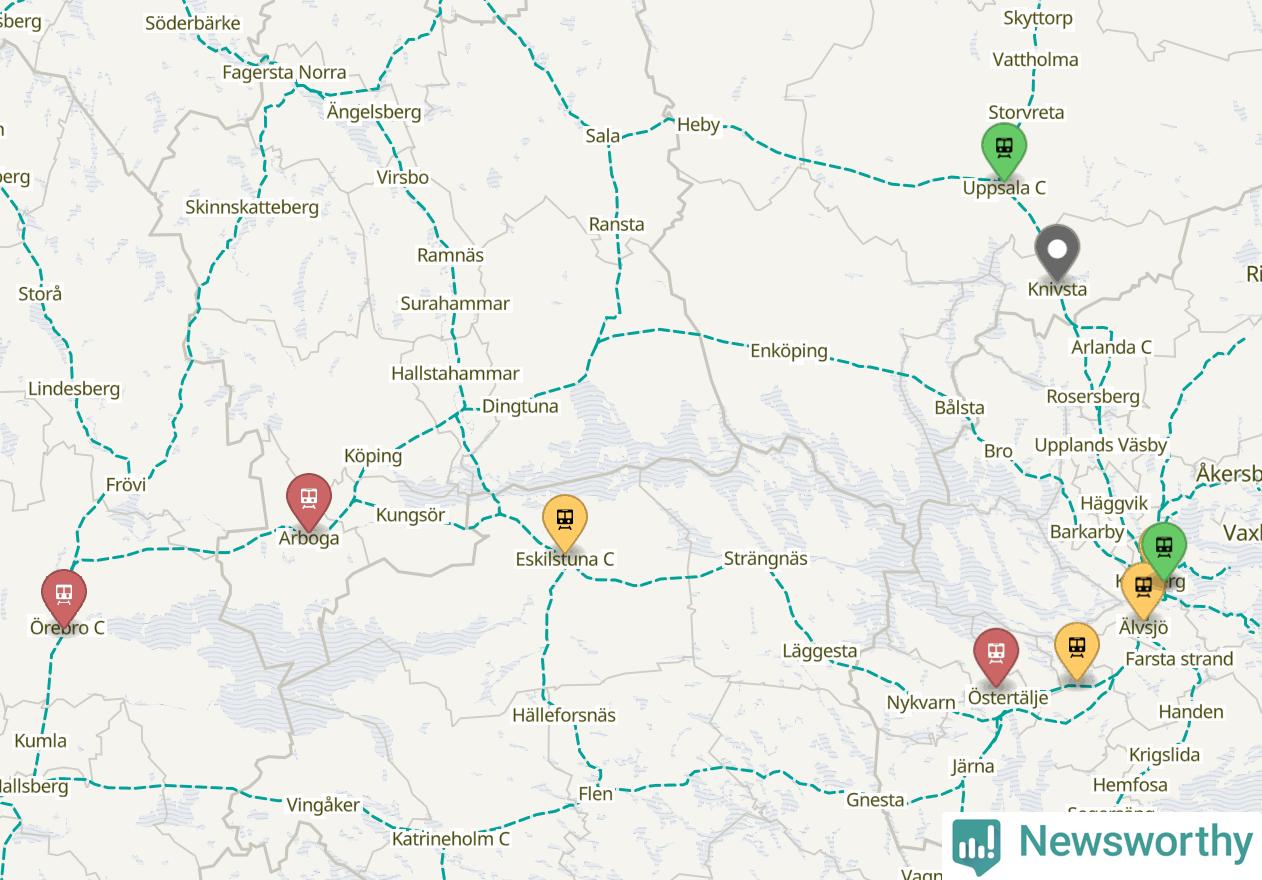 Som försenat räknas ett tåg när det varit minst fem minuter sent vid ankomst till stationerna i Knivsta kommun.