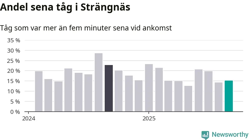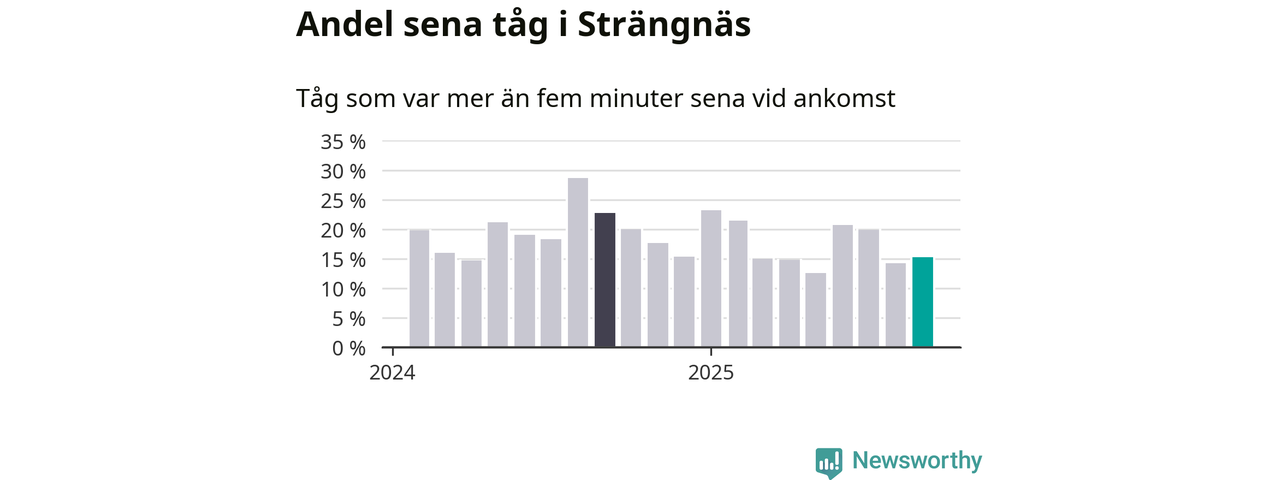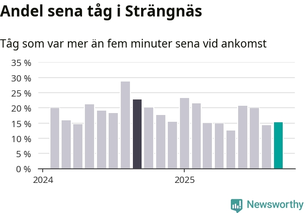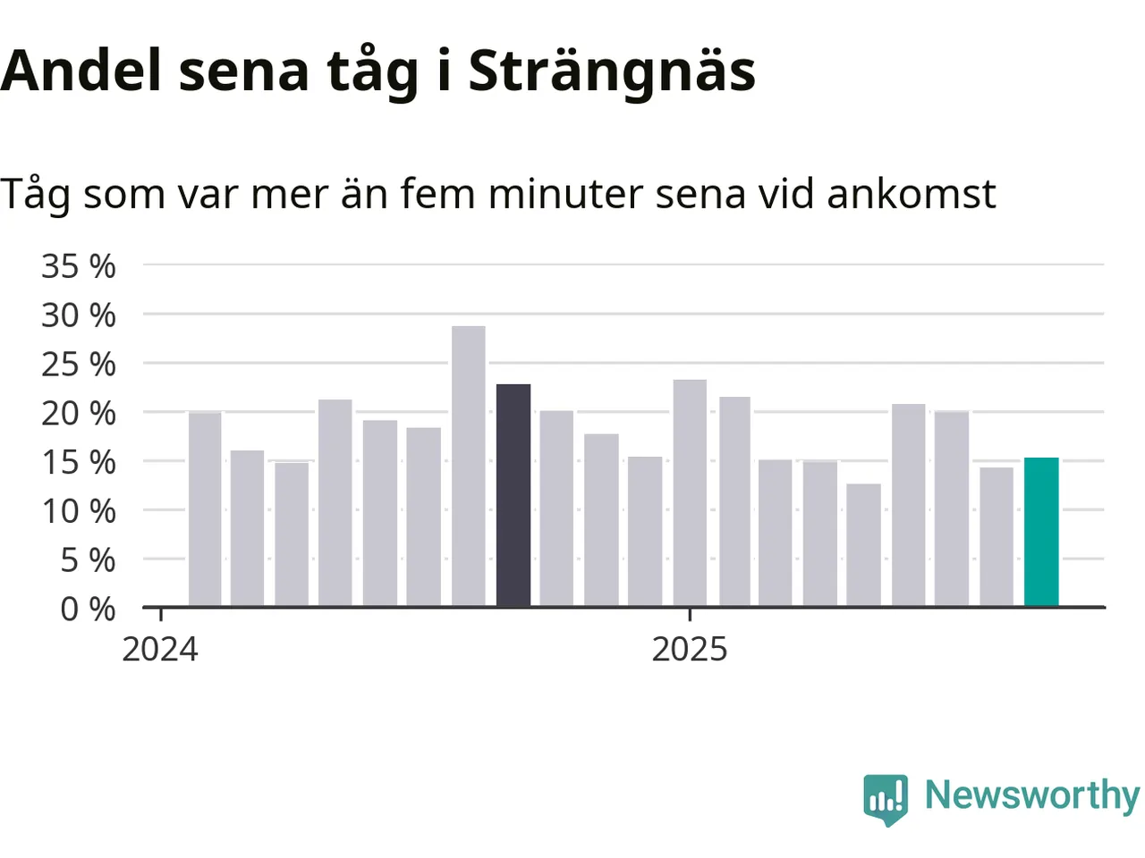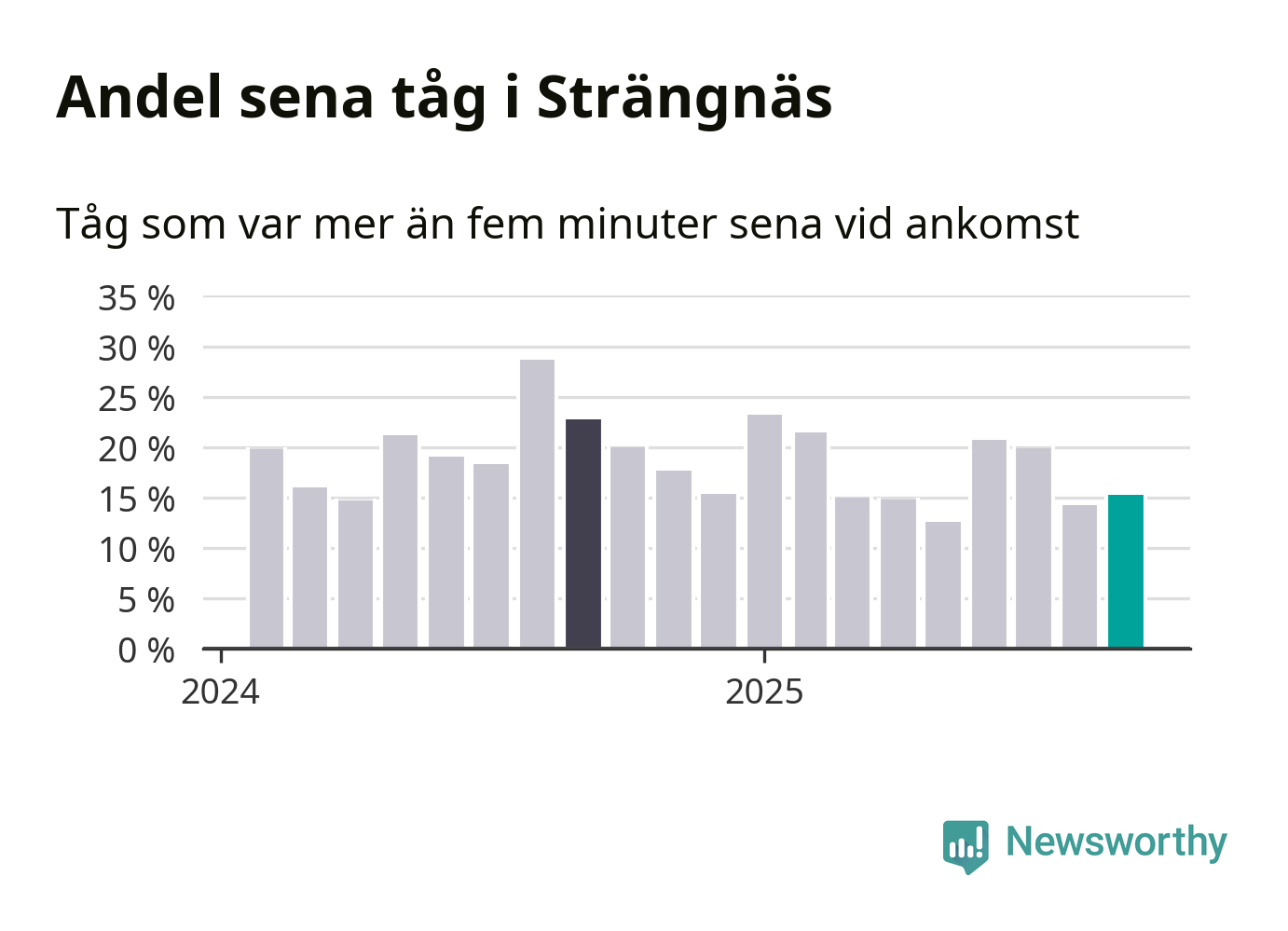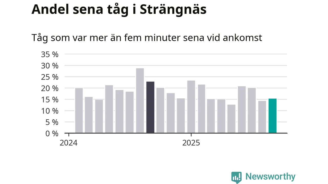 15 procent kan jämföras med 14 procent månaden innan, och 23 procent i september 2024. Siffrorna bygger på realtidsinformation om tågavgångar och ankomster från Trafikverket, som Newsworthy löpande samlar in.
