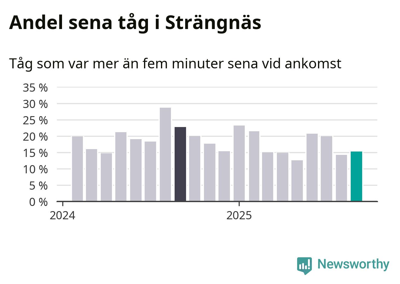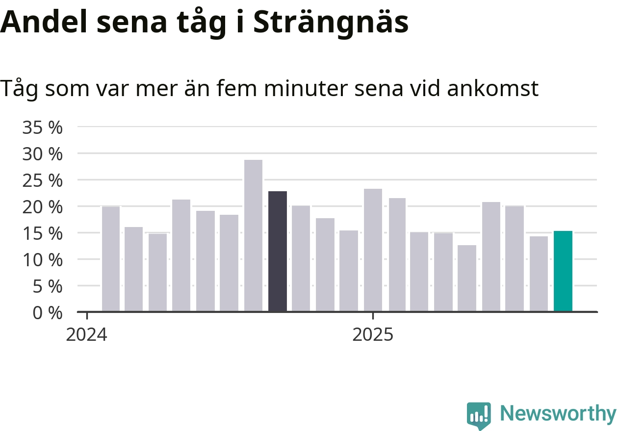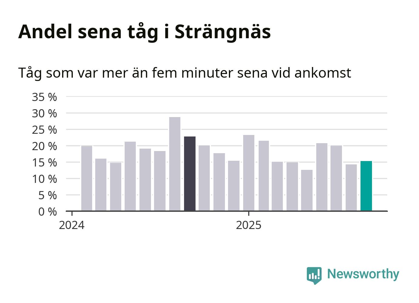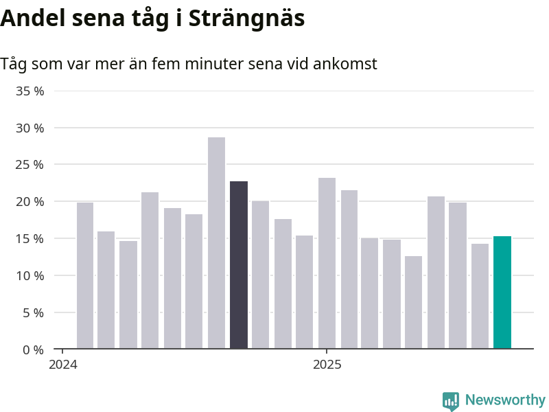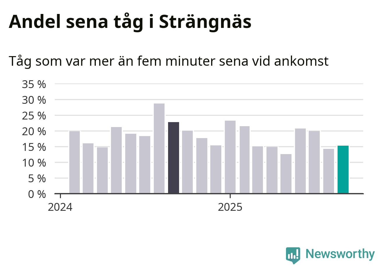 15 procent kan jämföras med 14 procent månaden innan, och 23 procent i september 2024. Siffrorna bygger på realtidsinformation om tågavgångar och ankomster från Trafikverket, som Newsworthy löpande samlar in.