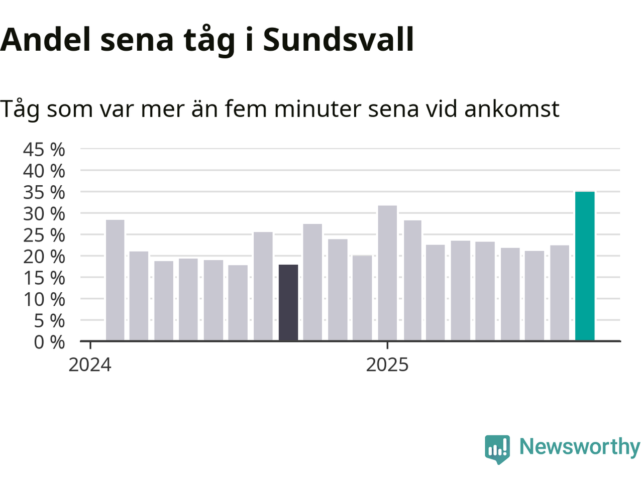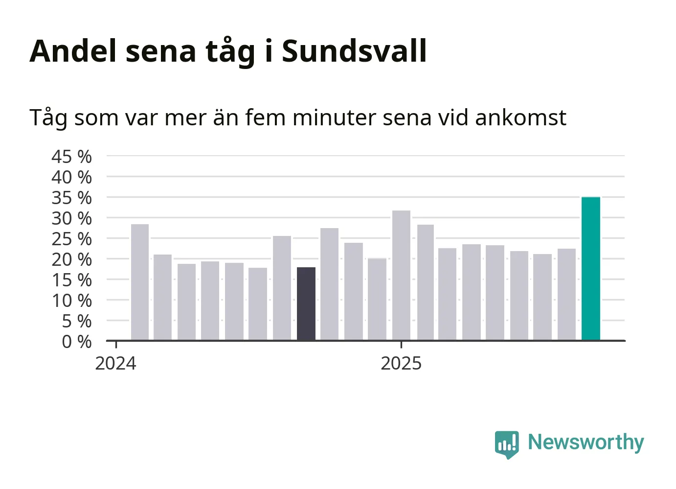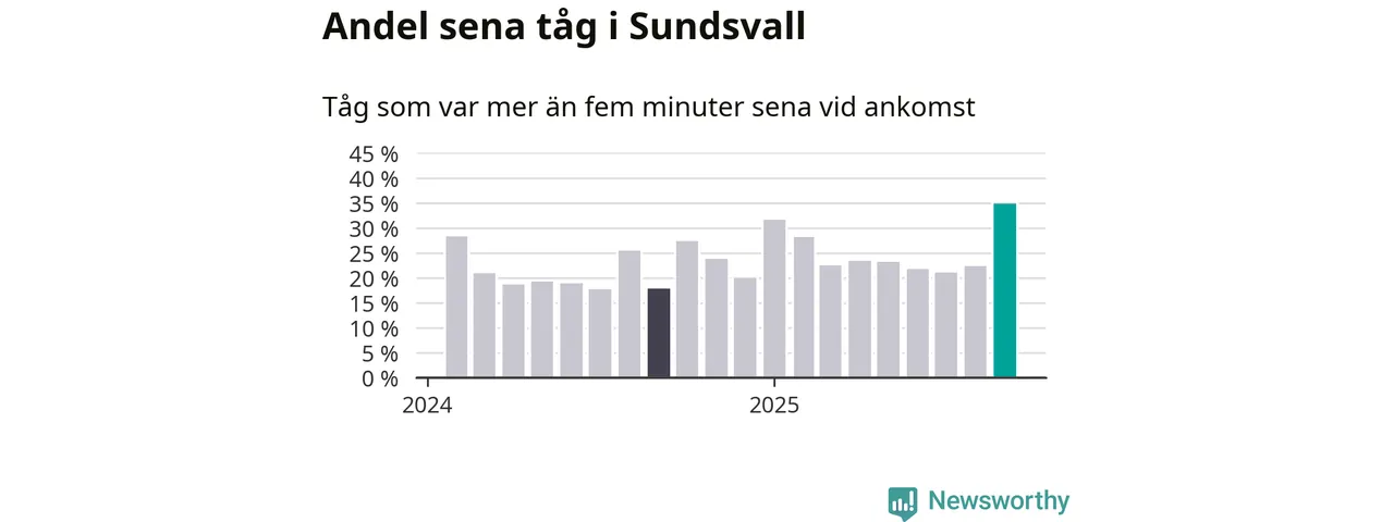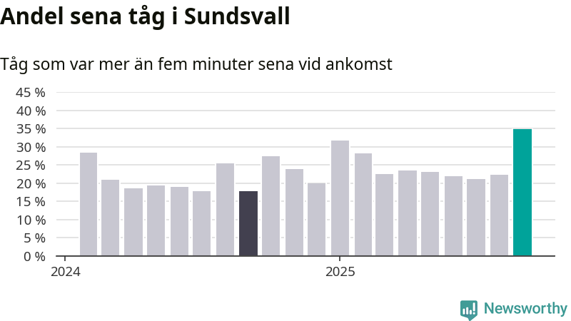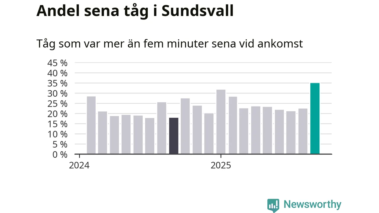35 procent är den högsta andelen sena tåg sedan åtminstone den hårt förseningsdrabbade vintern 2023/24. Siffrorna bygger på realtidsinformation om tågavgångar och ankomster från Trafikverket, som Newsworthy löpande samlar in.