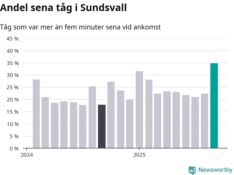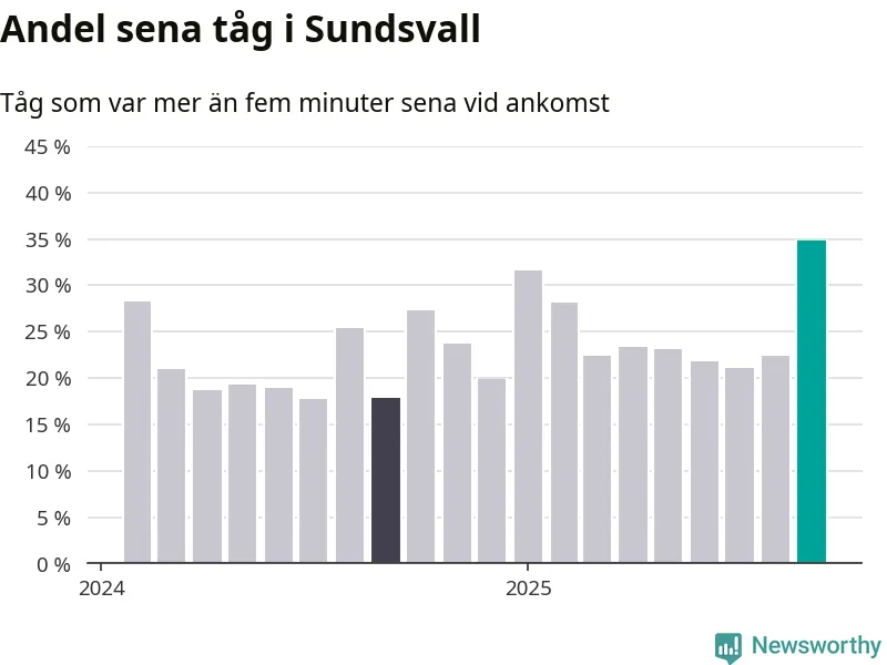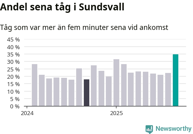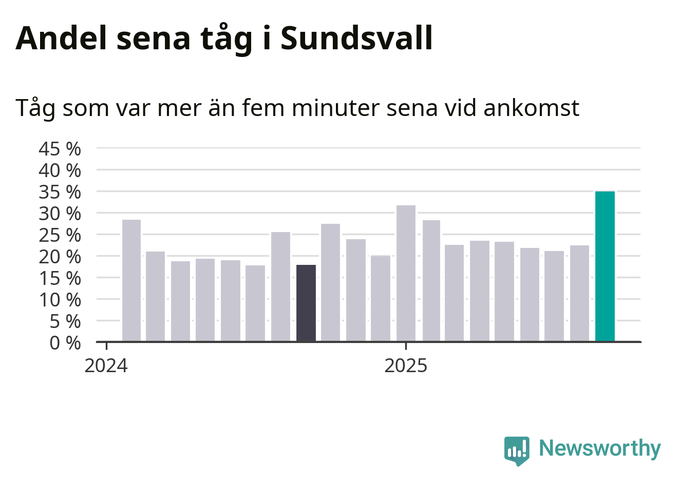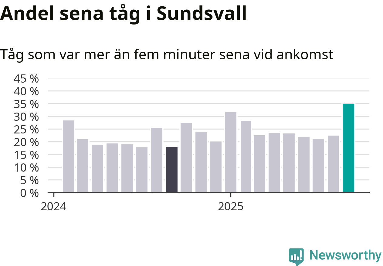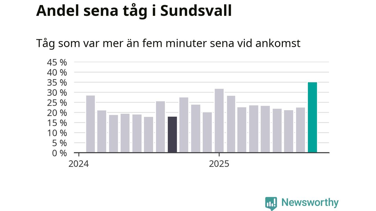 35 procent är den högsta andelen sena tåg sedan åtminstone den hårt förseningsdrabbade vintern 2023/24. Siffrorna bygger på realtidsinformation om tågavgångar och ankomster från Trafikverket, som Newsworthy löpande samlar in.